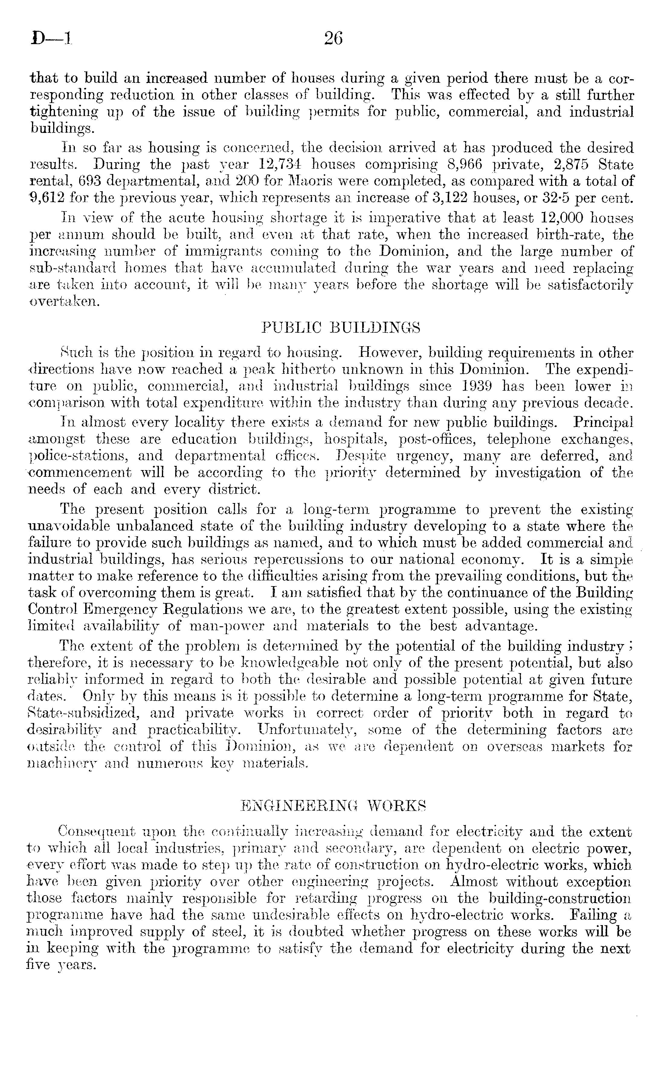 that to build an increased number of houses during a given period there must be a corresponding reduction in other classes of building. This was effected by a still further tightening up of the issue of building permits for public, commercial, and industrial buildings. In so far as housing is concerned, the decision arrived at has produced the desired results. During the past year 12,734 houses comprising 8,966 private, 2,875 State rental, 693 departmental, and 200 for Maoris were completed, as compared with a total of 9,612 for the previous year, which represents an increase of 3,122 houses, or 32-5 per cent. In view of the acute housing shortage it is imperative that at least 12,000 houses per annum should be built, and even at that rate, when the increased birth-rate, the increasing number of immigrants coming to the Dominion, and the large number of sub-standard homes that have accumulated during the war years and need replacing are taken into account, it will be many years before the shortage will be satisfactorily overtaken. PUBLIC BUILDINGS Such is the position in regard to housing. However, building requirements in other ■directions have now reached a peak hitherto unknown in this Dominion. The expenditure on public, commercial, and industrial buildings since 1939 has been lower in comparison, with total expenditure within the industry than during any previous decade. In almost every locality there exists a demand for new public buildings. Principal amongst these are education buildings, hospitals, post-offices, telephone exchanges, police-stations, and departmental offices. Despite urgency, many are deferred, and •commencement will be according to the priority determined by investigation of the needs of each and every district. The present position calls for a long-term programme to prevent the existing unavoidable unbalanced state of the building industry developing to a state where the failure to provide such buildings as named, and to which must be added commercial and industrial buildings, has serious repercussions to our national economy. It is a simple matter to make reference to the difficulties arising from the prevailing conditions, but the task of overcoming them is great. lam satisfied that by the continuance of the Building Control Emergency Regulations we are, to the greatest extent possible, using the existing limited availability of man-power and materials to the best advantage. The extent of the problem is determined by the potential of the building industry I therefore, it is necessary to be knowledgeable not only of the present potential, but also reliably informed in regard to both the desirable and possible potential at given future dates. Only by this means is it possible to determine a long-term programme for State, State-subsidized, and private works in correct order of priority both in regard to desirability and practicability. Unfortunately, some of the determining factors are outside the control of this Dominion, as we are dependent on overseas markets for machinery and numerous key materials. ENGINEERING WORKS Consequent upon the continually increasing demand for electricity and the extent to which all local industries, primary and secondary, are dependent on electric power, every effort was made to step up the rate of construction on hydro-electric works, which have been given priority over other engineering projects. Almost without exception those factors mainly responsible for retarding progress on the building-construction programme have had the same undesirable effects on hydro-electric works. Failing a much improved supply of steel, it is doubted whether progress on these works will be in keeping with the programme to satisfy the demand for electricity during the next five years.