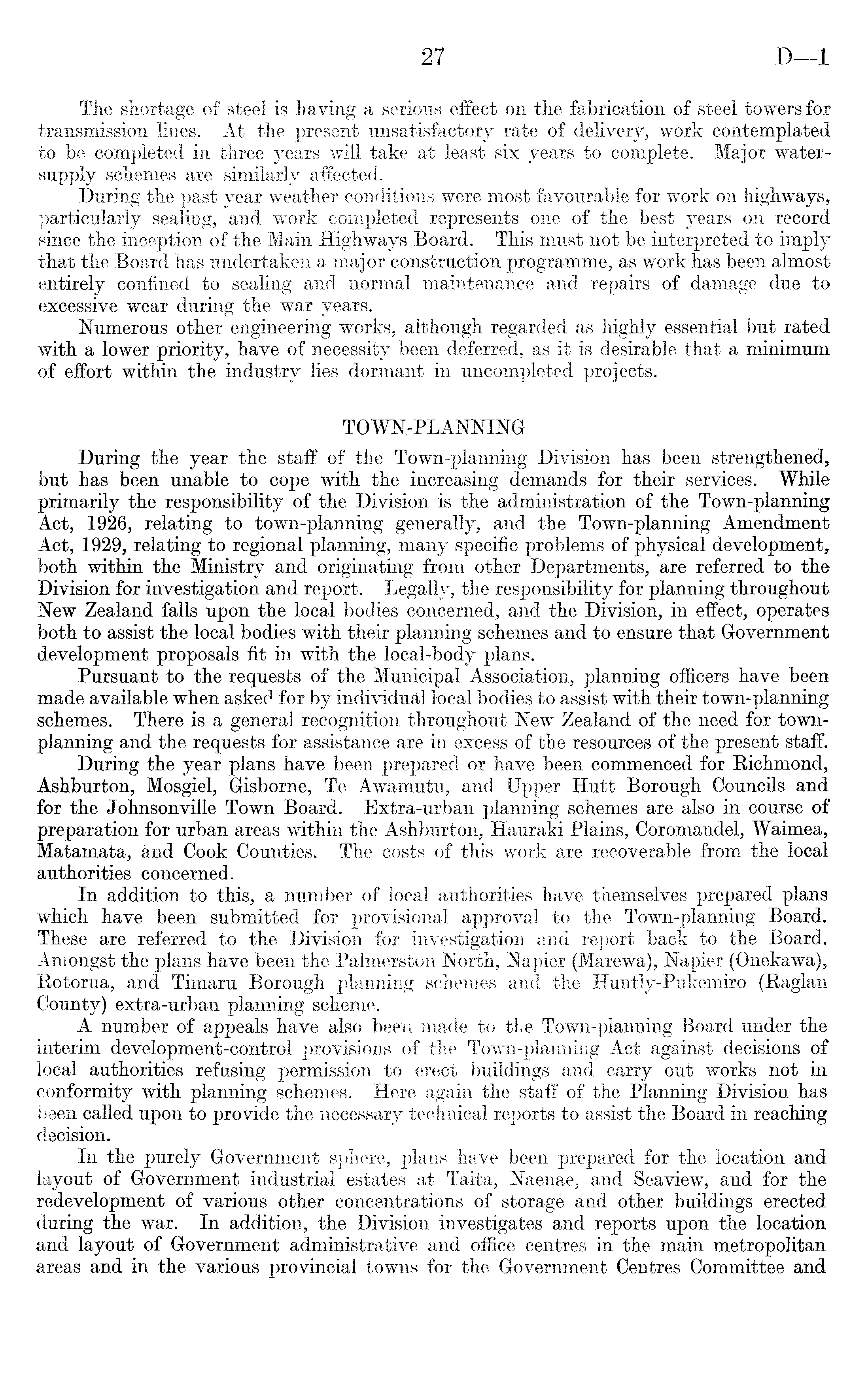 The shortage of steel is having a serious effect on the fabrication of steel towers for transmission lines. At the present unsatisfactory rate of delivery, work contemplated to be completed in three years will take at least six years to complete. Major watersupply schemes are similarly affected. During the past year weather conditions were most favourable for work on highways, particularly sealing, and work completed represents one of the best years on record since the inception of the Main Highways Board. This must not be interpreted to imply that the Board has undertaken a major construction programme, as work has been almost entirely confined to sealing and normal maintenance and repairs of damage due to excessive wear during the war years. Numerous other engineering works, although regarded as highly essential but rated with a lower priority, have of necessity been deferred, as it is desirable that a minimum of effort within the industry lies dormant in uncompleted projects. TOWN-PLANNING During the year the staff of the Town-planning Division has been strengthened, but has been unable to cope with the increasing demands for their services. While primarily the responsibility of the Division is the administration of the Town-planning Act, 1926, relating to town-planning generally, and the Town-planning Amendment Act, 1929, relating to regional planning, many specific problems of physical development, both within the Ministry and originating from other Departments, are referred to the Division for investigation and report. Legally, the responsibility for planning throughout New Zealand falls upon the local bodies concerned, and the Division, in effect, operates both to assist the local bodies with their planning schemes and to ensure that Government development proposals fit in with the local-body plans. Pursuant to the requests of the Municipal Association, planning officers have been made available when askec 1 for by individual local bodies to assist with their town-planning schemes. There is a general recognition throughout New Zealand of the need for townplanning and the requests for assistance are in excess of the resources of the present staff. During the year plans have been prepared or have been commenced for Richmond, Ashburton, Mosgiel, Gisborne, Te Awamutu, and Upper Hutt Borough Councils and for the Johnsonville Town Board. Extra-urban planning schemes are also in course of preparation for urban areas within the Ashburton, Hauraki Plains, Coromandel, Waimea, Matamata, and Cook Counties. The costs of this work are recoverable from the local authorities concerned. In addition to this, a number of local authorities have themselves prepared plans which have been submitted for provisional approval to the Town-planning Board. These are referred to the Division for investigation and report back to the Board. Amongst the plans have been the Palmerston North, Napier (Marewa), Napier (Onekawa), Rotorua, and Timaru Borough planning schemes and the Huntly-Pukemiro (Raglan County) extra-urban planning scheme: A number of appeals have also been made to the Town-planning Board under the interim development-control provisions of the Town-planning Act against decisions of local authorities refusing permission to erect buildings and carry out works not in conformity with planning schemes. Here again the staff of the Planning Division has been called upon to provide the necessary technical reports to assist the Board in reaching decision. In the purely Government sphere, plans have been prepared for the location and layout of Government industrial estates at Taita, Naenae, and Seaview, and for the redevelopment of various other concentrations of storage and other buildings erected during the war. In addition, the Division investigates and reports upon the location and layout of Government administrative and office centres in the main metropolitan areas and in the various provincial towns for the Government Centres Committee and