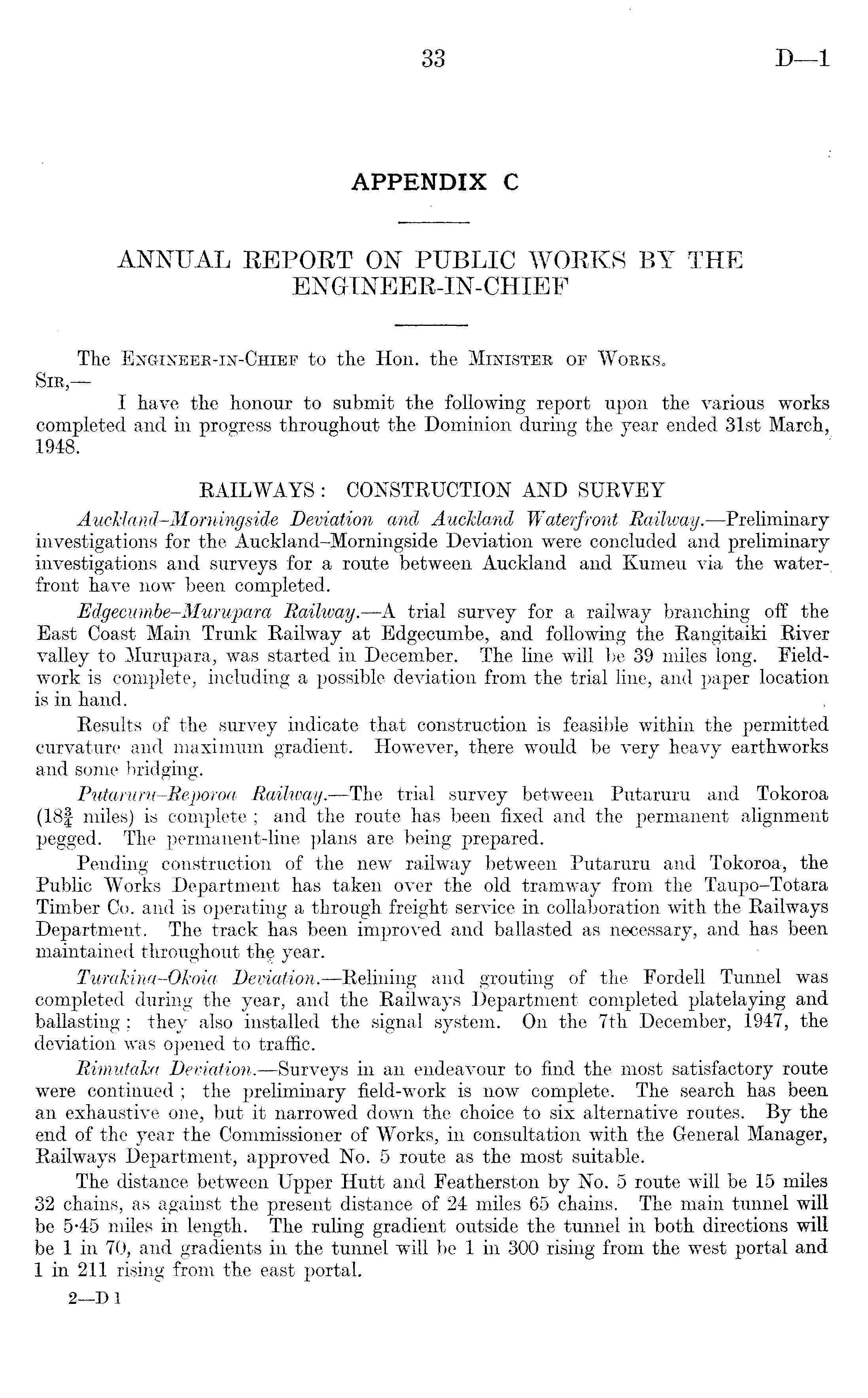 APPENDIX C ANNUAL REPORT ON PUBLIC WORKS BY THE ENGINEER-IN-CHIEF The Engineer-in-Chief to the Hon. the Minister of Works. Sir, — I have the honour to submit the following report upon the various works completed and in progress throughout the Dominion during the year ended 31st March, 1948. RAILWAYS : CONSTRUCTION AND SURVEY Auckland-Morning side Deviation and Auckland Waterfront Railivay. —Preliminary investigations for the Auckland-Morningside Deviation were concluded and preliminary investigations and surveys for a route between Auckland and Kumeu via the water- ; front have now been completed. Edgecumbe-Murupara Railway. —A trial survey for a railway branching off the East Coast Main Trunk Railway at Edgecumbe, and following the Rangitaiki River valley to Murupara, was started in December. The line will be 39 miles long. Fieldwork is complete, including a possible deviation from the trial line, and paper location is in hand. Results of the survey indicate that construction is feasible within the permitted curvature and maximum gradient. However, there would be very heavy earthworks and some bridging. Putaruru-Rejporoa Railway. —The trial survey between Putaruru and Tokoroa (18f miles) is complete ; and the route has been fixed and the permanent alignment pegged. The permanent-line plans are being prepared. Pending construction of the new railway between Putaruru and Tokoroa, the Public Works Department has taken over the old tramway from the Taupo-Totara Timber Co. and is operating a through freight service in collaboration with the Railways Department. The track has been improved and ballasted as necessary, and has been maintained throughout the year. Turakina-Okoia Deviation.—Relming and grouting of the Fordell Tunnel was completed during the year, and the Railways Department completed platelaying and ballasting ; they also installed the signal system. On the 7th December, 1947, the deviation was opened to traffic. Rimutaka Deviation. —Surveys in an endeavour to find the most satisfactory route were continued ; the preliminary field-work is now complete. The search has been an exhaustive one, but it narrowed down the choice to six alternative routes. By the end of the year the Commissioner of Works, in consultation with the General Manager, Railways Department, approved No. 5 route as the most suitable. The distance between Upper Hutt and Featherston by No. 5 route will be 15 miles 32 chains, as against the present distance of 24 miles 65 chains. The main tunnel will be 5*45 miles in length. The ruling gradient outside the tunnel in both directions will be 1 in 70, and gradients in the tunnel will be 1 in 300 rising from the west portal and 1 in 211 rising from the east portal. 2—D 1
