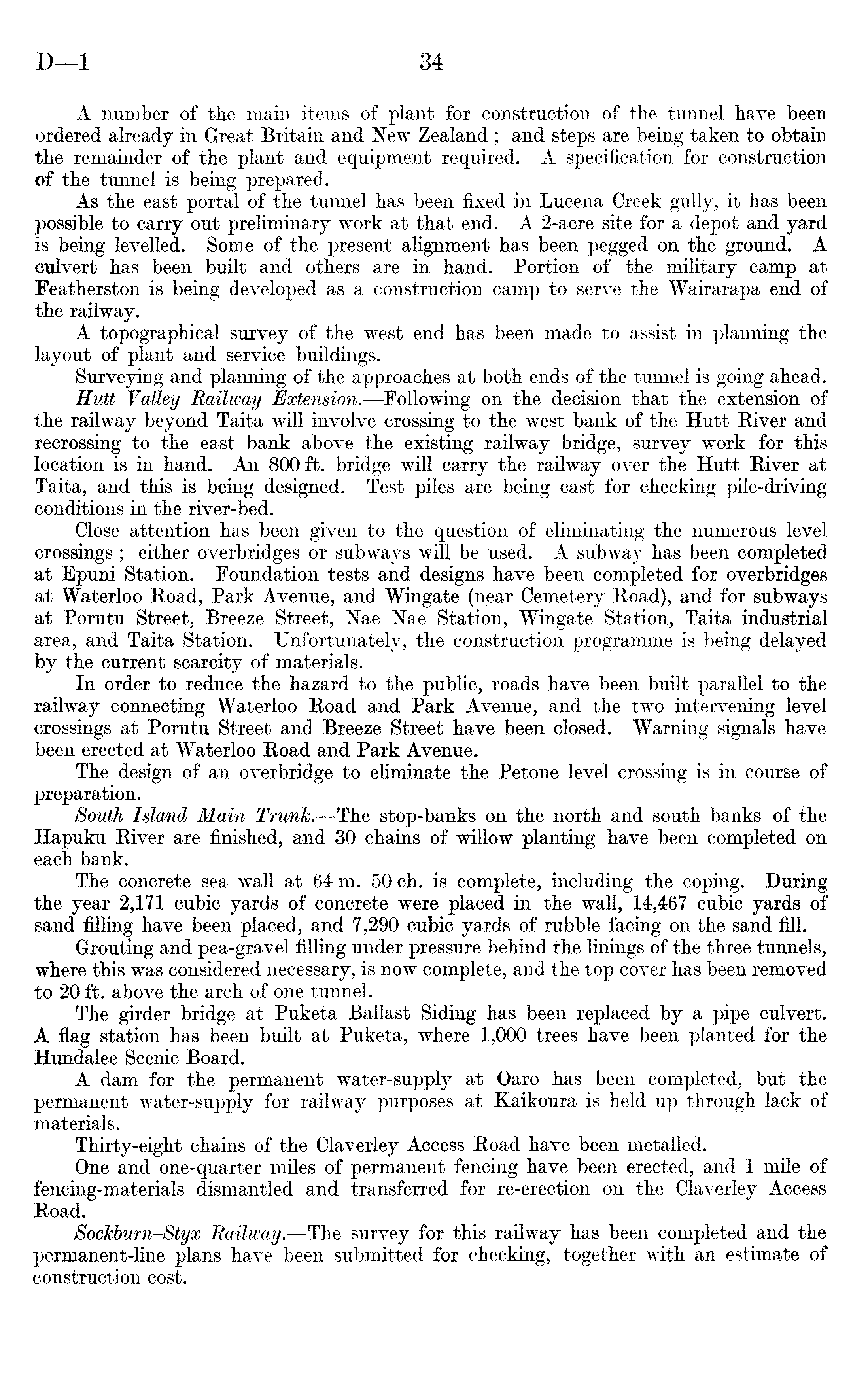 A number of the main items of plant for construction of the tunnel have been ordered already in Great Britain and New Zealand ; and steps are being taken to obtain the remainder of the plant and equipment required. A specification for construction of the tunnel is being prepared. As the east portal of the tunnel has been fixed in Lucena Creek gully, it has been possible to carry out preliminary work at that end. A 2-acre site for a depot and yard is being levelled. Some of the present alignment has been pegged on the ground. A culvert has been built and others are in hand. Portion of the military camp at Featherston is being developed as a construction camp to serve the Wairarapa end of the railway. A topographical survey of the west end has been made to assist in planning the layout of plant and service buildings. Surveying and planning of the approaches at both ends of the tunnel is going ahead. Hutt Valley Railway Extension. —Following on the decision that the extension of the railway beyond Taita will involve crossing to the west bank of the Hutt River and recrossing to the east bank above the existing railway bridge, survey work for this location is in hand. An 800 ft. bridge will carry the railway over the Hutt River at Taita, and this is being designed. Test piles are being cast for checking pile-driving conditions in the river-bed. Close attention has been given to the question of eliminating the numerous level crossings ; either overbridges or subways will be used. A subway has been completed at Epuni Station. Foundation tests and designs have been completed for overbridges at Waterloo Road, Park Avenue, and Wingate (near Cemetery Road), and for subways at Porutu Street, Breeze Street, Nae Nae Station, Wingate Station, Taita industrial area, and Taita Station. Unfortunately, the construction programme is being delayed by the current scarcity of materials. In order to reduce the hazard to the public, roads have been built parallel to the railway connecting Waterloo Road and Park Avenue, and the two intervening level crossings at Porutu Street and Breeze Street have been closed. Warning signals have been erected at Waterloo Road and Park Avenue. The design of an overbridge to eliminate the Petone level crossing is in course of preparation. South Island Main Trunk.—The stop-banks on the north and south banks of the Hapuku River are finished, and 30 chains of willow planting have been completed on each bank. The concrete sea wall at 64 m. 50 ch. is complete, including the coping. During the year 2,171 cubic yards of concrete were placed in the wall, 14,467 cubic yards of sand filling have been placed, and 7,290 cubic yards of rubble facing on the sand fill. Grouting and pea-gravel filling under pressure behind the linings of the three tunnels, where this was considered necessary, is now complete, and the top cover has been removed to 20 ft. above the arch of one tunnel. The girder bridge at Puketa Ballast Siding has been replaced by a pipe culvert. A flag station has been built at Puketa, where 1,000 trees have been planted for the Hundalee Scenic Board. A dam for the permanent water-supply at Oaro has been completed, but the permanent water-supply for railway purposes at Kaikoura is held up through lack of materials. Thirty-eight chains of the Claverley Access Road have been metalled. One and one-quarter miles of permanent fencing have been erected, and 1 mile of fencing-materials dismantled and transferred for re-erection on the Claverley Access Road. Sockburn-Styx Railway. —The survey for this railway has been completed and the permanent-line plans have been submitted for checking, together with an estimate of construction cost.