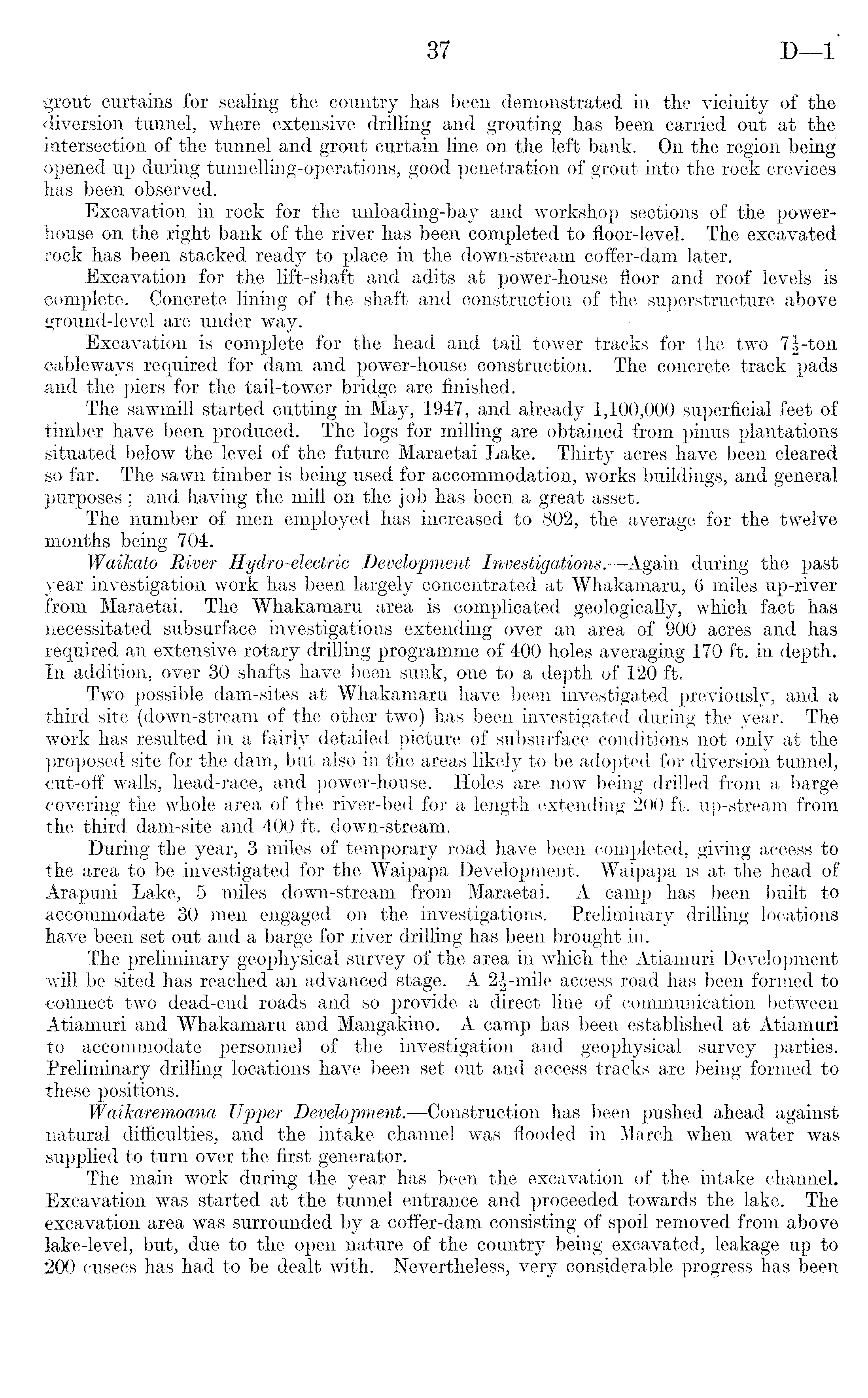 grout curtains for sealing the country has been demonstrated in the vicinity of the diversion tunnel, where extensive drilling and grouting has been carried out at the intersection of the tunnel and grout curtain line on the left bank. On the region being opened up during tunnelling-operations, good penetration of grout into the rock crevices has been observed. Excavation in rock for the unloading-bay and workshop sections of the powerhouse on the right bank of the river has been completed to floor-level. The excavated rock has been stacked ready to place in the down-stream coffer-dam later. Excavation for the lift-shaft and adits at power-house floor and roof levels is complete. Concrete lining of the shaft and construction of the superstructure above ground-level are under way. Excavation is complete for the head and tail tower tracks for the two 7^-ton cableways required for dam and power-house construction. The concrete track pads and the piers for the tail-tower bridge are finished. The sawmill started cutting in May, 1947, and already 1,100,000 superficial feet of timber have been produced. The logs for milling are obtained from pinus plantations situated below the level of the future Maraetai Lake. Thirty acres have been cleared so far. The sawn timber is being used for accommodation, works buildings, and general purposes ; and having the mill on the job has been a great asset. The number of men employed has increased to 802, the average for the twelve months being 704. Waikato River Hydro-electric Development Investigations.—Again during the past year investigation work has been largely concentrated at Whakaraaru, 6 miles up-river from Maraetai. The Whakamaru area is complicated geologically, which fact has necessitated subsurface investigations extending over an area of 900 acres and has required an extensive rotary drilling programme of 400 holes averaging 170 ft. in depth. In addition, over 30 shafts have been sunk, one to a depth of 120 ft. Two possible dam-sites at Whakamaru have been investigated previously, and a third site (down-stream of the other two) has been investigated during the year. The work has resulted in a fairly detailed picture of subsurface conditions not only at the proposed site for the dam, but also in the areas likely to be adopted for diversion tunnel, cut-off walls, head-race, and power-house. Holes are now being drilled from a barge covering the whole area of the river-bed for a length extending 200 ft. up-stream from the third dam-site and 400 ft. down-stream. During the year, 3 miles of temporary road have been completed, giving access to the area to be investigated for the Waipapa Development. Waipapa is at the head of Arapuni Lake, 5 miles down-stream from Maraetai. A camp has been built to accommodate 30 men engaged on the investigations. Preliminary drilling locations have been set out and a barge for river drilling has been brought in. The preliminary geophysical survey of the area in which the Atiamuri Development will be sited has reached an advanced stage. A 2|-mile access road has been formed to connect two dead-end roads and so provide a direct line of communication between Atiamuri and Whakamaru and Mangakino. A camp has been established at Atiamuri to accommodate personnel of the investigation and geophysical survey parties. Preliminary drilling locations have been set out and access tracks are being formed to these positions. Waikaremoana Upper Development.—Construction has been pushed ahead against natural difficulties, and the intake channel was flooded in March when water was supplied to turn over the first generator. The main work during the year has been the excavation of the intake channel. Excavation was started at the tunnel entrance and proceeded towards the lake. The excavation area was surrounded by a coffer-dam consisting of spoil removed from above lake-level, but, due to the open nature of the country being excavated, leakage up to 200 cusecs has had to be dealt with. Nevertheless, very considerable progress has been