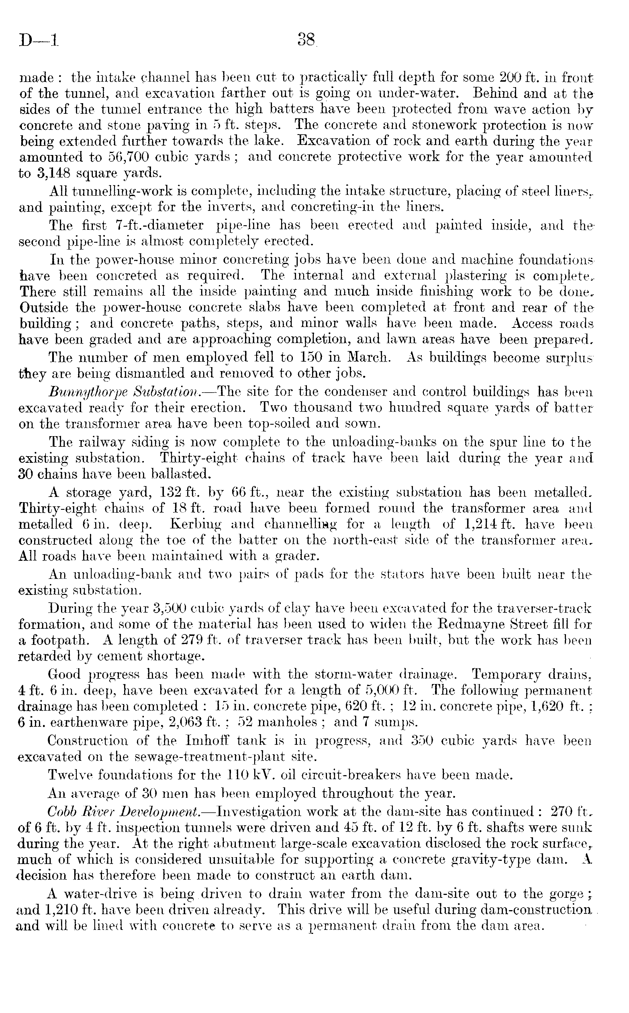 made : the intake channel has been cut to practically full depth for some 200 ft. in front of the tunnel, and excavation farther out is going on under-water. Behind and at the sides of the tunnel entrance the high batters have been protected from wave action by concrete and stone paving in 5 ft. steps. The concrete and stonework protection is now being extended further towards the lake. Excavation of rock and earth during the year amounted to 56,700 cubic yards; and concrete protective work for the year amounted to 3,148 square yards. All tunnelling-work is complete, including the intake structure, placing of steel liners,, and painting, except for the inverts, and concreting-in the liners. The first 7-ft.-diameter pipe-line has been erected and painted inside, and thesecond pipe-line is almost completely erected. In the power-house minor concreting jobs have been done and machine foundations have been concreted as required. The internal and external plastering is complete. There still remains all the inside painting and much inside finishing work to be done. Outside the power-house concrete slabs have been completed at front and rear of the building; and concrete paths, steps, and minor walls have been made. Access roads have been graded and are approaching completion, and lawn areas have been prepared. The number of men employed fell to 150 in March. As buildings become surplus: they are being dismantled and removed to other jobs. Bunnythorpe Substation. —The site for the condenser and control buildings has been excavated ready for their erection. Two thousand two hundred square yards of batter on the transformer area have been top-soiled and sown. The railway siding is now complete to the unloading-banks on the spur line to the existing substation. Thirty-eight chains of track have been laid during the year and 30 chains have been ballasted. A storage yard, 132 ft. by 66 ft., near the existing substation has been metalled. Thirty-eight chains of 18 ft. road have been formed round the transformer area and metalled 6 in. deep. Kerbing and channelling for a length of 1,214 ft. have been constructed along the toe of the batter on the north-east side of the transformer area. All roads have been maintained with a grader. An unloading-bank and two pairs of pads for the stators have been built near the existing substation. During the year 3,500 cubic yards of clay have been excavated for the traverser-track formation, and some of the material has been used to widen the Redmayne Street fill for a footpath. A length of 279 ft. of traverser track has been built, but the work has been retarded by cement shortage. Good progress has been made with the storm-water drainage. Temporary drains, 4 ft. 6 in. deep, have been excavated for a length of 5,000 ft. The following permanent drainage has been completed : 15 in. concrete pipe, 620 ft.; 12 in. concrete pipe, 1,620 ft. ; 6 in. earthenware pipe, 2,063 ft. ; 52 manholes ; and 7 sumps. Construction of the Imhoff tank is in progress, and 350 cubic yards have been excavated on the sewage-treatment-plant site. Twelve foundations for the 110 kV. oil circuit-breakers have been made. An average of 30 men has been employed throughout the year. Cobb River Development.—lnvestigation work at the dam-site has continued : 270 ft, of 6 ft. by 4 ft. inspection tunnels were driven and 45 ft. of 12 ft. by 6 ft. shafts were sunk during the year. At the right abutment large-scale excavation disclosed the rock surface,, much of which is considered unsuitable for supporting a concrete gravity-type dam. A decision has therefore been mad# to construct an earth dam. A water-drive is being .driven to drain water from the dam-site out to the gorge; and 1,210 ft. have been driven already. This drive will be useful during dam-construction and will be lined with concrete to serve as a permanent drain from the dam area.