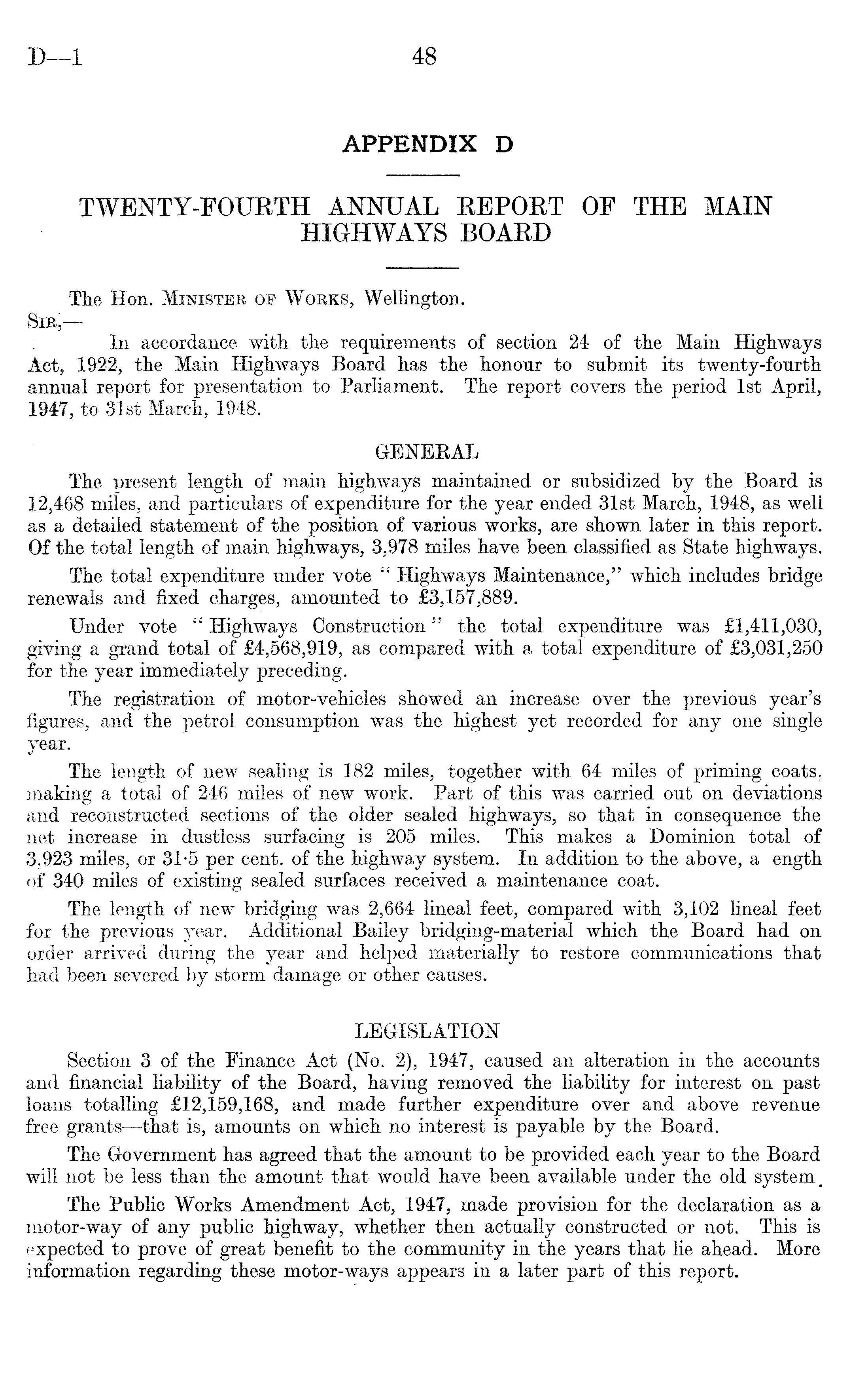 APPENDIX D TWENTY-FOURTH ANNUAL REPORT OF THE MAIN HIGHWAYS BOARD The Hon. Minister of Works, Wellington. Sir, — In accordance with the requirements of section 24 of the Main Highways Act, 1922, the Main Highways Board has the honour to submit its twenty-fourth annual report for presentation to Parliament. The report covers the period Ist April, 1947, to 31st March, 1948. GENERAL The present length of main highways maintained or subsidized by the Board is 12,468 miles, and particulars of expenditure for the year ended 31st March, 1948, as well as a detailed statement of the position of various works, are shown later in this report. Of the total length of main highways, 3,978 miles have been classified as State highways. The total expenditure under vote " Highways Maintenance," which includes bridge renewals and fixed charges, amounted to £3,157,889. Under vote " Highways Construction" the total expenditure was £1,411,030, giving a grand total of £4,568,919, as compared with a total expenditure of £3,031,250 for the year immediately preceding. The registration of motor-vehicles showed an increase over the previous year's figures, and the petrol consumption was the highest yet recorded for any one single year. The length of new sealing is 182 miles, together with 64 miles of priming coats, making a total of 246 miles -of new work. Part of this was carried out on deviations and reconstructed sections of the older sealed highways, so that in consequence the net increase in dustless surfacing is 205 miles. This makes a Dominion total of 3,923 miles, or 31-5 per cent, of the highway system. In addition to the above, a ength of 340 miles of existing sealed surfaces received a maintenance coat. The length of new bridging was 2,664 lineal feet, compared with 3,102 lineal feet for the previous year. Additional Bailey bridging-material which the Board had on order arrived during the year and helped materially to restore communications that had been severed by storm damage or other causes. LEGISLATION Section 3 of the Finance Act (No. 2), 1947, caused an alteration in the accounts and financial liability of the Board, having removed the liability for interest on past loans totalling £12,159,168, and made further expenditure over and above revenue free grants —that is, amounts on which no interest is payable by the Board. The Government has agreed that the amount to be provided each year to the Board will not be less than the amount that would have been available under the old system. The Public Works Amendment Act, 1947, made provision for the declaration as a motor-way of any public highway, whether then actually constructed or not. This is expected to prove of great benefit to the community in the years that lie ahead. More information regarding these motor-ways appears in a later part of this report.