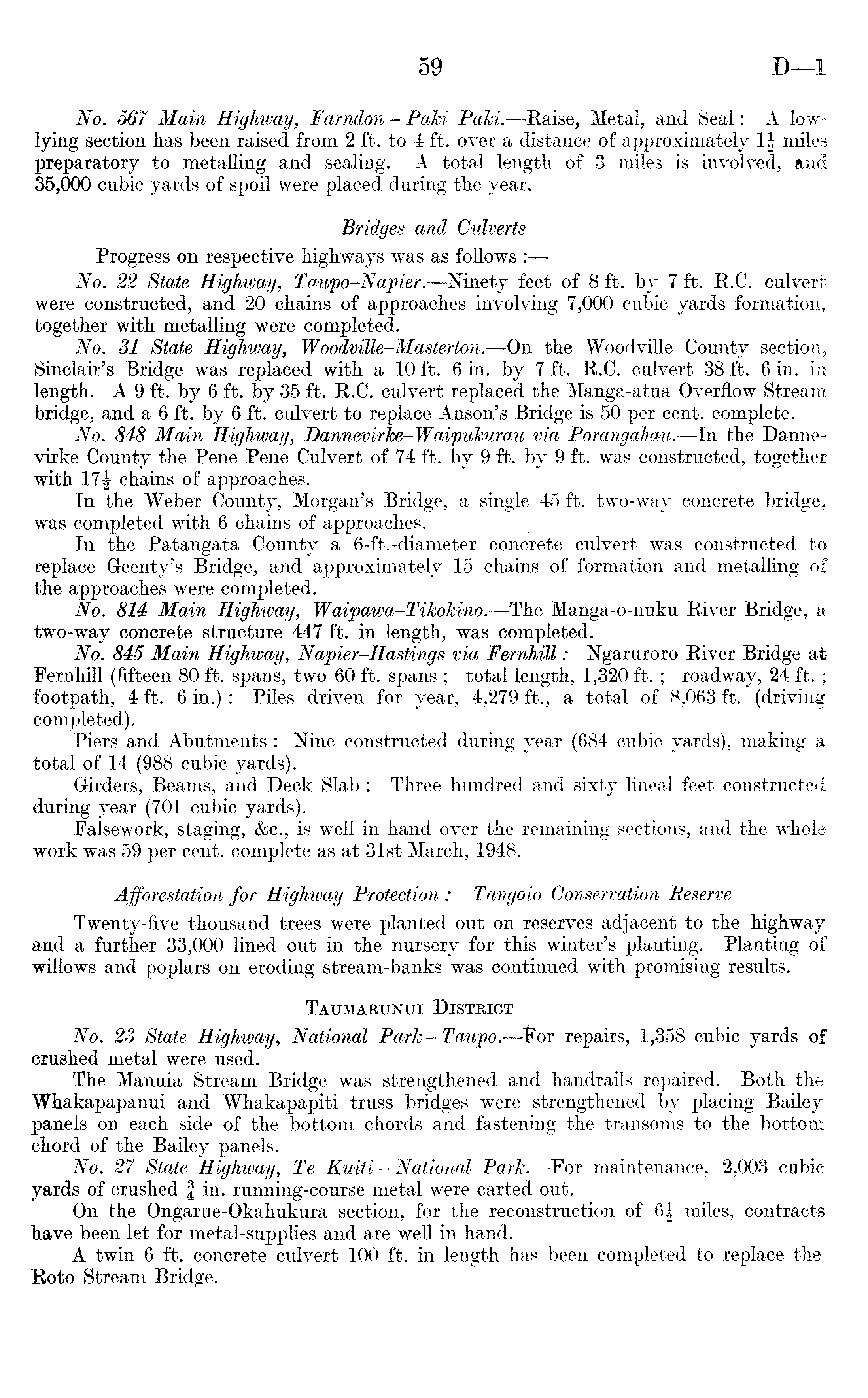 No. 567 Main Higlnvay, Farndon - Paki Paki. —Raise, Metal, and Seal: A lowlying section has been raised from 2 ft. to 4 ft. over a distance of approximately li miles preparatory to metalling and sealing. A total length of 3 miles is involved, and 35,000 cubic yards of spoil were placed during the year. Bridges and Culverts Progress on respective highways was as follows : No. 22 State Highway, Tawpo-Napier. —Ninety feet of 8 ft. by 7 ft. R.C. culvert were constructed, and 20 chains of approaches involving 7,000 cubic yards formation, together with metalling were completed. No. 31 State Highway, Woodville-Masterton. —On the Woodville County section, Sinclair's Bridge was replaced with a 10 ft. 6 in. by 7 ft. R.C. culvert 38 ft. 6 in. in length. A 9 ft. by 6 ft. by 35 ft. R.C. culvert replaced the Manga-atua Overflow Stream bridge, and a 6 ft. by 6 ft. culvert to replace Anson's Bridge is 50 per cent, complete. No. 848 Main Highway, DannevirJce-WaipuJcurau via Porangahau.—ln the Dannevirke County the Pene Pene Culvert of 74 ft. by 9 ft. by 9 ft. was constructed, together with 17£ chains of approaches. In the Weber County, Morgan's Bridge, a single 45 ft. two-way concrete bridge, was completed with 6 chains of approaches. In the Patangata County a 6-ft.-diameter concrete culvert was constructed to replace Geenty's Bridge, and approximately 15 chains of formation and metalling of the approaches were completed. No. 814 Main Highway, Waipawa-Tikokino. —The Manga-o-nuku River Bridge, a two-way concrete structure 447 ft. in length, was completed. No. 845 Main Highway, Napier-Hastings via Fernhill: Ngaruroro River Bridge at Fernhill (fifteen 80 ft. spans, two 60 ft. spans ; total length, 1,320 ft.; roadway, 24 ft.; footpath, 4 ft. 6 in.) : Piles driven for year, 4,279 ft., a total of 8,063 ft. (driving completed). Piers and Abutments : Nine constructed during year (684 cubic yards), making a total of 14 (988 cubic yards). Girders, Beams, and Deck Slab : Three hundred and sixty lineal feet constructed during year (701 cubic yards). Falsework, staging, &c., is well in hand over the remaining sections, and the whole work was 59 per cent, complete as at 31st March, 1948. Afforestation for Highway Protection : Tangoio Conservation Reserve Twenty-five thousand trees were planted out on reserves adjacent to the highway and a further 33,000 lined out in the nursery for this winter's planting. Planting of willows and poplars on eroding stream-banks was continued with promising results. Taumartjnui District No. 23 State Highway, National Park-Taupo.—For repairs, 1,358 cubic yards of crushed metal were used. The Manuia Stream Bridge was strengthened and handrails repaired. Both the Whakapapanui and Whakapapiti truss bridges were strengthened by placing Bailey panels on each side of the bottom chords and fastening the transoms to the bottom chord of the Bailey panels. No. 27 State Highway, Te Kuiti - National Park.—For maintenance, 2,003 cubic yards of crushed § in. running-course metal were carted out. On the Ongarue-Okahukura section, for the reconstruction of 6| miles, contracts have been let for metal-supplies and are well in hand. A twin 6 ft. concrete culvert 100 ft. in length has been completed to replace the Roto Stream Bridge.