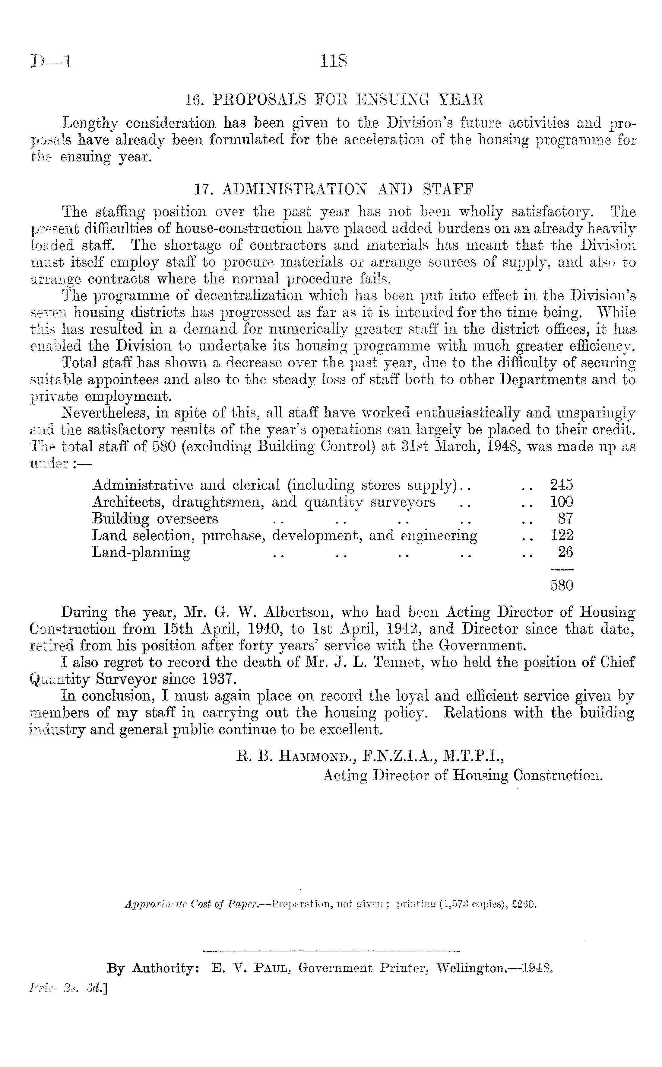 16. PROPOSALS FOR ENSUING YEAR Lengthy consideration lias been given to the Division's future activities and proposals have already been formulated for the acceleration of the housing programme for the ensuing year. 17. ADMINISTRATION AND STAFF The staffing position over the past year has not been wholly satisfactory. The present difficulties of house-construction have placed added burdens on an already heavily loaded staff. The shortage of contractors and materials has meant that the Division must itself employ staff to procure materials or arrange sources of supply, and also to arrange contracts where the normal procedure fails. The programme of decentralization which has been put into effect in the Division's seven housing districts has progressed as far as it is intended for the time being. While this has resulted in a demand for numerically greater staff in the district offices, it has enabled the Division to undertake its housing programme with much greater efficiency. Total staff has shown a decrease over the past year, due to the difficulty of securing suitable appointees and also to the steady loss of staff both to other Departments and to private employment. Nevertheless, in spite of this, all staff have worked enthusiastically and unsparingly and the satisfactory results of the year's operations can largely be placed to their credit. The total staff of 580 (excluding Building Control) at 31st March, 1948, was made up asunder : Administrative and clerical (including stores supply).. .. 245 Architects, draughtsmen, and quantity surveyors .. .. 100 Building overseers .. .. .. .. 87 Land selection, purchase, development, and engineering .. 122 Land-planning .. .. .. .. 26 580 During the year, Mr. G. W. Albertson, who had been Acting Director of Housing Construction from 15th April, 1940, to Ist April, 1942, and Director since that date, retired from his position after forty years' service with the Government. I also regret to record the death of Mr. J. L. Tennet, who held the position of Chief Quantity Surveyor since 1937. In conclusion, I must again place on record the loyal and efficient service given by members of my staff in carrying out the housing policy. Relations with the building industry and general public continue to be excellent. R. B. Hammond., F.N.Z.1.A., M.T.P.1., Acting Director of Housing Construction.