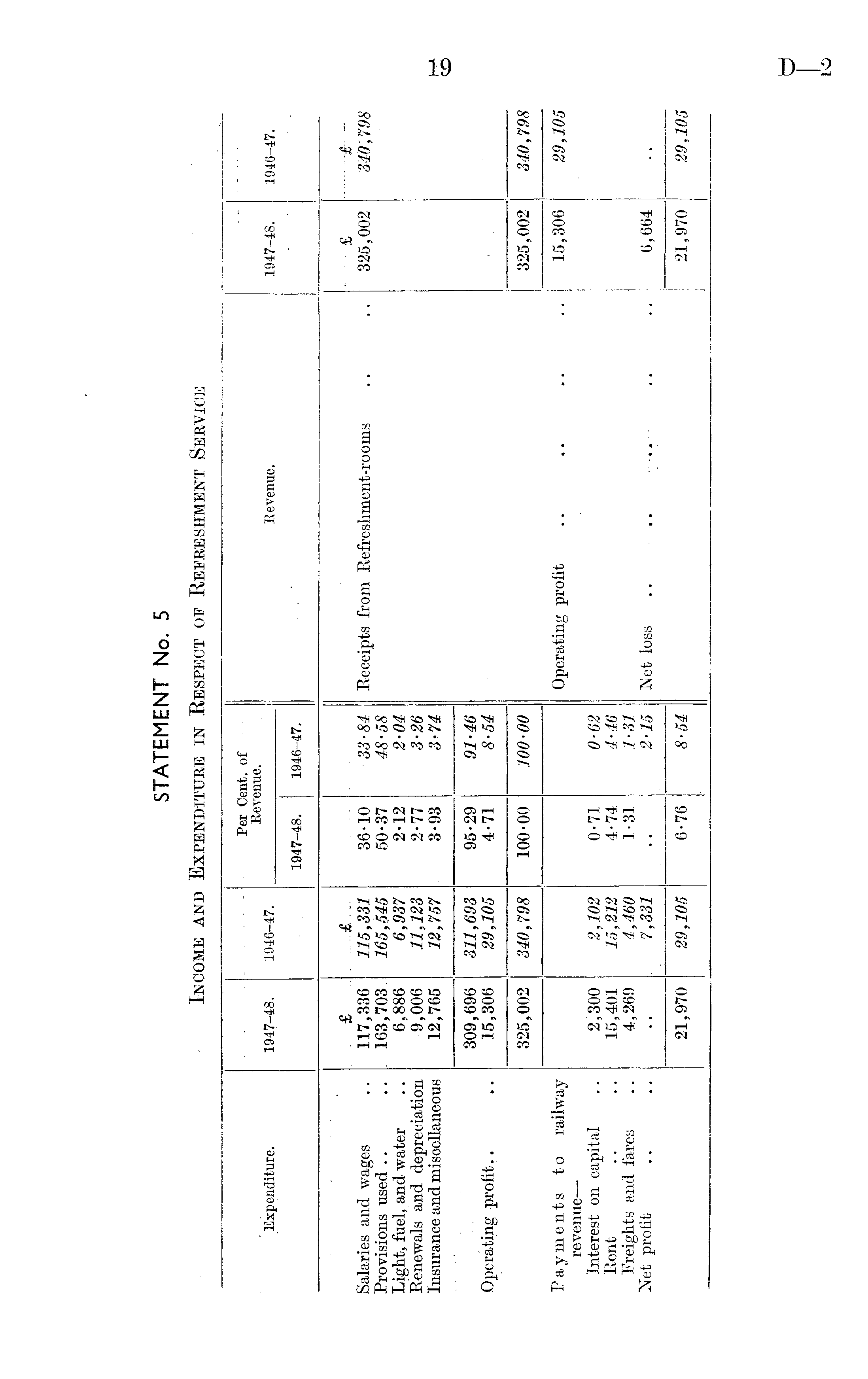 Expenditure. 1947-48. 1946-47. Per-Gent, of Revenue. Revenue. 1947-48. 1946-47. 1947-48. 1946-47. Salaries and wages Provisions used Light, fuel, and water Renewals and depreciation Insurance and miscellaneous £ ... 117,336 163,703 6,886 9,006 12,765 £ ... 115,331 165,545 6,937 11,123 12,757 36-10 50-37 2-12 2-77 3-93 33-84 48-58 2-04 3-26 3>74 Receipts from Refreshment-rooms £ 325, 002 £ - 340,798 Operating profit 309,696 15,306 311,693 29,105 95-29 4-71 91-46 8-54 325,002 340,798 100-00 100-00 325,002 340,798 Payments to railwayrevenue — Interest on capital Rent Freights, and fares Net profit 2,300 15,401 4,269 2,102 15,212 4,460 7,331 0-71 4-74 1-31 0-62 4-46 1-31 2-15 Operating profit Net loss .. *» •- 15,306 6,664 29,105 21,970 29,105 6-76 8-54 21,970 29,105