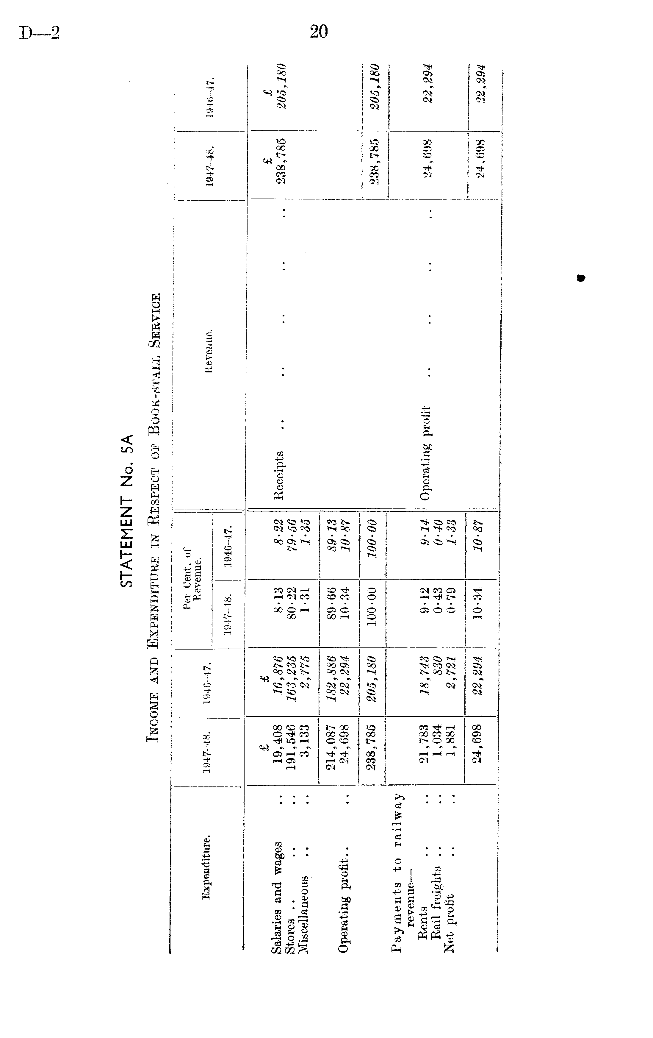 Expenditure. 1947-48. 1046-47. Per Cent, of Revenue. Revenue. 1947-48. 1946-47, 1947-48. 1946-47. Salaries and wages Stores Miscellaneous £ 19,408 191,546 3,133 £ 16,876 163,235 2,775 8-13 80-22 1-31 8-22 79-56 1-35 Receipts £ 238,785 £ 205,180 Operating profit 214,087 24,698 182,886 22,294 89-66 10-34 89-13 10-87 238,785 205,180 100-00 100-00 238,785 205,180 Payments to railway revenueRents Rail freights Net profit 21,783 1,034 1,881 18,743 830 2,721 9-12 0-43 0-79 9-14 0-40 1-33 Operating profit 24,698 22,294 24,698 22,294 10-34 10-87 24,698 22,294