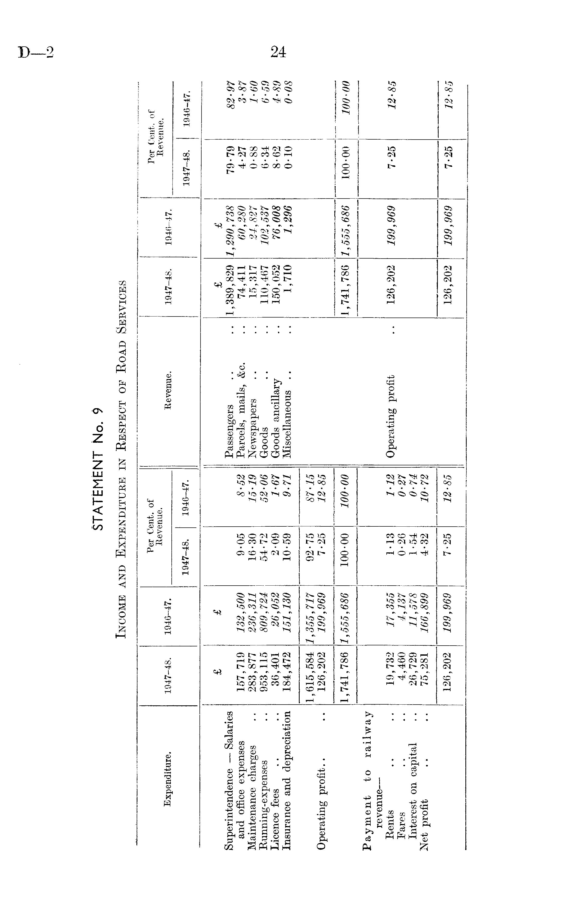 Expenditure. 1947-48. 1946-47, Per Cent, of Revenue. Revenue. 1947-48. 1946-47. Per Cent, of Revenue. 1947-48. 1946-47. 1947-48. 1946-47. Superintendence — Salaries and office expenses Maintenance charges Running-expenses Licence fees Insurance and depreciation £ 157,719 283,877 953,115 36,401 184,472 £ 132,500 236,311 809,724 26,052 151,130 9-05 16-30 54-72 2-09 10-59 8-52 15-19 52-06 1-67 9-71 Passengers Parcels, mails, &c. Newspapers Goods Goods ancillary Miscellaneous £ 1,389,829 74,411 15,317 110,467 150,052 1,710 £ 1,290,738 60,280 24,827 102,537 76,008 1,296 79-79 4-27 0-88 6-34 8-62 0-10 82-97 3-87 1-60 6-59 4-89 0-08 Operating profit.. 1,615,584 126,202 1,355,717 199,969 92-75 7-25 87-15 12-85 1,741,786 1,555,686 100-00 100-00 1,741,786 1,555,686 100-00 100-00 Payment to railway revenue — Rents Fares Interest on capital Net profit ' 19,732 4,460 26,729 75,281 17,355 4,137 11,578 166,899 1-13 0-26 1-54 4-32 1-12 0-27 0-74 10-72 Operating profit 126,202 199,969 7-25 12-85 126,202 199,969 7-25 12-85 126,202 199,969 7-25 12-85