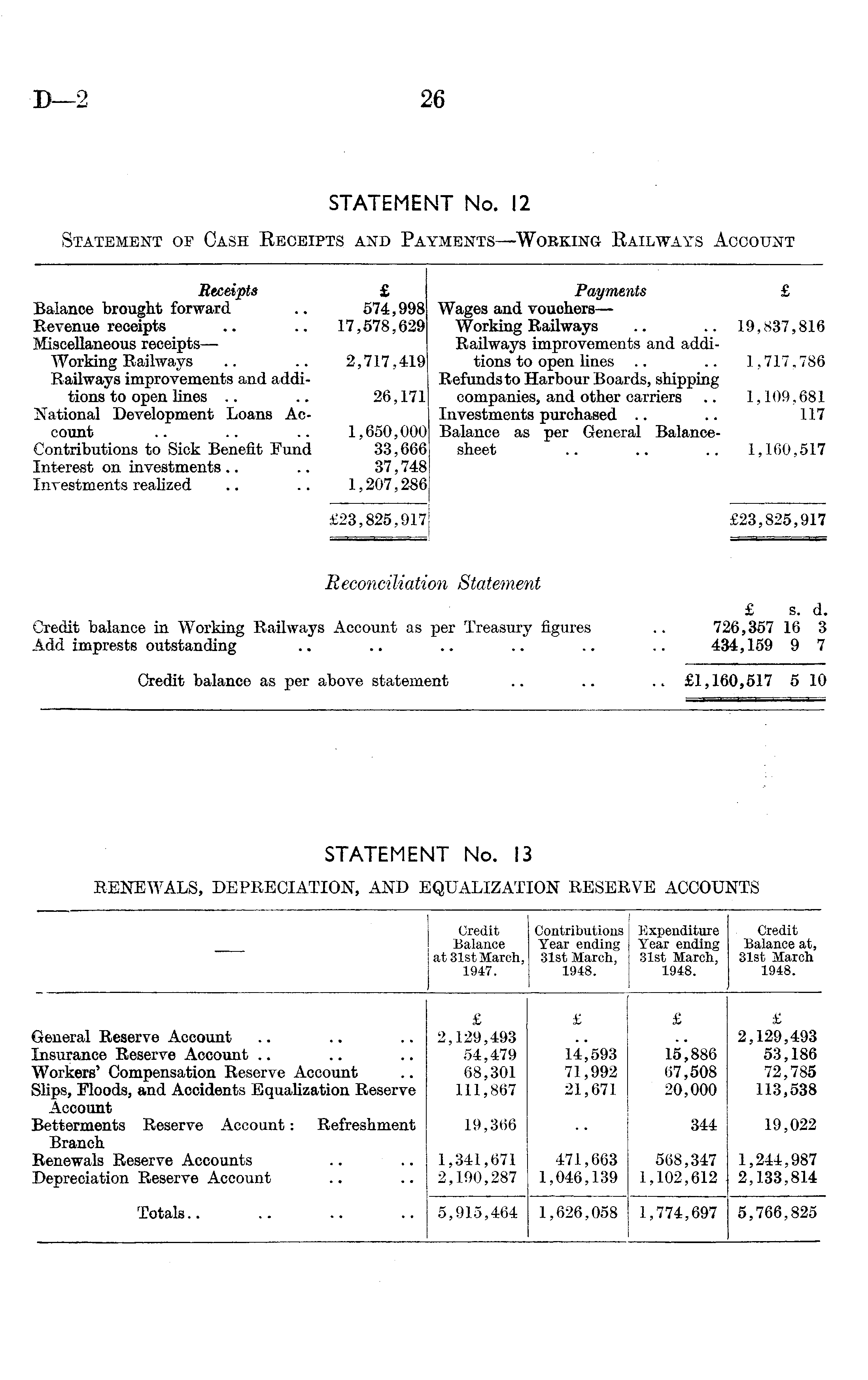 — Credit Balance at 31st March, 1947. Contributions Year ending 31st March, 1948. Expenditure Year ending 31st March, 1948. Credit Balance at, 31st March 1948. General Reserve Account Insurance Reserve Account Workers' Compensation Reserve Account Slips, Floods, and Accidents Equalization Reserve Account Betterments Reserve Account: Refreshment Branch Renewals Reserve Accounts .. Depreciation Reserve Account Totals.. £ 2,129,493 54,479 68,301 111,867 19,366 1,341,671 2,190,287 £ 14j 593 71,992 21,671 471,663 1,046,139 £ 15,886 67,508 20,000 344 568,347 1,102,612 £ 2,129,493 53,186 72,785 113,538 19,022 1,244,987 2,133,814 5,915,464 1,626,058 1,774,697 5,766,825