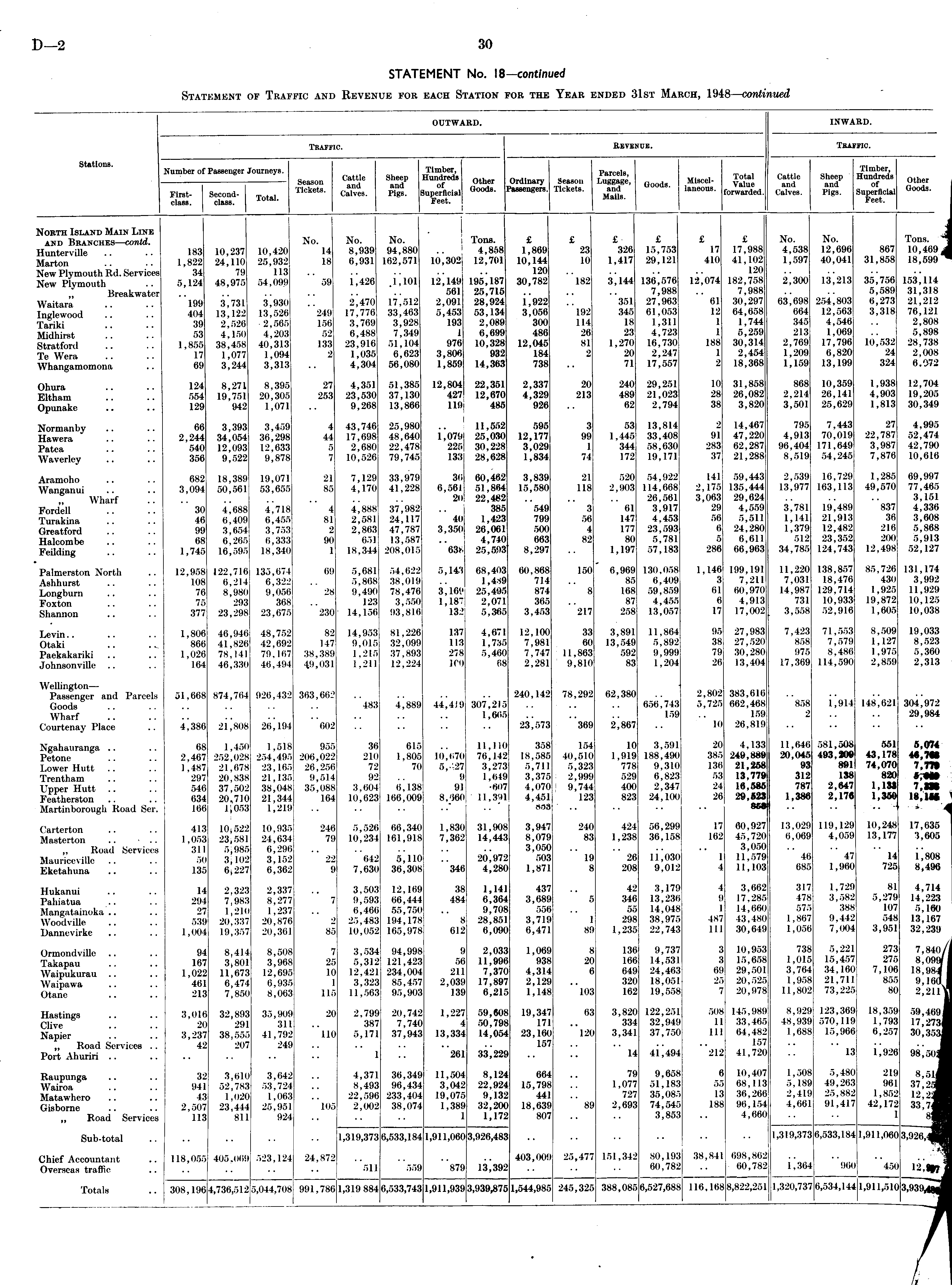 OUTWAKD. INWARD. Traffic. Revenue. Traffic. Stations. Number of Passenger Journeys. Season Tickets. Cattle Sheep Timber, Hundreds Other Goods. Ordinary Passengers. Season Tickets. Parcels, Luggage, and Mails. Goods. Total Cattle Sheep Timber, Hundreds Firstclass. Secondclass. Total. and Calves. and Pigs. of Superficial Feet. 1 laneous. Value forwarded. and Calves. and Pigs. of Superficial Feet. Goods. North Island Main Line and Branches—contd. Hunterville Marton New Plymouth Rd. Services New Plymouth „ Breakwater Waitara Inglewood Tariki Midhirst Stratford Te Wera Whangamomona 183 1,822 34 5,124 199 404 39 53 1,855 17 69 10,237 24,110 79 48,975 3,731 13,122 2,526 4,150 38,458 1,077 3,244 10,420 25,932 113 54,099 3,930 13,526 2,565 4,203 40,313 1,094 3,313 No. 14 18 59 249 156 52 133 2 No. 8,939 6,931 i j 426 2! 470 17,776 3,769 6,488 23,916 1,035 4,304 No. 94,880 162,571 .M01 17,512 33,463 3,928 7,349 51,104 6,623 56,080 . 10,302 12j 149 561 2,091 5,453 193 1 976 3,806 1,859 Tons. 4,858 12,701 195,187 25,715 28,924 53,134 2,089 6,699 10,328 932 14,363 £ 1,869 10,144 120 30,782 1 3,056 300 486 12,045 184 738 £ 23 10 182 192 114 26 81 2 £ - 326 1,417 3! 144 "351 345 18 23 1,270 20 71 £ 15,753 29,121 136,576 7,988 27,963 61,053 1,311 4,723 16,730 2,247 17,557 £ 17 410 12^074 61 12 1 1 188 1 2 £ 17,988 41,102 120 182,758 7,988 30,297 64,658 1,744 5,259 30,314 2,454 18,368 No. 4,538 1,597 2,300 63,698 664 345 213 2,769 1,209 1,159 No. 12,696 40,041 13^213 254,803 12,563 4,546 1,069 17,796 6,820 13,199 867 31,858 35,756 5,589 6,273 3,318 10,532 24 324 Tons. i 10,469 J 18,599 153 j 114 31,318 21,212 76,121 2,808 5,898 28,738 2,008 6.972 Ohura Eltham Opunake 124 554 129 8,271 19,751 942 8,395 20,305 1,071 27 253 4,351 23,530 9,268 51,385 37,130 13,866 12,804 427 119 22,351 12,670 485 2,337 4,329 926 20 213 240 489 62 29,251 21,023 2,794 10 28 38 31,858 26,082 3,820 868 2,214 3,501 10,359 26,141 25,629 1,938 4,903 1,813 12,704 19,205 30,349 Normanby Ha wera Patea ,. Waverley 66 2,244 540 356 3,393 34,054 12,093 9,522 3,459 36,298 12,633 9,878 4 44 5 7 43,746 17,698 2,680 10,526 25,980 48,640 22,478 79,745 i, 079 225 133 11,552 25,030 30,228 28,628 595 12,177 3,029 1,834 3 99 1 74 53 1,445 344 172 13,814 33,408 58,630 19,171 2 91 283 37 14,467 47,220 62.287 21.288 795 4,913 96,404 8,519 7,443 70,019 171,649 54,245 27 22,787 3,987 7,876 4,995 52,474 42,790 10,616 Aramoho Wanganui Wharf Fordell Turakina .. Greatford Halcombe Feilding 682 3,094 30 46 99 68 1,745 18,389 50,561 4,688 6,409 3,654 6,265 16,595 19,071 53,655 4,718 6,455 3,753 6,333 18,340 21 85 4 81 2 90 1 7,129 4,170 4,888 2,581 2,863 651 18,344 33,979 41,228 37,982 24,117 47,787 13,587 208,015 30 6,561 2ii 40 3,350 63> 60,462 51,864 22,482 385 1,423 26,061 4,710 25,593 3,839 15,580 549 799 500 663 8,297 21 118 3 56 4 82 520 2,903 61 147 177 80 1,197 54,922 114,668 26,561 3,917 4,453 23,593 5,781 57,183 141 2,175 3,063 29 56 6 5 286 59,443 135,444 29,624 4,559 5,511 24,280 6,611 66,963 2,539 13,977 3,781 1,141 1,379 512 34,785 16,729 163,113 19,489 21,913 12,482 23,352 124,743 1,285 49,570 "837 36 216 200 12,498 69,997 77,465 3,151 4,336 3,608 5,868 5,913 52,127 Palmerston North Ashhurst Longburn Foxton Shannon 12,958 108 76 75 377 122,716 *>,214 8,980 293 23,298 135,674 6,322 9,056 368 23,675 69 28 230 5,681 5,868 9,490 123 14,156 54,622 38,019 78,476 3,550 93,816 5,143 3,169 1,187 132 68,4u3 1,4 <9 25,495 2,071 5,365 60,868 714 874 365 3,453 150 8 217 6,969 85 168 87 258 130,058 6,409 59,859 4,455 13,057 1,146 3 61 6 17 199,191 7,211 60,970 4,913 17,002 11,220 7,031 14,987 731 3,558 138,857 18,476 129,714 10,933 52,916 85,726 430 1,925 19,872 1,605 131,174 3,992 11,929 10,125 10,038 Levin Otaki .. . Paekakariki Johnson ville 1,806 866 1,026 164 46,946 41,826 78,141 46,330 48,752 42,692 79,167 46,494 82 147 38,389 4.9,031 14,953 9,015 1,215 1,211 81,226 32,099 37,893 12,224 137 113 278 100 4,671 1,735 5,460 68 12,100 7,981 7,747 2,281 33 60 11,863 9,810 3,891 13,549 592 83 11,864 5,892 9,999 1,204 95 38 79 26 27,983 27,520 30,280 13,404 7,423 858 975 17,369 71,553 7,579 8,486 114,590 8,509 1,127 1 .(IT:. 2,859 19,033 8,523 5,360 2,313 Wellington — Passenger and Parcels Goods Wharf Courtenay Place 51,668 4^386 874,764 21,808 926,432 26j 194 363,662 602 483 4,889 44,419 307,215 1,665 240,142 23,573 78,292 369 62,380 2,867 656,743 159 2,802 5,725 10 383,616 662,468 159 26,819 858 2 i ,914 148,621 304,972 29,984 Ngahauranga Petone Lower Hutt Trentham Upper Hutt Featherston Martinborough Road Ser. 68 2,467 1,487 297 546 634 166 1,450 252,028 21,678 20,838 37,502 20,710 1,053 1,518 254,495 23,165 21,135 38,048 21,344 1,219 955 206,022 26,256 9,514 35,088 164 36 210 72 92 3,604 10,623 615 1,805 70 6,138 166,009 10,670 5,--27 9 91 8,<160 11,110 76,142 3,273 1,649 •607 11,311 358 18,585 .-,.711 3,375 4,070 4,451 a.->3 154 40,510 5,323 2,999 9,744 123 10 1,919 778 529 400 823 3,591 188,490 9,310 6,823 2,347 24,100 20 385 136 53 24 26 4,133 249,889 21,258 13,779 16,585 29,523 11,646 20,045 93 312 787 1,386 581,508 493,209 891 138 2,647 2,176 551 43,178 74,070 820 1,133 1,350 5,074 46,768 7,779 5.049 7,338 18,155 i Carterton Masterton .. • .. „ Road Services Mauriceville Eketahuna 413 1,053 311 50 135 10(522 23,581 5,985 3,102 6,227 10,935 24,634 6,296 3,152 6,362 246 79 22 9 5,526 10,234 642 7,630 66,340 161,918 5,110 36,308 1,830 7,362 # 346 31,908 14,443 20,972 4,280 3,947 8,079 3,050 503 1,871 240 83 19 8 424 1,238 26 208 56,299 36,158 li,030 9,012 17 162 1 4 60,927 (5,720 3,050 11,579 11,103 13,029 6,069 46 685 119,129 4,059 47 1,960 10,248 13,177 14 725 17,635 3,605 1,808 8,496 Hukanui Pahiatua Mangatainoka Wood ville Dannevirke 14 294 27 539 1,004 2.323 7,983 1,210 20,337 19,357 2,337 8,277 1,237 20,876 20,361 7 2 85 3,503 9,593 6,46( 25,483 10,052 12,169 66,444 55,750 194,178 165,978 38 484 8 612 1,141 6,364 9,708 28,851 6,090 437 3,689 55C 3,719 6,471 5 1 89 42 346 55 298 1,235 3,179 13,236 14,048 38,975 22,743 4 9 1 487 