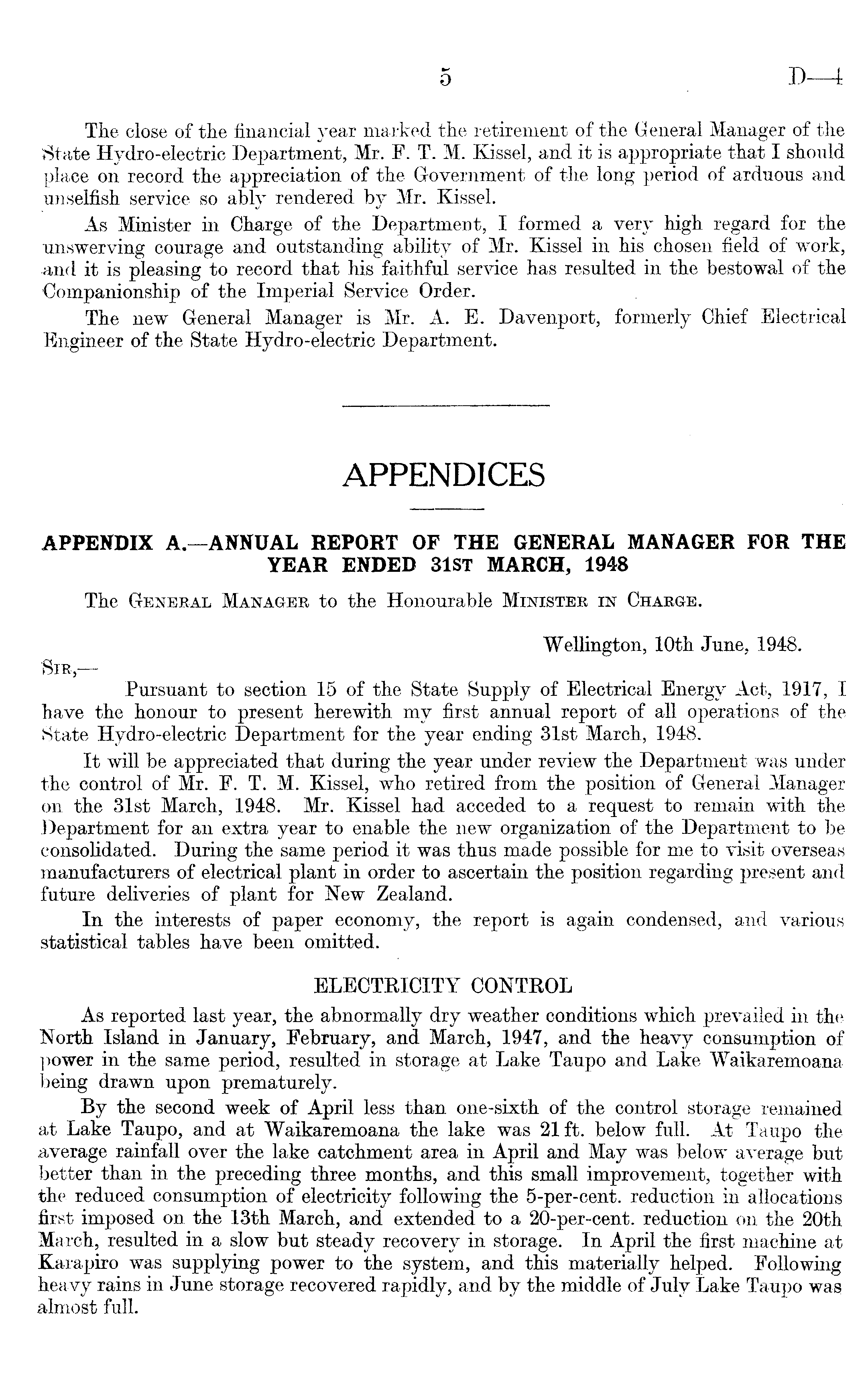 The close of the financial year marked the retirement of the General Manager of the State Hydro-electric Department, Mr. F. T. M. Kissel, and it is appropriate that I should place on record the appreciation of the Government of the long period of arduous and unselfish service so ably rendered by Mr. Kissel. As Minister in Charge of the Department, I formed a very high regard for the unswerving courage and outstanding ability of Mr. Kissel in his chosen field of work, and it is pleasing to record that his faithful service has resulted in the bestowal of the Companionship of the Imperial Service Order. The new General Manager is Mr. A. E. Davenport, formerly Chief Electrical Engineer of the State Hydro-electric Department. APPENDICES APPENDIX A.—ANNUAL REPORT OF THE GENERAL MANAGER FOR THE YEAR ENDED 31ST MARCH, 1948 The General Manager to the Honourable Minister in Charge. Wellington, 10th June, 1948. Sir, — Pursuant to section 15 of the State Supply of Electrical Energy Act, 1917, I have the honour to present herewith my first annual report of all operations of the State Hydro-electric Department for the year ending 31st March, 1948. It will be appreciated that during the year under review the Department was under the control of Mr. F. T. M. Kissel, who retired from the position of General Manager on the 31st March, 1948. Mr. Kissel had acceded to a request to remain with the Department for an extra year to enable the new organization of the Department to be consolidated. During the same period it was thus made possible for me to visit overseas manufacturers of electrical plant in order to ascertain the position regarding present and future deliveries of plant for New Zealand. In the interests of paper economy, the report is again condensed, and various statistical tables have been omitted. ELECTRICITY CONTROL As reported last year, the abnormally dry weather conditions which prevailed in the North Island in January, February, and March, 1947, and the heavy consumption of power in the same period, resulted in storage at Lake Taupo and Lake Waikaremoana being drawn upon prematurely. By the second week of April less than one-sixth of the control storage remained at Lake Taupo, and at Waikaremoana the lake was 21ft. below full. At Taupo the average rainfall over the lake catchment area in April and May was below average but better than in the preceding three months, and this small improvement, together with the reduced consumption of electricity following the 5-per-cent. reduction in allocations first imposed on the 13th March, and extended to a 20-per-cent. reduction on the 20th March, resulted in a slow but steady recovery in storage. In April the first machine at Karapiro was supplying power to the system, and this materially helped. Following heavy rains in June storage recovered rapidly, and by the middle of July Lake Taupo was almost full.