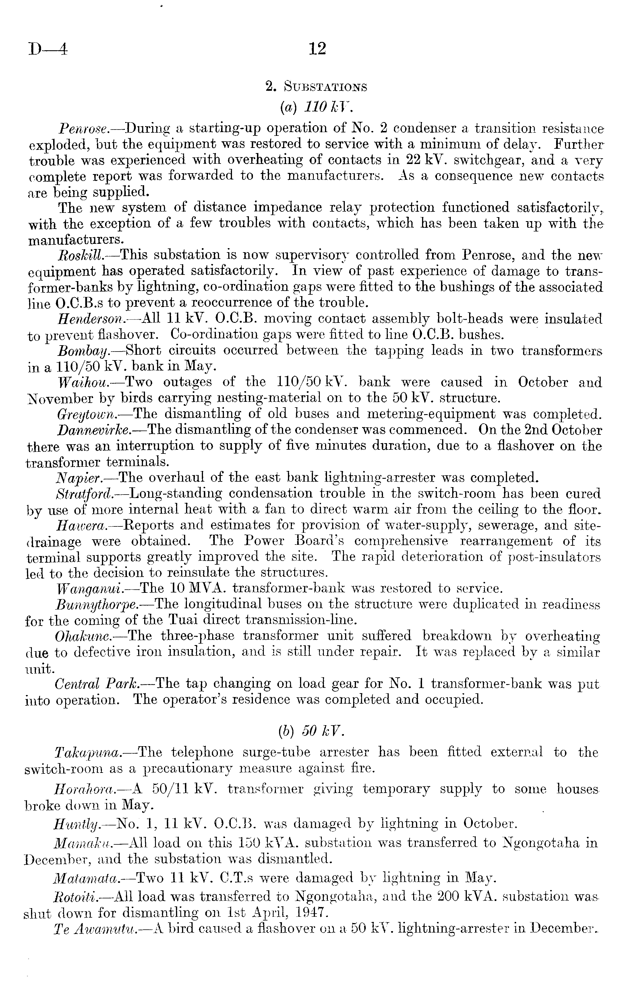 2. Substations {a) 110 kV. Penrose.- —During a starting-up operation of No. 2 condenser a transition resistance exploded, but the equipment was restored to service with a minimum of delay. Further trouble was experienced with overheating of contacts in 22 kV. switchgear, and a very complete report was forwarded to the manufacturers. As a consequence new contacts are being supplied. The new system of distance impedance relay protection functioned satisfactorily, with the exception of a few troubles with contacts, which has been taken up with the manufacturers. Roskill. —This substation is now supervisory controlled from Penrose, and the new equipment has operated satisfactorily. In view of past experience of damage to trans-former-banks by lightning, co-ordination gaps were fitted to the bushings of the associated line 0.C.8.s to prevent a reoccurrence of the trouble. Henderson. —All 11 kV. 0.C.8. moving contact assembly bolt-heads were insulated to prevent flashover. Co-ordination gaps were fitted to line 0.C.8. bushes. Bombay.—Short circuits occurred between the tapping leads in two transformers in a 110/50 kY. bank in May. Waihou. —Two outages of the 110/50 kY. bank were caused in October and November by birds carrying nesting-material on to the 50 kY. structure. Greytown. —The dismantling of old buses and metering-equipment was completed. Dannevirke. —The dismantling of the condenser was commenced. On the 2nd October there was an interruption to supply of five minutes duration, due to a flashover on the transformer terminals. Napier. —The overhaul of the east bank lightning-arrester was completed. Stratford. —Long-standing condensation trouble in the switch-room has been cured by use of more internal heat with a fan to direct warm air from the ceiling to the floor. Hawera. —Reports and estimates for provision of water-supply, sewerage, and sitedrainage were obtained. The Power Board's comprehensive rearrangement of its terminal supports greatly improved the site. The rapid deterioration of post-insulators led to the decision to reinsulate the structures. Wanganui. —The 10 MYA. transformer-bank was restored to service. Bunnythorpe.—The longitudinal buses on the structure were duplicated in readiness for the coming of the Tuai direct transmission-line. Ohakune. —The three-phase transformer unit suffered breakdown by overheating due to defective iron insulation, and is still under repair. It was replaced by a similar unit. Central Park. —The tap changing on load gear for No. 1 transformer-bank was put into operation. The operator's residence was completed and occupied. (6) 50 kY. Takapuna. —The telephone surge-tube arrester has been fitted external to the switch-room as a precautionary measure against fire. Horahora. —A 50/11 kV. transformer giving temporary supply to some houses broke down in May; Huntly. —No. 1, 11 kV. 0.C.8. was damaged by lightning in October. Mamaku. —All load on this 150 kVA. substation was transferred to Ngongotaha in December, and the substation was dismantled. Matamata. —Two 11 kY. C.T.s were damaged by lightning in May. Rotoiti. —All load was transferred to Ngongotaha, and the 200 kYA. substation was shut down for dismantling on Ist April, 1947. Te Awamwtu. —A bird caused a flashover on a 50 kY. lightning-arrester in December.