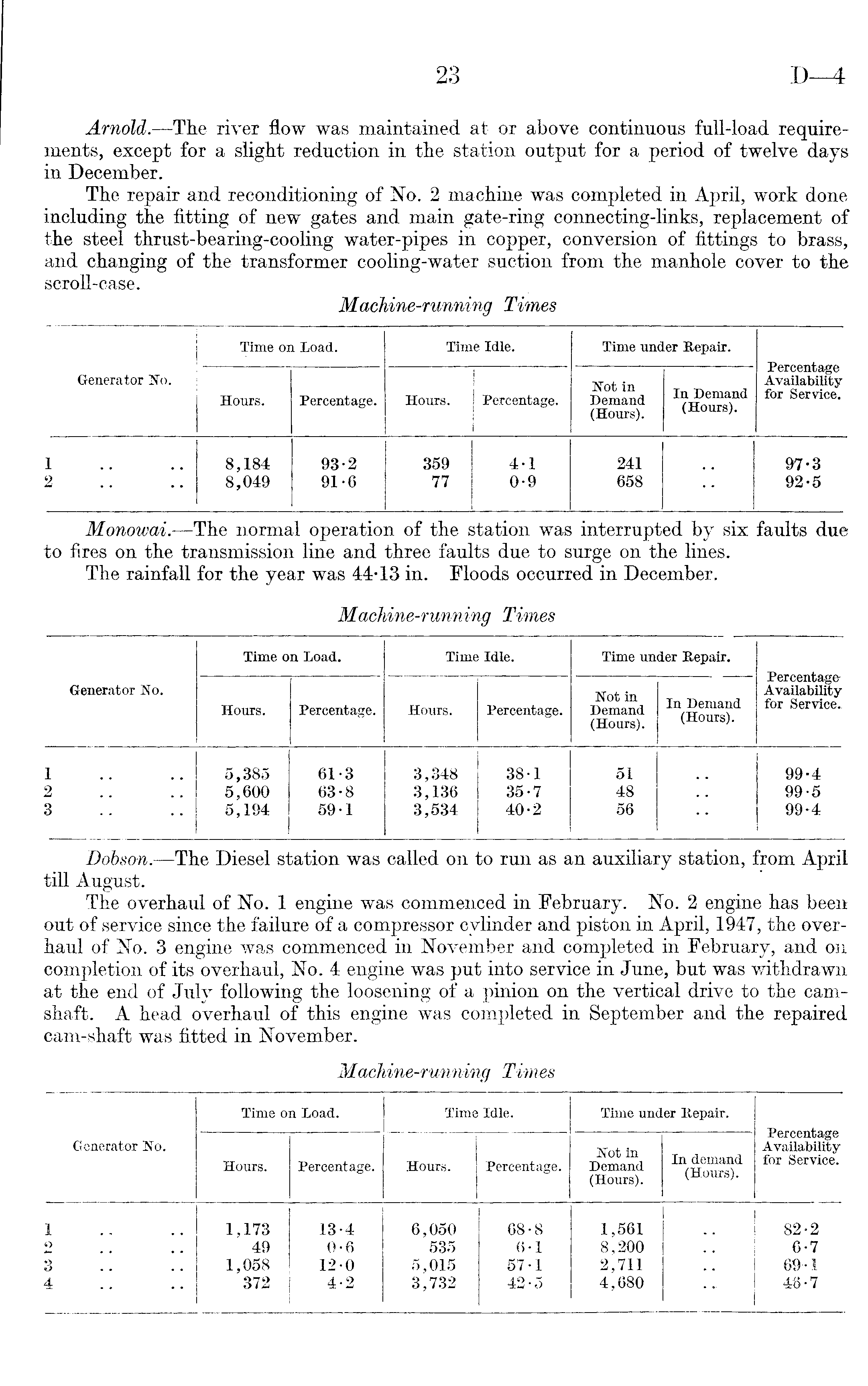 Time on Load. Time Idle. Time under Repair. Percentage Availability for Service. Generator No. Honrs. Percentage. Hours. Percentage. Not in Demand (Hours). In Demand (Hours). 1 2 8,184 8,049 93-2 91-6 359 77 41 0-9 241 658 97-3 92-5