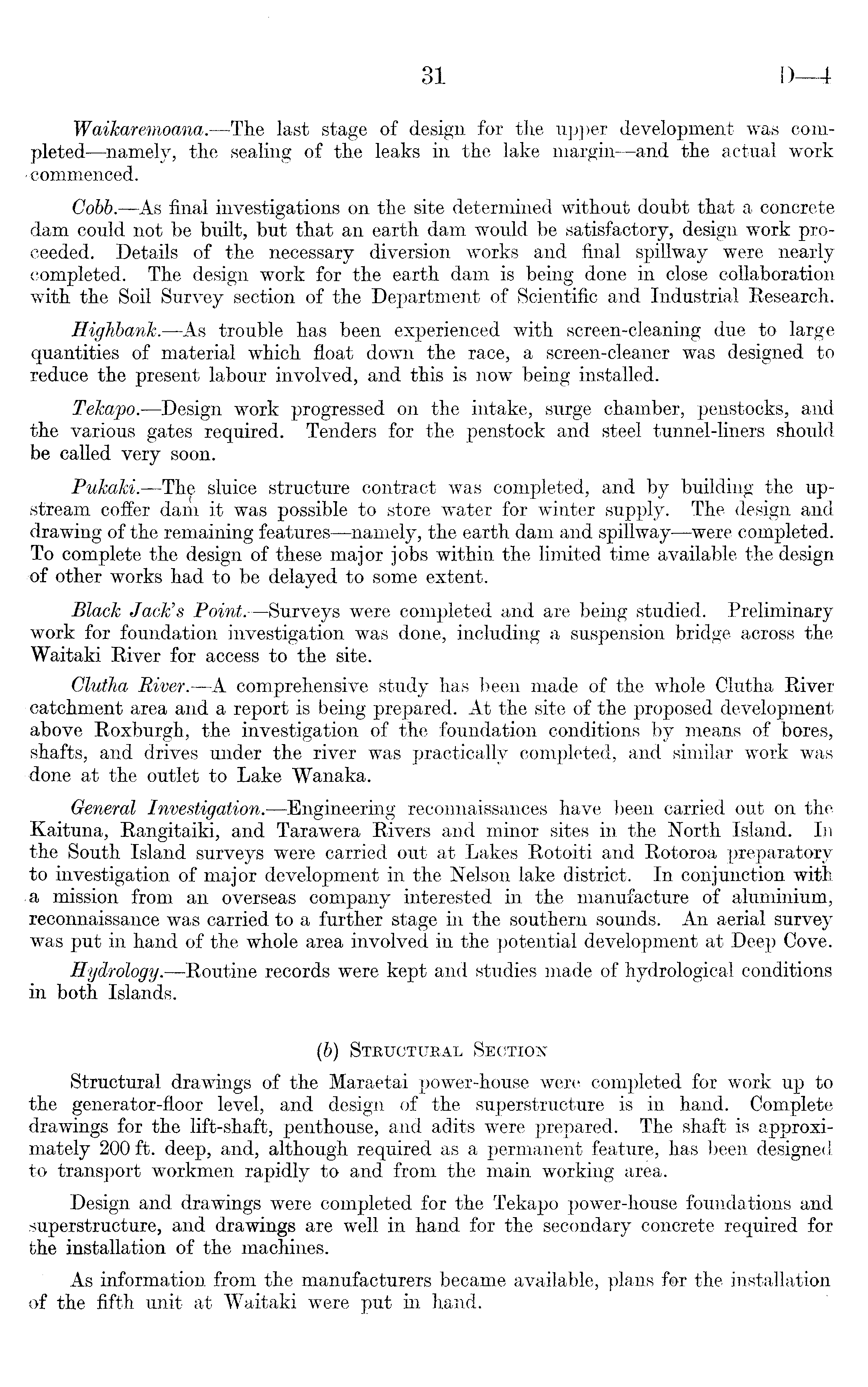 Waikaremoana. —The last stage of design for the upper development was completed—namely, the sealing of the leaks in the lake margin—and the actual work commenced. Cobb. —As final investigations on the site determined without doubt that a concrete dam could not be built, but that an earth dam would be satisfactory, design work proceeded. Details of the necessary diversion works and final spillway were nearly -completed. The design work for the earth dam is being done in close collaboration with the Soil Survey section of the Department of Scientific and Industrial Research. Highbank. —As trouble has been experienced with screen-cleaning due to large quantities of material which float down the race, a screen-cleaner was designed to reduce the present labour involved, and this is now being installed. Tekapo.—Design work progressed on the intake, surge chamber, penstocks, and the various gates required. Tenders for the penstock and steel tunnel-liners should be called very soon. Pukaki. — sluice structure contract was completed, and by building the upstream coffer dam it was possible to store water for winter supply. The design and drawing of the remaining features —namely, the earth dam and spillway—were completed. To complete the design of these major jobs within the limited time available the design •of other works had to be delayed to some extent. Black Jack's Point.-—Surveys were completed and are being studied. Preliminary work for foundation investigation was done, including a suspension bridge across the Waitaki River for access to the site. Clutha River.—A comprehensive study has been made of the whole Clutha River catchment area and a report is being prepared. At the site of the proposed development above Roxburgh, the investigation of the foundation conditions by means of bores, shafts, and drives under the river was practically completed, and similar work was -done at the outlet to Lake Wanaka. General Investigation.—Engineering reconnaissances have been carried out on the Kaituna, Rangitaiki, and Tarawera Rivers and minor sites in the North Island. In the South Island surveys were carried out at Lakes Rotoiti and Rotoroa preparatory to investigation of major development in the Nelson lake district. In conjunction with a mission from an overseas company interested in the manufacture of aluminium, reconnaissance was carried to a further stage in the southern sounds. An aerial survey was put in hand of the whole area involved in the potential development at Deep Cove. Hydrology.—Routine records were kept and studies made of hydrological conditions in both Islands. (6) Structural Section Structural drawings of the Maraetai power-house were completed for work up to the generator-floor level, and design of the superstructure is in hand. Complete drawings for the lift-shaft, penthouse, and adits were prepared. The shaft is approximately 200 ft. deep, and, although required as a permanent feature, has been designed to transport workmen rapidly to and from the main working area. Design and drawings were completed for the Tekapo power-house foundations and superstructure, and drawings are well in hand for the secondary concrete required for the installation of the machines. As information from the manufacturers became available, plans for the installation of the fifth unit at Waitaki were put in hand.