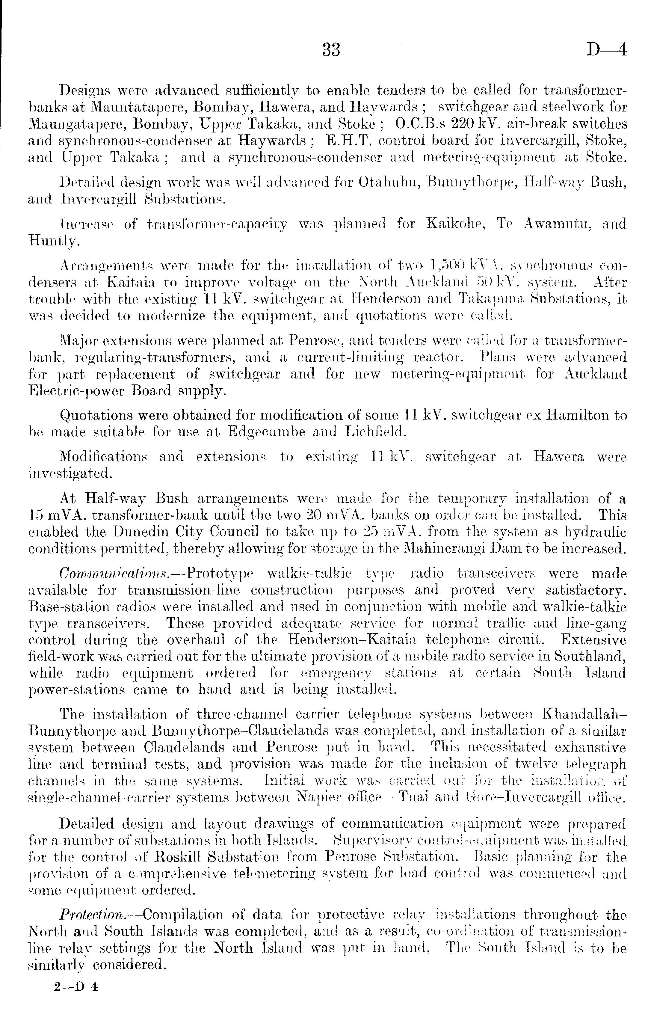 Designs were advanced sufficiently to enable tenders to be called for transformerbanks at Mauntatapere, Bombay, Hawera, and Haywards ; switohgear and steelwork for Maungatapere, Bombay, Upper Takaka, and Stoke ; 0.C.8.s 220 kV. air-break switches and synchronous-condenser at Haywards ; E.H.T. control board for Invercargill, Stoke, and Upper Takaka ; and a synchronous-condenser and metering-equipment at Stoke. Detailed design work was well advanced for Otahuhu, Bunnyt-horpe, Half-way Bush, and Invercargill Substations. Increase of transformer-capacity was planned for Kaikohe, Te Awamutu, and Huntly. Arrangements were made for the installation of two 1,500 kVA. synchronous condensers at Kaitaia to improve voltage on the North Auckland 50 kV. system. After trouble with the existing 11 kV. switchgear at Henderson and Takapuna Substations, it was decided to modernize the equipment, and quotations were called. Major extensions were planned at Penrose, and tenders were called for a transformerbank, regulating-transformers, and a current-limiting reactor. Plans were advanced for part replacement of switchgear and for new metering-equipment for Auckland Electric-power Board supply. Quotations were obtained for modification of some 11 kV. switchgear ex Hamilton to be made suitable for use at Edgecumbe and Lichfield. Modifications and extensions to existing 11 kV. switchgear at Hawera were investigated. At Half-way Bush arrangements were made for the temporary installation of a 15 mVA. transformer-bank until the two 20 mVA. banks on order can be installed. This enabled the Dunedin City Council to take up to 25 mVA. from the system as hydraulic conditions permitted, thereby allowing for storage in the Mahinerangi Dam to be increased. Communications. —Prototype walkie-talkie type radio transceivers were made available for transmission-line construction purposes and proved very satisfactory. Base-station radios were installed and used in conjunction with mobile and walkie-talkie type transceivers. These provided adequate service for normal traffic and line-gang control during the overhaul of the Henderson-Kaitaia telephone circuit. Extensive field-work was carried out for the ultimate provision of a mobile radio service in Southland, while radio equipment ordered for emergency stations at certain South Island power-stations came to hand and is being installed. The installation of three-channel carrier telephone systems between KhandallahBunnythorpe and Bunnythorpe-Claudelands was completed, and installation of a similar system between Claudelands and Penrose put in hand. This necessitated exhaustive line and terminal tests, and provision was made for the inclusion of twelve telegraph channels in the same systems. Initial work was carried out for the installation of single-channel carrier systems between Napier office - Tuai and G-ore-Invercargill office. Detailed design and layout drawings of communication equipment were prepared for a number of substations in both Islands. Supervisory control-equipment was installed for the control of Koskill Substation from Penrose Substation. Basic planning for the provision of a comprehensive telemetering system for load control was commenced and some equipment ordered. Protection.—Compilation of data for protective relay installations throughout the North and South Islands was completed, and as a result, co-ordination of transmissionline relay settings for the North Island was put in hand, The South Island is to be similarlv considered.