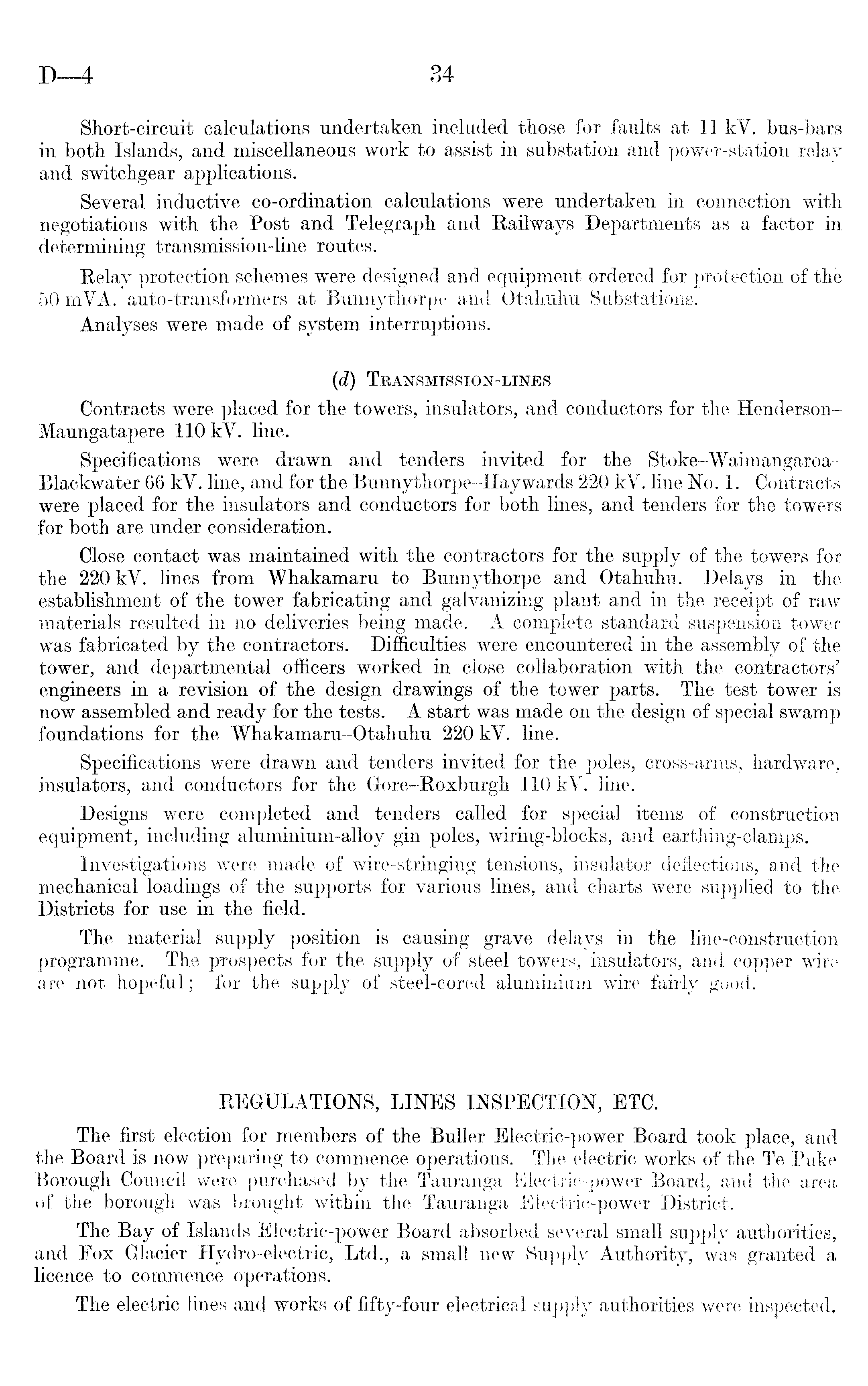 Short-circuit calculations undertaken included those for faults at 11 kV. bus-bars in both Islands, and miscellaneous work to assist in substation and power-station relay and switchgear applications. Several inductive co-ordination calculations were undertaken in connection with negotiations with the Post and Telegraph and Railways Departments as a factor in determining transmission-line routes. Relay protection schemes were designed and equipment ordered for protection of the 50 mYA. auto-transformers at Bunnythorpe and Otahuhu Substations. Analyses were made of system interruptions. (d) Transmission-lines Contracts were placed for the towers, insulators, and conductors for the HendersonMaungatapere 110 kV. line. Specifications were drawn and tenders invited for the Stoke-Waimangaroa-Blackwater 66 kV. line, and for the Bunnythorpe-Haywards 220 kV. line No. 1. Contracts were placed for the insulators and conductors for both lines, and tenders for the towers for both are under consideration. Close contact was maintained with the contractors for the supply of the towers for the 220 kV. lines from Whakamaru to Bunnythorpe and Otahuhu. Delays in the establishment of the tower fabricating and galvanizing plant and in the receipt of raw materials resulted in no deliveries being made. A complete standard suspension tower was fabricated by the contractors. Difficulties were encountered in the assembly of the tower, and departmental officers worked in close collaboration with the contractors' engineers in a revision of the design drawings of the tower parts. The test tower is now assembled and ready for the tests. A start was made on the design of special swamp foundations for the Whakamaru-Otahuhu 220 kV. line. Specifications were drawn and tenders invited for the poles, cross-arms, hardware, insulators, and conductors for the Gore-Roxburgh 110 kV. line. Designs were completed and tenders called for special items of construction equipment, including aluminium-alloy gin poles, wiring-blocks, and earthing-clamps. Investigations were made of wire-stringing tensions, insulator deflections, and the mechanical loadings of the supports for various lines, and charts were supplied to the Districts for use in the field. The material supply position is causing grave delays in the line-construction programme. The prospects for the supply of steel towers, insulators, and copper wire are not hopeful; for the supply of steel-cored aluminium wire fairly good. REGULATIONS, LINES INSPECTION, ETC. The first election for members of the Buller Electric-power Board took place, and the Board is now preparing to commence operations. The electric works of the Te Puke Borough Council were purchased by the Tauranga Electric-power Board, and the area of the borough was brought within the Tauranga Electric-power District. The Bay of Islands Electric-power Board absorbed several small supply authorities, and Fox Glacier Hydro-electric, Ltd., a small new Supply Authority, was granted a licence to commence operations. The electric lines and works of fifty-four electrical supply authorities were inspected.