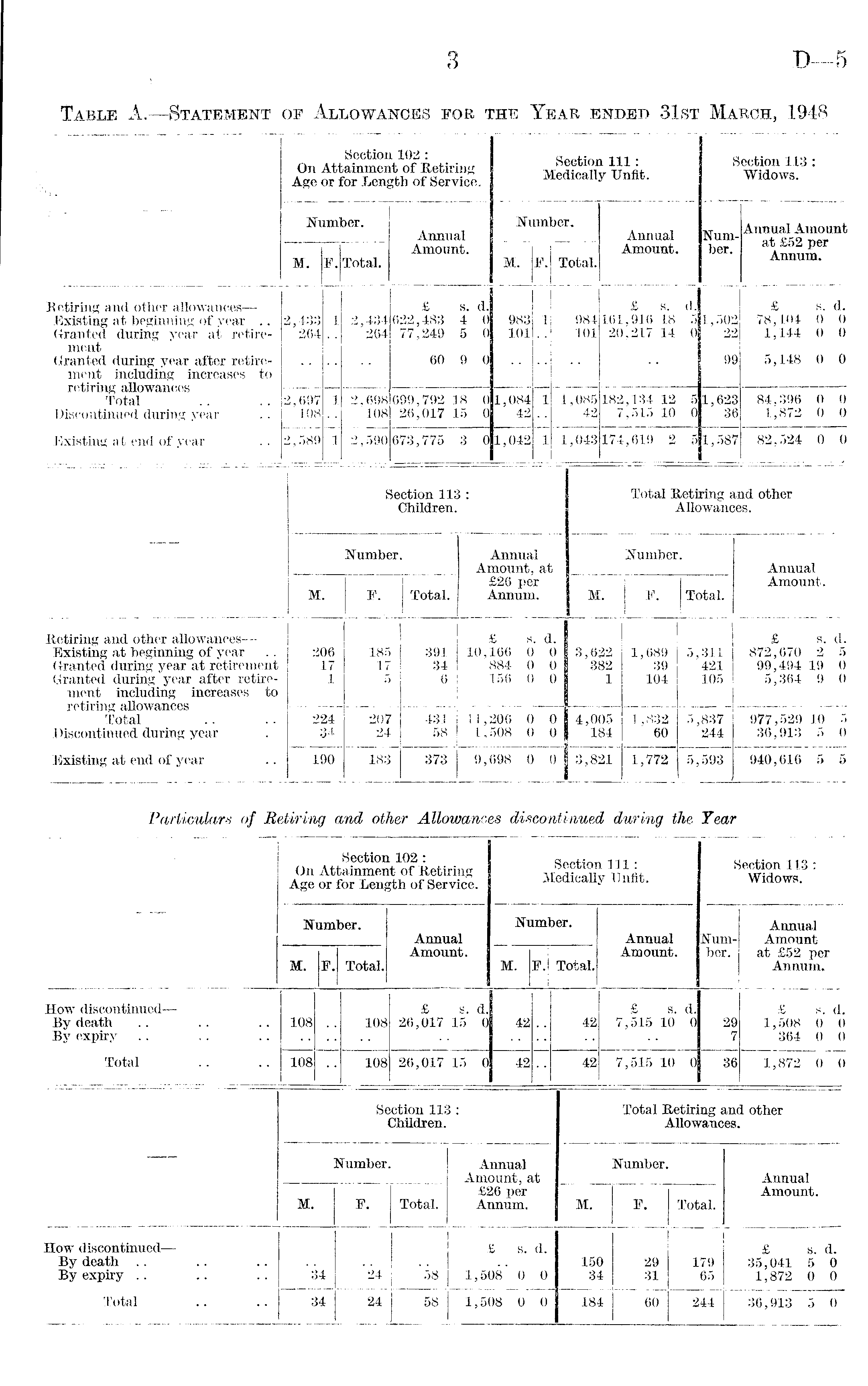 - — Section 102 : On Attainment of Retiring Age or for Length of Service. Section 111: Medically XJnflt. Section 113 : Widows. Number. Annual Amount. Number. Annual Amount. Number. Annual Amount at £52 per Annum. M. F. Total. M. F. Total. How discontinued — By death By expiry Total 108 108 £ s. d. 26,017 15 0 42 42 £ s. d. 7,515 10 0 29 7 £ s. d. 1,508 0 0 364 0 0 108 108 26,017 15 0 42 42 7,515 10 0 36 1,872 0 0 — Section 113: Children. Total Retiring and other Allowances. Number. Annual Amount, at £26 per Annum. Number. Annual M. F. Total. M. F. Total. - Amount. How discontinued— By death By expiry Total 34 24 24 58 £ s. d. 1,508' 0 0 150 34 29 31 179 65 £ s. d. 35,041 5 0 1,872 0 0 34 58 1,508 0 0 184 60 244 36,913 5 0