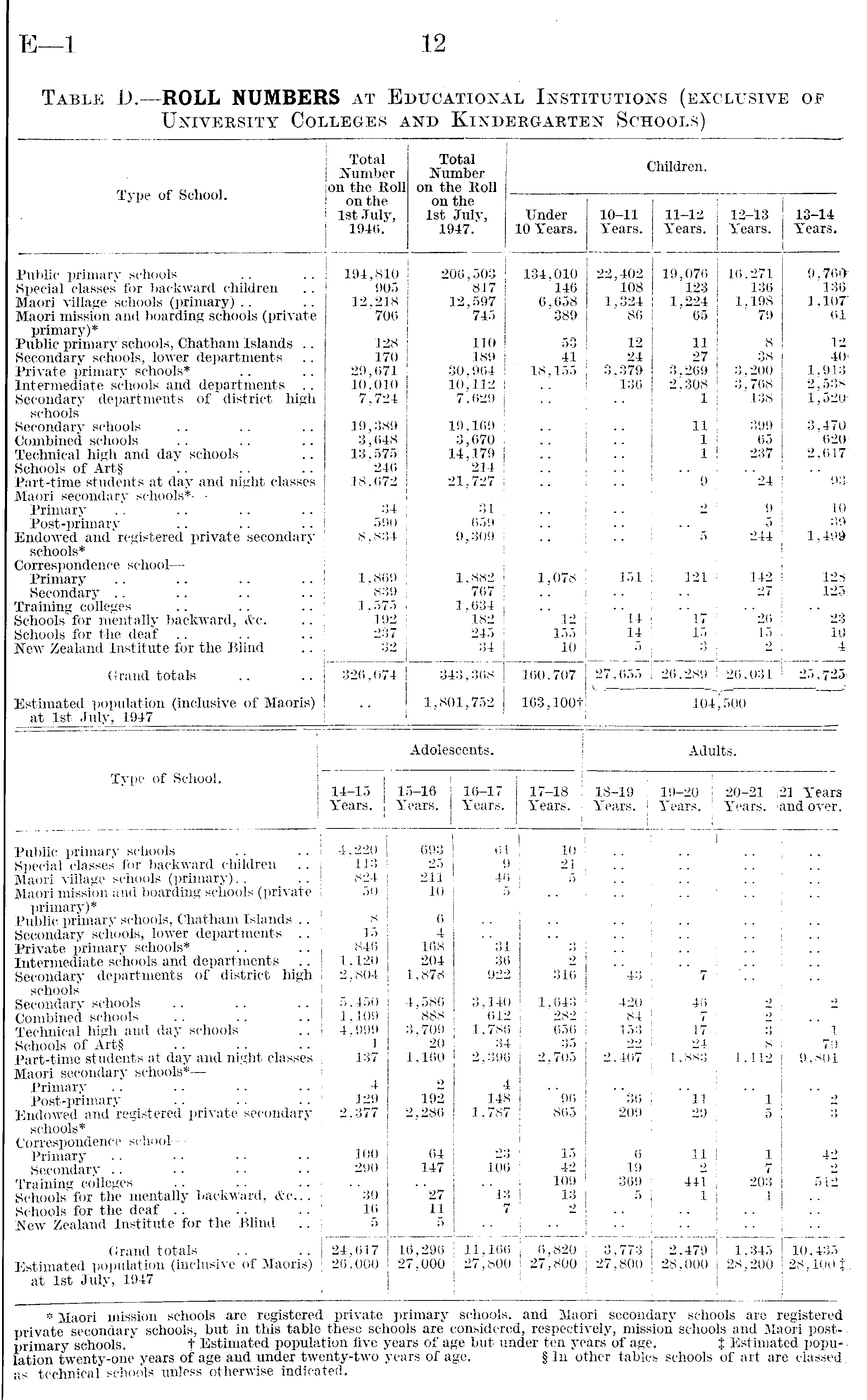 Total Number Total Number Children. Type of School. on the Roll on the Roll on the on the 1st July, 1st July, Under 10-11 11-12 12-13 13-14 1946. 1947. 10 Years. Years. Years. Years. Years. Public primary schools 194,810 206,503 134,010 22,402 19,076 16,271 9,760Special classes for backward children 905 817 146 108 123 136 136 Maori village schools (primary) 12,218 700 12,597 6,658 1,324 1,224 1,198 1,107" Maori mission and boarding schools (private 745 389 86 65 79 61 primary)* Public primary schools, Chatham Islands .. 128 110 53 12 11 8 12 Secondary schools, lower departments 170 189 41 24 27 38 40Private primary schools* 29,671 30,964 18,155 3,379 3,269 3,200 1,913 Intermediate schools and departments .. 10,010 10,112 136 2; 308 3,768 2,538 Secondary departments of district high 7,724 7,629 1 138 1,520schools Secondary schools 19,389 19,169 11 399 3,470Combined schools 3,648 3,670 1 65 620 Technical high and day schools 13,575 14,179 1 237 2,617" Schools of Art§ 246 214 Part-time students at day and night classes 18,672 21,727 9 "24 93Maori secondary schools* — Primary 34 31 I 2 9 10-Post-primary 590 659 j 5 39 Endowed and registered private secondary 8,834 9,309 5 244 1,499 schools* Correspondence school — 142 128 Primary 1,869 1,882 1,078 151 121 Secondary 839 767 27 125Training colleges 1,575 1,634 " 23 Schools for mentally backward, &c. 192 182 12 14 "l7 ' 26 Schools for the deaf 237 245 155 14 15 15 10New Zealand Institute for the Blind 32 34 10 5 3 2 4 Grand totals 326,074 343,368 160,707 27,655 26,289 26,031 25', 725 Estimated population (inclusive of Maoris) 1,801,752 163,100t 104 ,500 at 1st July, 1947 Adolescents. Adults. Type of School. 14-15 15-16 16-17 17-18 18-19 1 19-20 20-21 : 21 Years Years. Years. Years. Years. Years. Years. 1 Years, i and over. Public primary schools 4,220 693 61 10 Special classes for backward children 113 25 9 21 Maori village schools (primary) 824 211 46 5 Maori mission and boarding schools (private 50 10 3 primary)* Public primary schools, Chatham Islands .. 8 6 Secondary schools, lower departments .. 15 4 Private primary schools* 846 168 3 1 3 .. Intermediate schools and departments .. 1.120 204 36 2 Secondary departments of district high 2^804 1,878 92! 2 316 "43 7 schools Secondary schools 5,450 4,586 3,140 1,643 420 46 2 2: Combined schools 1,109 888 61: 2 282 84 7 2 Technical high and day schools 4,999 3,709 1,786 656 153 17 3 1 Schools of Art§ 1 20 34 35 22 24 8 70' Part-time students at day and night classes 137 1,160 2,396 2,705 2,407 1,883 1,112 9,801 Maori secondary schools*— Primary 4 2 4 Post-primary 129 192 148 ' '96 "36 "ll 1 2 Endowed and registered private secondary 2,377 2,286 1,787 865 209 29 5 3 schools* Correspondence school — 100 64 3 15 6 11 Primary 1 42 Secondary 290 147 106 42 19 2 7 2 Training colleges 109 369 441 203 512 Schools for the mentally backward, &c... ' 'so ' '27 13 13 5 1 1 Schools for the deaf 16 11 7 2 New Zealand Institute for the Blind 5 5 Grand totals 24,617 16,296 11,166 6,820 3,773 2,479 1,345 10,435 Estimated population (inclusive of Maoris) at 1st July, 1947 26,000 27,000 27,800 27,800 27,800 28,000 28,200 28,100 t- * Maori mission schools are registered private primary schools. and Maori secondary schools are registered rvrivate secondary schools, but in this table these schools are considered, respectively, mission schools and Maori post--nrimarv sehools. t Estimated population five years of age but under ten years of age. } Estimated popu- - lation twenty-one years of age and under twenty-two years of age. § In other tables schools of art are classed. as technical sehools unless otherwise indicated.