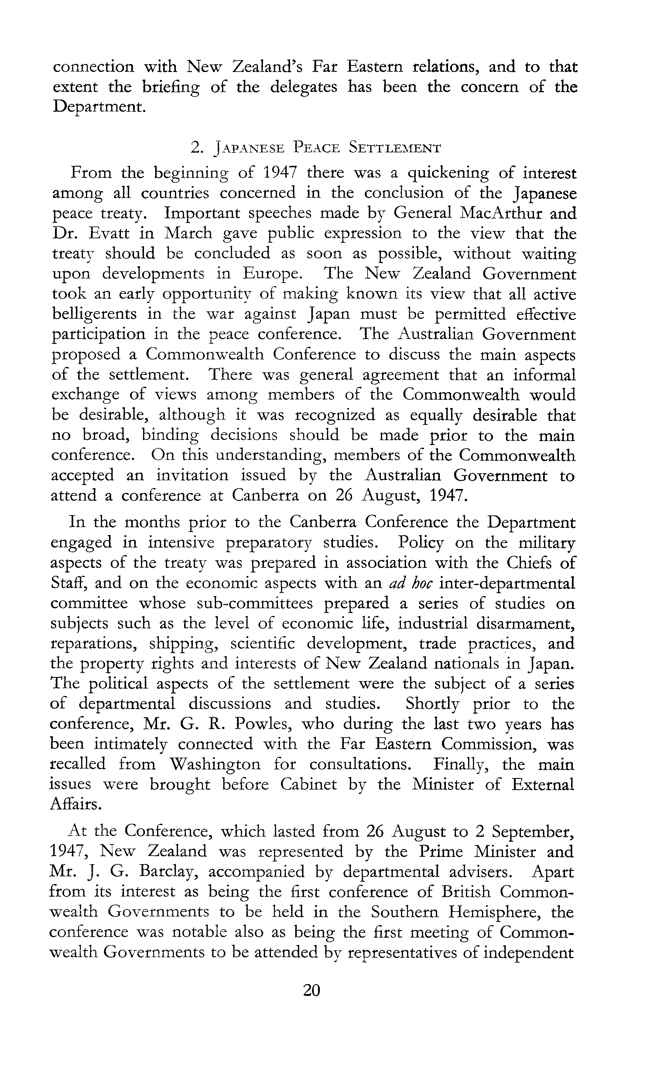connection with New Zealand's Far Eastern relations, and to that extent the briefing of the delegates has been the concern of the Department. 2. Japanese Peace Settlement From the beginning of 1947 there was a quickening of interest among all countries concerned in the conclusion of the Japanese peace treaty. Important speeches made by General Mac Arthur and Dr. Evatt in March gave public expression to the view that the treaty should be concluded as soon as possible, without waiting upon developments in Europe. The New Zealand Government took an early opportunity of making known its view that all active belligerents in the war against Japan must be permitted effective participation in the peace conference. The Australian Government proposed a Commonwealth Conference to discuss the main aspects of the settlement. There was general agreement that an informal exchange of views among members of the Commonwealth would be desirable, although it was recognized as equally desirable that no broad, binding decisions should be made prior to the main conference. On this understanding, members of the Commonwealth accepted an invitation issued by the Australian Government to attend a conference at Canberra on 26 August, 1947. In the months prior to the Canberra Conference the Department engaged in intensive preparatory studies. Policy on the military aspects of the treaty was prepared in association with the Chiefs of Staff, and on the economic aspects with an ad hoc inter-departmental committee whose sub-committees prepared a series of studies on subjects such as the level of economic life, industrial disarmament, reparations, shipping, scientific development, trade practices, and the property rights and interests of New Zealand nationals in Japan. The political aspects of the settlement were the subject of a series of departmental discussions and studies. Shortly prior to the conference, Mr. G. R. Powles, who during the last two years has been intimately connected with the Far Eastern Commission, was recalled from Washington for consultations. Finally, the main issues were brought before Cabinet by the Minister of External Affairs. At the Conference, which lasted from 26 August to 2 September, 1947, New Zealand was represented by the Prime Minister and Mr. J. G. Barclay, accompanied by departmental advisers. Apart from its interest as being the first conference of British Commonwealth Governments to be held in the Southern Hemisphere, the conference was notable also as being the first meeting of Commonwealth Governments to be attended by representatives of independent