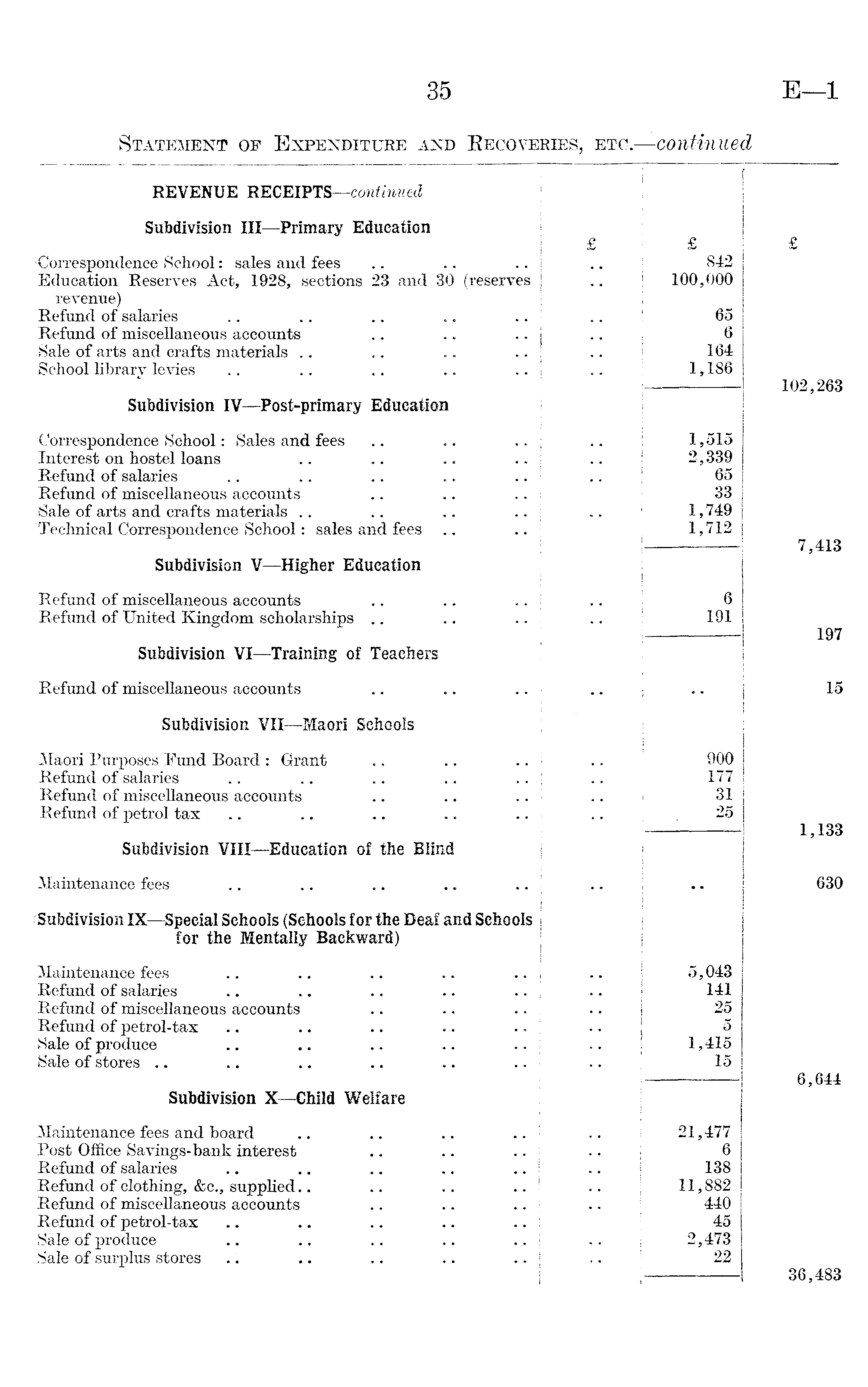 REVENUE RECEIPTS —continued Subdivision III —Primary Education Correspondence School: sales and fees Education Reserves Act, 1928, sections 23 and 30 (reserves revenue) Refund of salaries .. Refund of miscellaneous accounts .Sale of arts and crafts materials School library levies £ £ 842 100,000 65 6 164 1,186 £ 102,263 Subdivision IV—Post-primary Education •Correspondence School: Sales and fees Interest on hostel loans Refund of salaries Refund of miscellaneous accounts "Sale of arts and crafts materials .. .. .. Technical Correspondence School: sales and fees I ! 1,515 2,339 65 33 1,749 1,712 7,413 Subdivision V—Higher Education Refund of miscellaneous accounts Refund of United Kingdom scholarships .. I 6 191 197 Subdivision VI —Training of Teachers Refund of miscellaneous accounts 15 Subdivision VII —Maori Sehools Maori Purposes Fund Board : Grant Refund of salaries Refund of miscellaneous accounts Refund of petrol tax 900 177 31 25 1,133 Subdivision VIII—Education of the Blind Maintenance fees 1 630 ■Subdivision IX —Special Schools (Sehools for the Deaf and Schools for the Mentally Backward) i Maintenance fees Refund of salaries Refund of miscellaneous accounts Refund of petrol-tax Sale of produce Sale of stores .. " 5,043 141 25 5 1,415 15 i 6,644 Subdivision X—Child Welfare 1 Maintenance fees and'board Post Office Savings-bank interest Refund of salaries Refund of clothing, &c., supplied.. .. Refund of miscellaneous accounts Refund of petrol-tax Sale of produce ■Sale of surplus stores 21,477 6 138 11,882 440 45 2,473 22 36,483