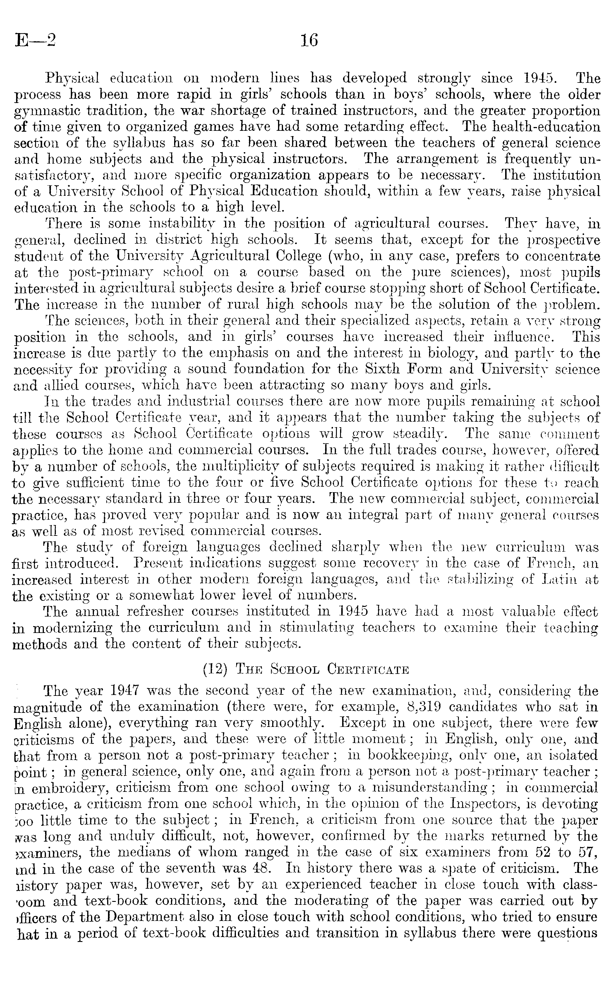 Physical education on modern lines has developed strongly since 1945. The process has been more rapid in girls' schools than in boys' schools, where the older gymnastic tradition, the war shortage of trained instructors, and the greater proportion of time given to organized games have had some retarding effect. The health-education section of the syllabus has so far been shared between the teachers of general science and home subjects and the physical instructors. The arrangement is frequently unsatisfactory, and more specific organization appears to be necessary. The institution of a University School of Physical Education should, within a few years, raise physical education in the schools to a high level. There is some instability in the position of agricultural courses. They have, in general, declined in district high schools. It seems that, except for the prospective student of the University Agricultural College (who, in any case, prefers to concentrate at the post-primary school on a course based on the pure sciences), most pupils interested in agricultural subjects desire a brief course stopping short of School Certificate. The increase in the number of rural high schools may be the solution of the problem. The sciences, both in their general and their specialized aspects, retain a very strong position in the schools, and in girls' courses have increased their influence. This increase is due partly to the emphasis on and the interest in biology, and partly to the necessity for providing a sound foundation for the Sixth Form and University science and allied courses, which have been attracting so many boys and girls. In the trades and industrial courses there are now more pupils remaining at school till the School Certificate year, and it appears that the number taking the subjects of these courses as School Certificate options will grow steadily. The same comment applies to the home and commercial courses. In the full trades course, however, offered by a number of schools, the multiplicity of subjects required is making it rather difficult to give sufficient time to the four or five School Certificate options for these to reach the necessary standard in three or four years. The new commercial subject, commercial practice, has proved very popular and is now an integral part of many general courses as well as of most revised commercial courses. The study of foreign languages declined sharply when the new curriculum was '[first introduced. Present indications suggest some recovery in the case of French, an increased interest in other modern foreign languages, and the stabilizing of Latin at the existing or a somewhat lower level of numbers. The annual refresher courses instituted in 1945 have had a most valuable effect in modernizing the curriculum and in stimulating teachers to examine their teaching methods and the content of their subjects. (12) The School Certificate The year 1947 was the second year of the new examination, and, considering the magnitude of the examination (there were, for example,. 8,319 candidates who sat in English alone), everything ran very smoothly. Except in one subject, there were few criticisms of the papers, and these were of little moment; in English, only one, and that from a person not a post-primary teacher ; in bookkeeping, only one, an isolated point; in general science, only one, and again from a person not a post-primary teacher ; in embroidery, criticism from one school owing to a misunderstanding; in commercial practice, a criticism from one school which, in the opinion of the Inspectors, is devoting doo little time to the subject; in French, a criticism from one source that the paper was long and unduly difficult, not, however, confirmed by the marks returned by the Examiners, the medians of whom ranged in the case of six examiners from 52 to 57, j,nd in the case of the seventh was 48. In history there was a spate of criticism. The listory paper was, however, set by an experienced teacher in close touch with class:oom and text-book conditions, and the moderating of the paper was carried out by >fficers of the Department also in close touch with school conditions, who tried to ensure hat in a period of text-book difficulties and transition in syllabus there were questions
