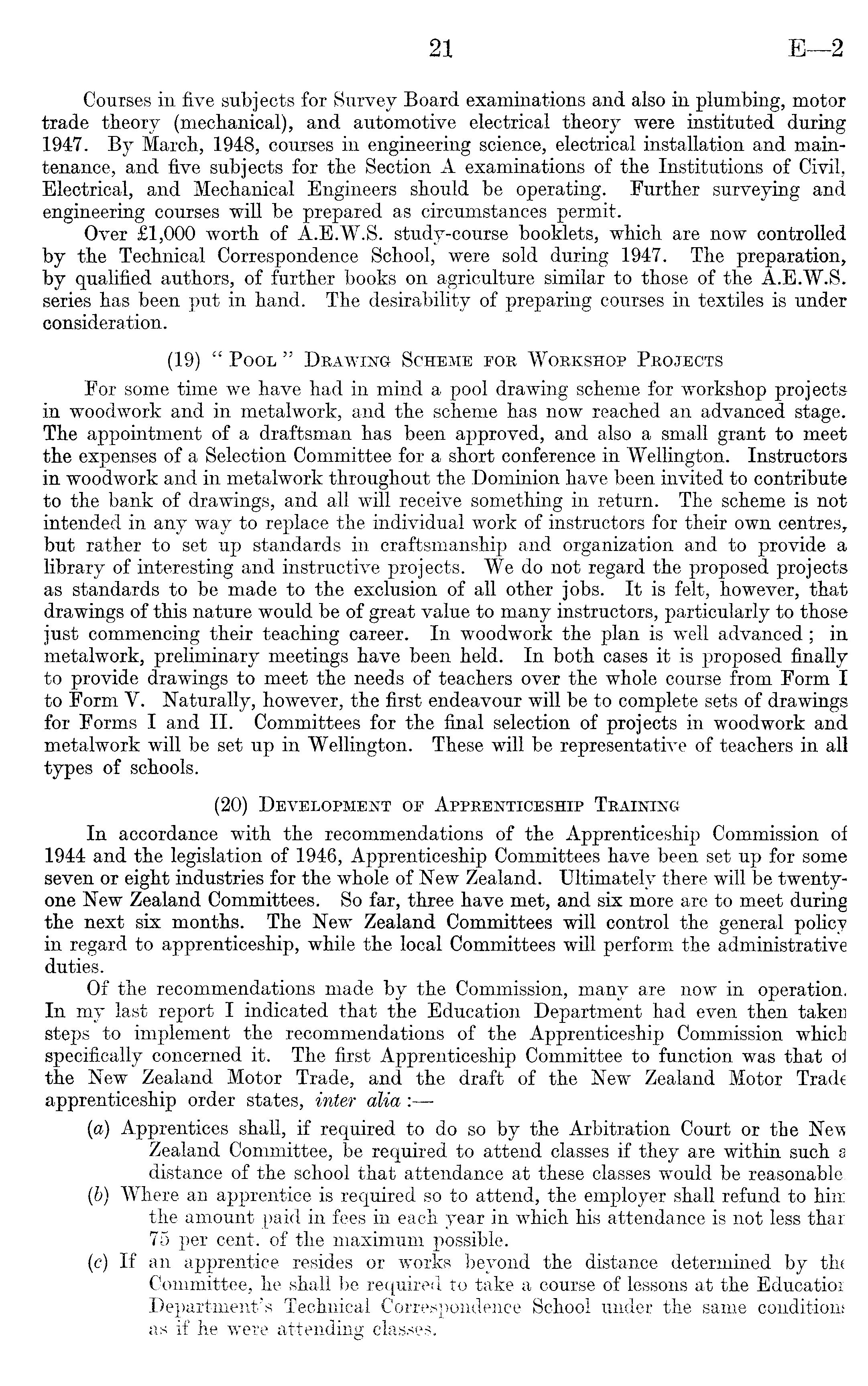 Courses in five subjects for Survey Board examinations and also in plumbing, motor trade theory (mechanical), and automotive electrical theory were instituted during 1947. By March, 1948, courses in engineering science, electrical installation and maintenance, and five subjects for the Section A examinations of the Institutions of Civil, Electrical, and Mechanical Engineers should be operating. Further surveying and engineering courses will be prepared as circumstances permit. Over £l,OOO worth of A.E.W.S. study-course booklets, which are now controlled by the Technical Correspondence School, were sold during 1947. The preparation, by qualified authors, of further books on agriculture similar to those of the A.E.W.S. series has been put in hand. The desirability of preparing courses in textiles is under consideration. (19) " Pool " Drawing Scheme eor Workshop Projects For some time we have had in mind a pool drawing scheme for workshop projects in woodwork and in metalwork, and the scheme has now reached an advanced stage. The appointment of a draftsman has been approved, and also a small grant to meet the expenses of a Selection Committee for a short conference in Wellington. Instructors in woodwork and in metalwork throughout the Dominion have been invited to contribute to the bank of drawings, and all will receive something in return. The scheme is not intended in any way to replace the individual work of instructors for their own centres, but rather to set up standards in craftsmanship and organization and to provide a library of interesting and instructive projects. We do not regard the proposed projects as standards to be made to the exclusion of all other jobs. It is felt, however, that drawings of this nature would be of great value to many instructors, particularly to those just commencing their teaching career. In woodwork the plan is well advanced; in metalwork, preliminary meetings have been held. In both cases it is proposed finally to provide drawings to meet the needs of teachers over the whole course from Form I to Form Y. Naturally, however, the first endeavour will be to complete sets of drawings for Forms I and 11. Committees for the final selection of projects in woodwork and metalwork will be set up in Wellington. These will be representative of teachers in all types of schools. (20) Development of Apprenticeship Training In accordance with the recommendations of the Apprenticeship Commission of 1944 and the legislation of 1946, Apprenticeship Committees have been set up for some seven or eight industries for the whole of New Zealand. Ultimately there will be twentyone New Zealand Committees. So far, three have met, and six more are to meet during the next six months. The New Zealand Committees will control the general policy in regard to apprenticeship, while the local Committees will perform the administrative duties. Of the recommendations made by the Commission, many are now in operation. In my last report I indicated that the Education Department had even then taker steps to implement the recommendations of the Apprenticeship Commission whicl specifically concerned it. The first Apprenticeship Committee to function was that oi the New Zealand Motor Trade, and the draft of the New Zealand Motor Trade apprenticeship order states, inter alia : {a) Apprentices shall, if required to do so by the Arbitration Court or the New Zealand Committee, be required to attend classes if they are within such a distance of the school that attendance at these classes would be reasonable (b) Where an apprentice is required so to attend, the employer shall refund to birr the amount paid in fees in each year in which his attendance is not less thar 75 per cent, of the maximum possible. (c) If an apprentice resides or works beyond the distance determined by the Committee, he shall be required to take a course of lessons at the Educatior Department's Technical Correspondence School under the same conditions as if he were attending classes.