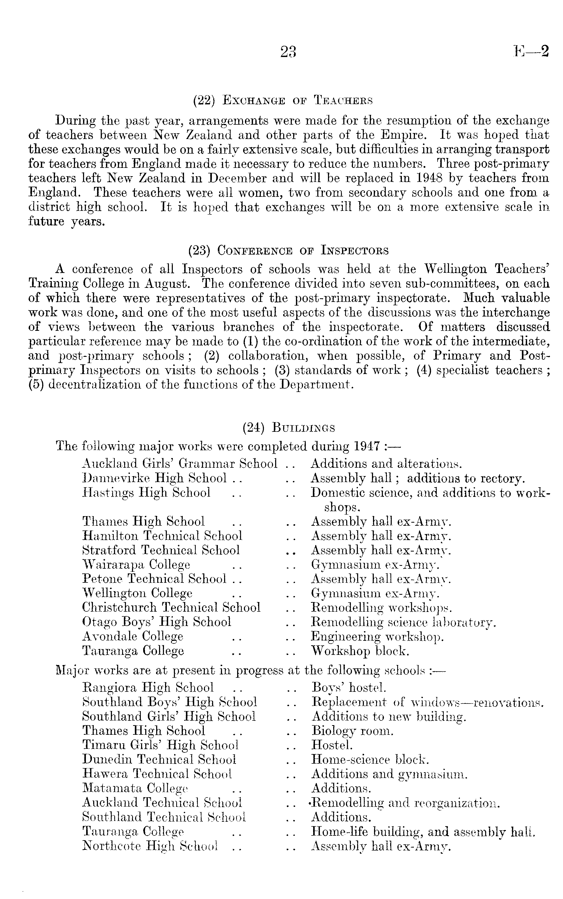 (22) Exchange of Teachers During the past year, arrangements were made for the resumption of the exchange of teachers between New Zealand and other parts of the Empire. It was hoped that these exchanges would be on a fairly extensive scale, but difficulties in arranging transport for teachers from England made it necessary to reduce the numbers. Three post-primary teachers left New Zealand in December and will be replaced in 1948 by teachers from England. These teachers were all women, two from secondary schools and one from a district high school. It is hoped that exchanges will be on a more extensive scale in future years. (23) Conference of Inspectors A conference of all Inspectors of schools was held at the Wellington Teachers' Training College in August. The conference divided into seven sub-committees, on each of which there were representatives of the post-primary inspectorate. Much valuable work was done, and one of the most useful aspects of the discussions was the interchange of views between the various branches of the inspectorate. Of matters discussed particular reference may be made to (1) the co-ordination of the work of the intermediate, and post-primary schools ; (2) collaboration, when possible, of Primary and Postprimary Inspectors on visits to schools ; (3) standards of work ; (4) specialist teachers ; (5) decentralization of the functions of the Department. (24) Buildings The following major works were completed during 1947 : Auckland Girls' Grammar School .. Additions and alterations. Dannevirke High School .. .. Assembly hall; additions to rectory. Hastings High School .. .. Domestic science, and additions to workshops. Thames High School .. .. Assembly hall ex-Army. Hamilton Technical School .. Assembly hall ex-Army. Stratford Technical School .. Assembly hall ex-Army. Wairarapa College .. .. Gymnasium ex-Army. Petone Technical School .. .. Assembly hall ex-Army. Wellington College .. .. Gymnasium ex-Army. Christchurch Technical School .. Remodelling workshops. Otago Boys' High School .. Remodelling science laboratory. Avondale College .. .. Engineering workshop. Tauranga College .. .. Workshop block. Major works are at present in progress at the following schools : Rangiora High School .. .. Boys' hostel. Southland Boys' High School .. Replacement of windows—renovations. Southland Girls' High School .. Additions to new building. Thames High School .. .. Biology room. Timaru Girls' High School .. Hostel. Dunedin Technical School .. Home-science block. Hawera Technical School .. Additions and gymnasium. Matamata College .. .. Additions. Auckland Technical School .. •Remodelling and reorganization. Southland Technical School .. Additions. Tauranga College .. .. Home-life building, and assembly hall. Northcote High School .. .. Assembly hall ex-Army.