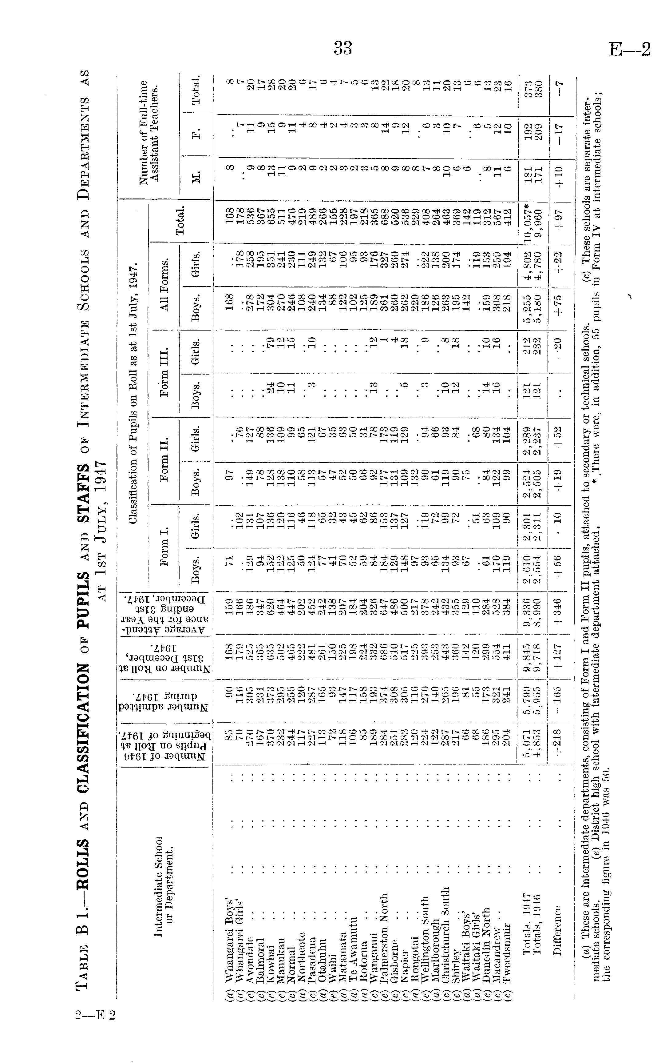 Table B1.—ROLLS and CLASSIFICATION of PUPILS and STAFFS or Intermediate Schools and Departments as at 1st July, 1947