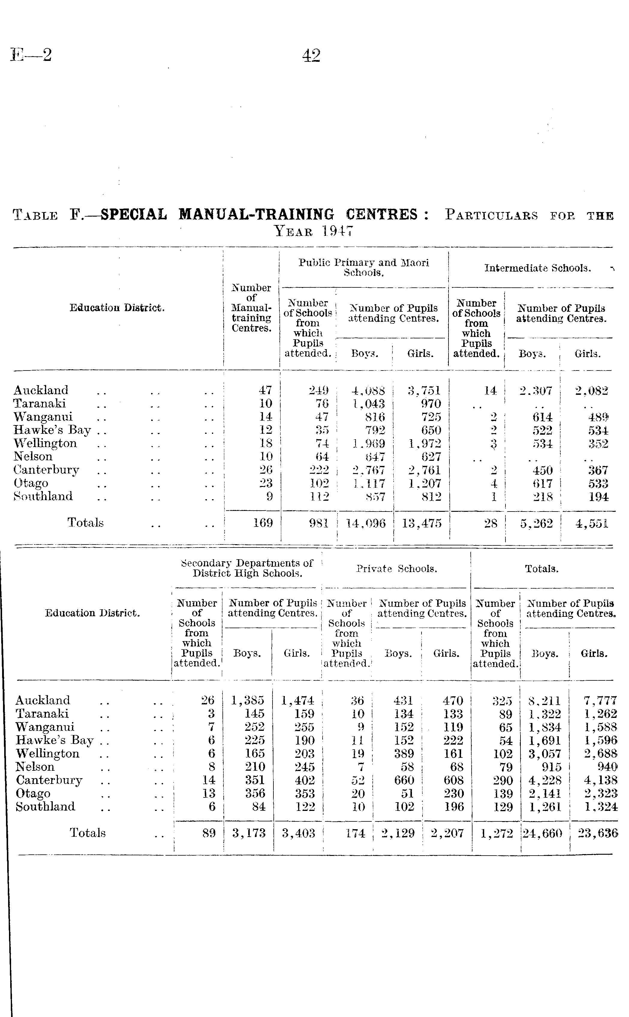 Table F. —SPECIAL MANUAL-TRAINING CENTRES: Particulars for the Year 1947