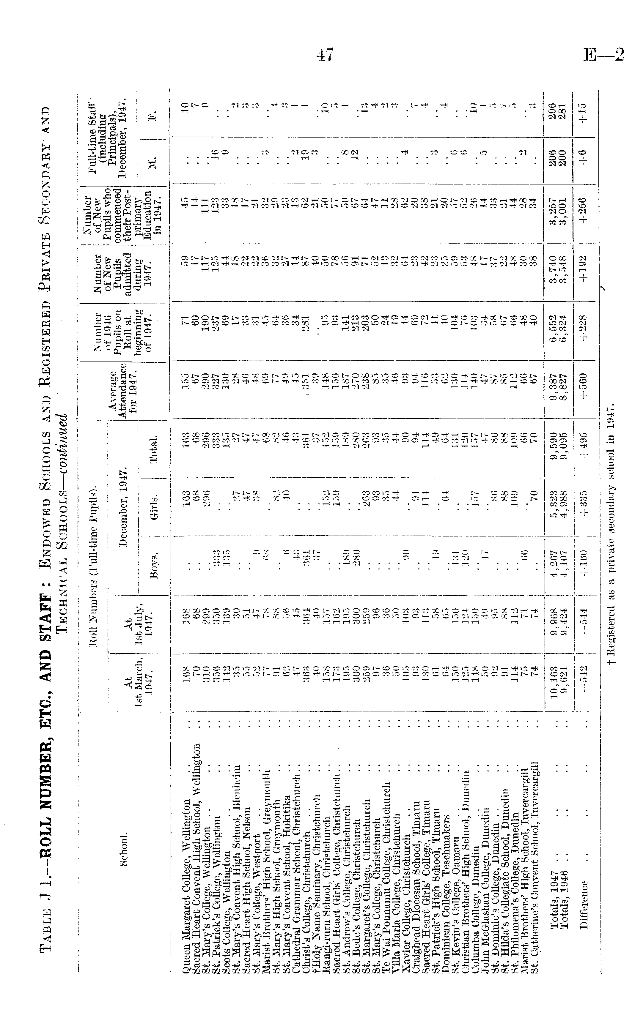 Table J1.—ROLL NUMBER, ETC., AND STAFF: Endowed Schools and Registered Private Secondary and Technical Schools— continued