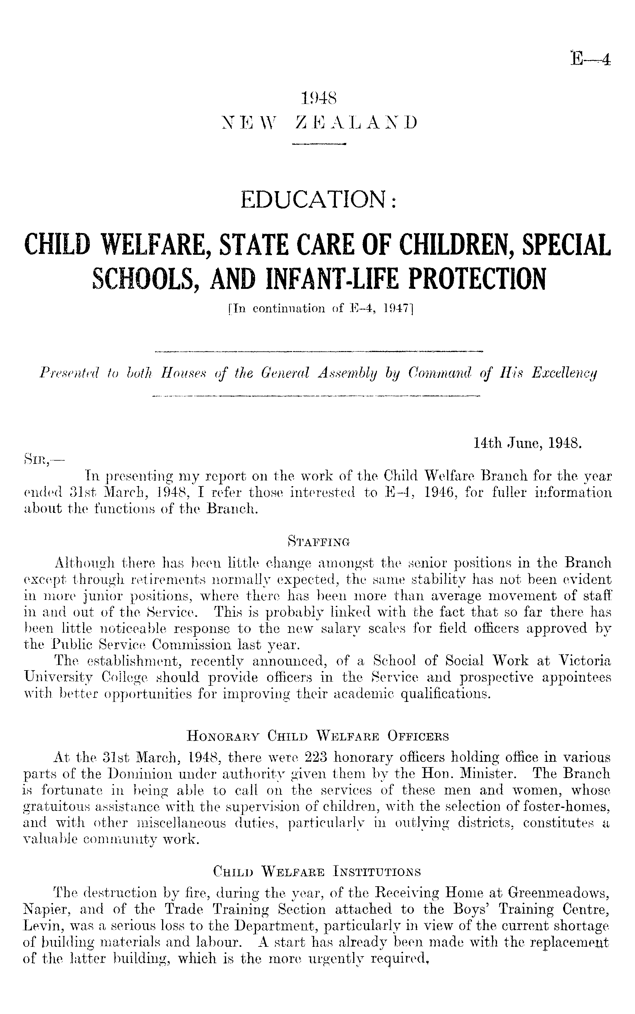 Presented to both Houses of the General Assembly by Command of His Excellency 14th June, 1948. Sib, — In presenting my report on the work of the Child Welfare Branch for the year ended 31st March, 1948, I refer those interested to E-4, 1946, for fuller information about the functions of the Branch. Staffing Although there has been little change amongst the senior positions in the Branch except through retirements normally expected, the same stability has not been evident in more junior positions, where there has been more than average movement of staff in and out of the Service. This is probably linked with the fact that so far there has been little noticeable response to the new salary scales for field officers approved by the Public Service Commission last year. The establishment, recently announced, of a School of Social Work at Victoria University College should provide officers in the Service and prospective appointees with better opportunities for improving their academic qualifications. Honorary Child Welfare Officers At the 31st March, 1948, there were 223 honorary officers holding office in various parts of the Dominion under authority given them by the Hon. Minister. The Branch is fortunate in being able to call oil the services of these men and women, whose gratuitous assistance with the supervision of children, with the selection of foster-homes, and with other miscellaneous duties, particularly in outlying districts, constitutes a valuable community work. Child Welfare Institutions The destruction by fire, during the year, of the Receiving Home at Greenmeadows, Napier, and of the Trade Training Section attached to the Boys' Training Centre, Levin, was a serious loss to the Department, particularly in view of the current shortage of building materials and labour. A start has already been made with the replacement of the latter building, which is the more urgently required,