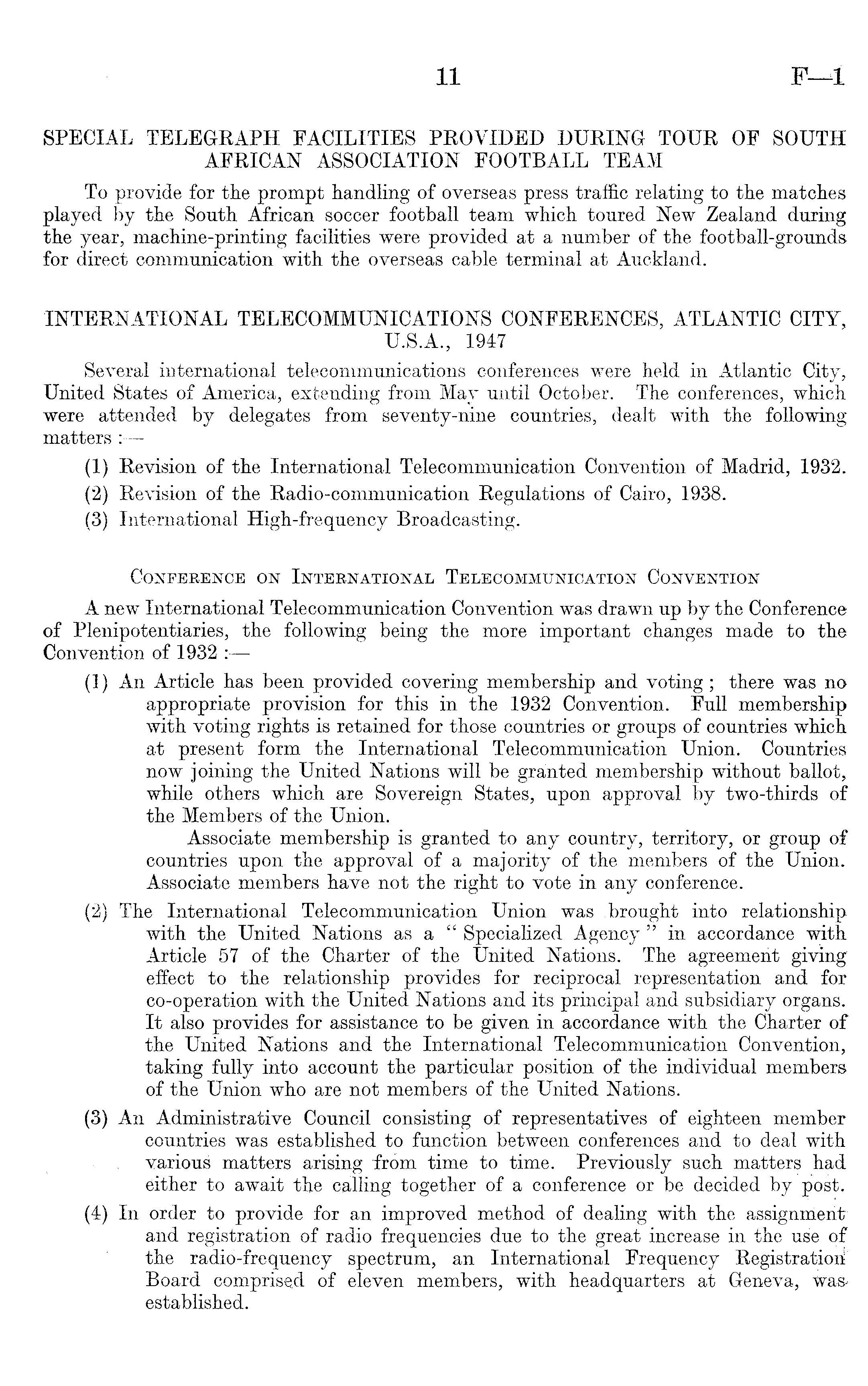 SPECIAL TELEGRAPH FACILITIES PROVIDED DURING TOUR OF SOUTH AFRICAN ASSOCIATION FOOTBALL TEAM To provide for the prompt handling of overseas press traffic relating to the matches played by the South African soccer football team which toured New Zealand during the year, machine-printing facilities were provided at a number of the football-grounds for direct communication with the overseas cable terminal at Auckland. INTERNATIONAL TELECOMMUNICATIONS CONFERENCES, ATLANTIC CITY, U.S.A., 1947 Several international telecommunications conferences were held in Atlantic City, United States of America, extending from May until October. The conferences, which were attended by delegates from seventy-nine countries, dealt with the following matters : (1) Revision of the International Telecommunication Convention of Madrid, 1932. (2) Revision of the Radio-communication Regulations of Cairo, 1938. (3) International High-frequency Broadcasting. Conference on International Telecommunication Convention A new International Telecommunication Convention was drawn up by the Conference of Plenipotentiaries, the following being the more important changes made to the Convention of 1932 : (1) An Article has been provided covering membership and voting ; there was no appropriate provision for this in the 1932 Convention. Full membership with voting rights is retained for those countries or groups of countries which at present form the International Telecommunication Union. Countries now joining the United Nations will be granted membership without ballot, while others which are Sovereign States, upon approval by two-thirds of the Members of the Union. Associate membership is granted to any country, territory, or group of countries upon the approval of a majority of the members of the Union. Associate members have not the right to vote in any conference. (2) The International Telecommunication Union was brought into relationship with the United Nations as a " Specialized Agency " in accordance with Article 57 of the Charter of the United Nations. The agreement giving effect to the relationship provides for reciprocal representation and for co-operation with the United Nations and its principal and subsidiary organs. It also provides for assistance to be given in accordance with the Charter of the United Nations and the International Telecommunication Convention, taking fully into account the particular position of the individual members of the Union who are not members of the United Nations. (3) An Administrative Council consisting of representatives of eighteen member countries was established to function between conferences and to deal with various matters arising from time to time. Previously such matters had either to await the calling together of a conference or be decided by post. (4) In order to provide for an improved method of dealing with the assignment and registration of radio frequencies due to the great increase in the use of the radio-frequency spectrum, an International Frequency Registration 1 ' Board comprised of eleven members, with headquarters at Geneva, was established.