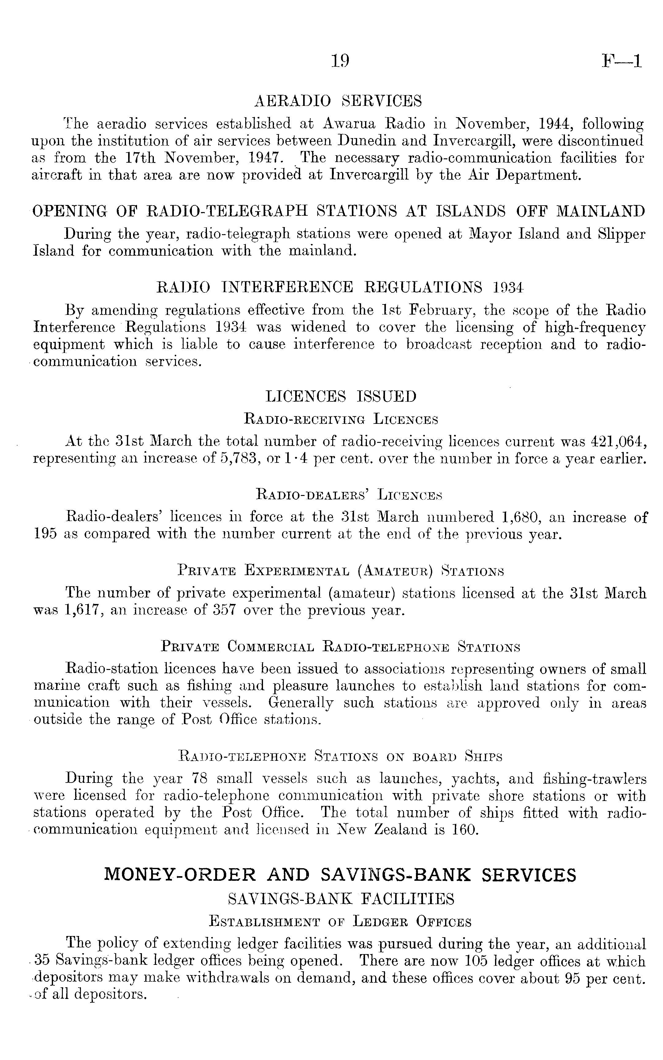 AERADIO SERVICES The aeradio services established at Awarua Radio in November, 1944, following upon the institution of air services between Dunedin and Invercargill, were discontinued as from the 17th November, 1947. The necessary radio-communication facilities for aircraft in that area are now provided at Invercargill by the Air Department. OPENING OF RADIO-TELEGRAPH STATIONS AT ISLANDS OFF MAINLAND During the year, radio-telegraph stations were opened at Mayor Island and Slipper Island for communication with the mainland. RADIO INTERFERENCE REGULATIONS 1934 By amending regulations effective from the Ist February, the scope of the Radio Interference ' Regulations 1934 was widened to cover the licensing of high-frequency equipment which is liable to cause interference to broadcast reception .and to radiocommunication. services. LICENCES ISSUED Radio-receiving Licences At the 31st March the total number of radio-receiving licences current was 421,064, representing an increase of 5,783, or 1 *4 per cent, over the number in force a year earlier. Radio-dealers' Licences Radio-dealers' licences in force at the 31st March numbered 1,680, an increase of 195 as compared with the number current at the end of the previous year. Private Experimental (Amateur) Stations The number of private experimental (amateur) stations licensed at the 31st March was 1,617, an increase of 357 over the previous year. Private Commercial Radio-telephone Stations Radio-station licences have been issued to associations representing owners of small marine craft such as fishing and pleasure launches to establish land stations for communication with their vessels. Generally such stations are approved only in areas • outside the range of Post Office stations. Radio-telephone Stations on board Ships During the year 78 small vessels such as launches, yachts, and fishing-trawlers were licensed for radio-telephone communication with private shore stations or with stations operated by the Post Office. The total number of ships fitted with radiocommunication equipment and licensed in New Zealand is 160. MONEY-ORDER AND SAVINGS-BANK SERVICES SAVINGS-BANK FACILITIES Establishment of Ledger Offices The policy of extending ledger facilities was pursued during the year, an additional 35 Savings-bank ledger offices being opened. There are now 105 ledger offices at. which depositors may make withdrawals on demand, and these offices cover about 95 per cent. «©f all depositors.