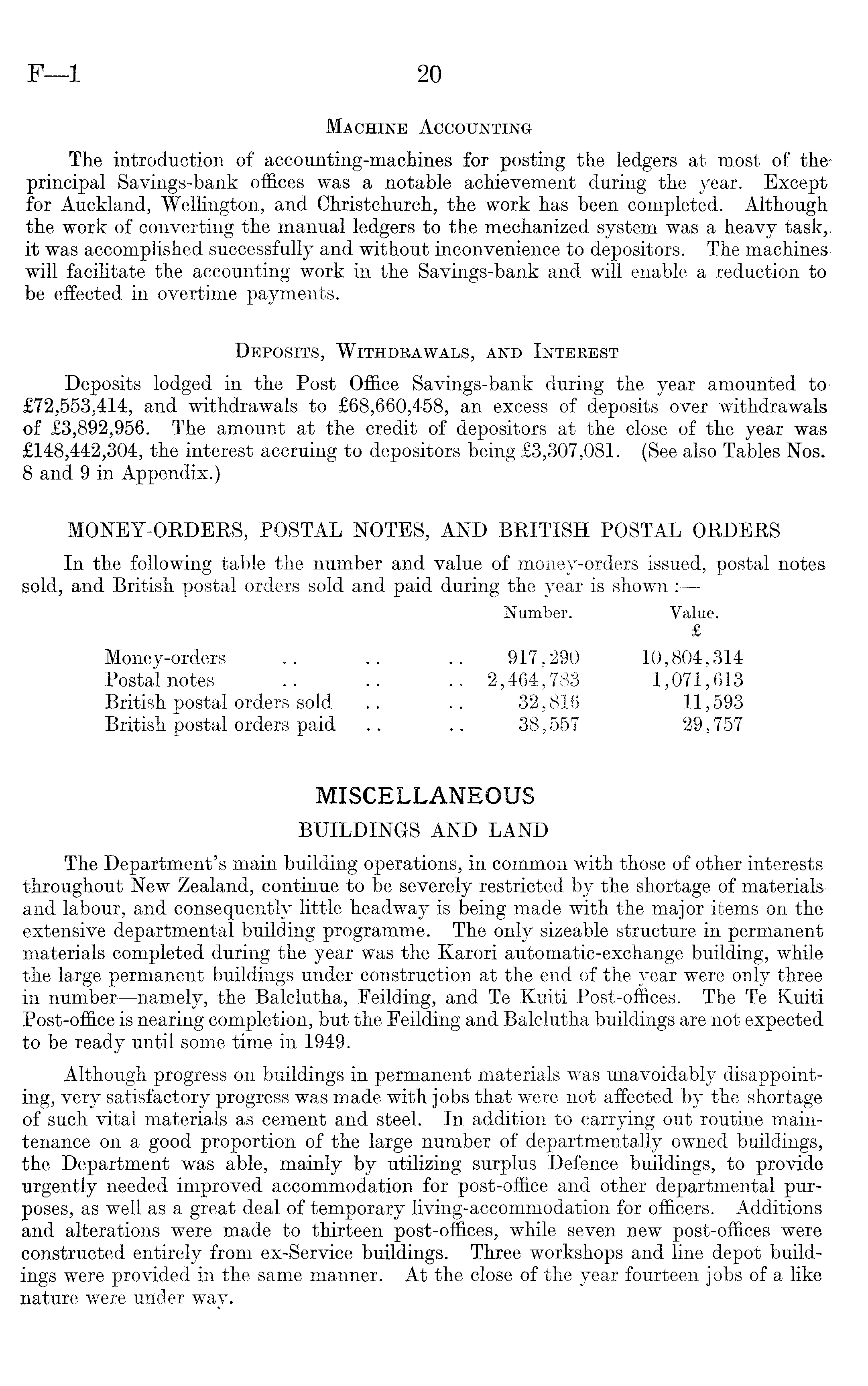 Machine Accounting The introduction of accounting-machines for posting the ledgers at most of the principal Savings-bank offices was a notable achievement during the year. Except for Auckland, Wellington, and Christchurch, the work has been completed. Although the work of converting the manual ledgers to the mechanized system was a heavy task, it was accomplished successfully and without inconvenience to depositors. The machines will facilitate the accounting work in the Savings-bank and will enable a reduction to be effected in overtime payments. Deposits, Withdrawals, and Interest Deposits lodged in the Post Office Savings-bank during the year amounted to £72,553,414, and withdrawals to £68,660,458, an excess of deposits over withdrawals of £3,892,956. The amount at the credit of depositors at the close of the year was £148,442,304, the interest accruing to depositors being £3,307,081. (See also Tables Nos. 8 and 9 in Appendix.) MONEY-ORDERS, POSTAL NOTES, AND BRITISH POSTAL ORDERS In the following table the number and value of money-orders issued, postal notes sold, and British postal orders sold and paid during the year is shown : Number. Value. £ Money-orders .. .. .. 917,290 10,804,314 Postal notes .. .. .. 2,464,783 1,071,613 British postal orders sold .. .. 32,816 11,593 British postal orders paid .. .. 38,557 29,757 MISCELLANEOUS BUILDINGS AND LAND The Department's main building operations, in common with those of other interests throughout New Zealand, continue to be severely restricted by the shortage of materials and labour, and consequently little headway is being made with the major items on the extensive departmental building programme. The only sizeable structure in permanent materials completed during the year was the Karori automatic-exchange building, while the large permanent buildings under construction at the end of the year were only three in number—namely, the Balclutha, Feilding, and Te Kuiti Post-offices. The Te Kuiti Post-office is nearing completion, but the Feilding and Balclutha buildings are not expected to be ready until some time in 1949. Although progress on buildings in permanent materials was unavoidably disappointing, very satisfactory progress was made with jobs that were not affected by the shortage of such vital materials as cement and steel. In addition to carrying out routine maintenance on a good proportion of the large number of departmentally owned buildings, the Department was able, mainly by utilizing surplus Defence buildings, to provide urgently needed improved accommodation for post-office and other departmental purposes, as well as a great deal of temporary living-accommodation for officers. Additions and alterations were made to thirteen post-offices, while seven new post-offices were constructed entirely from ex-Service buildings. Three workshops and line depot buildings were provided in the same manner. At the close of the year fourteen jobs of a like nature were under wav.