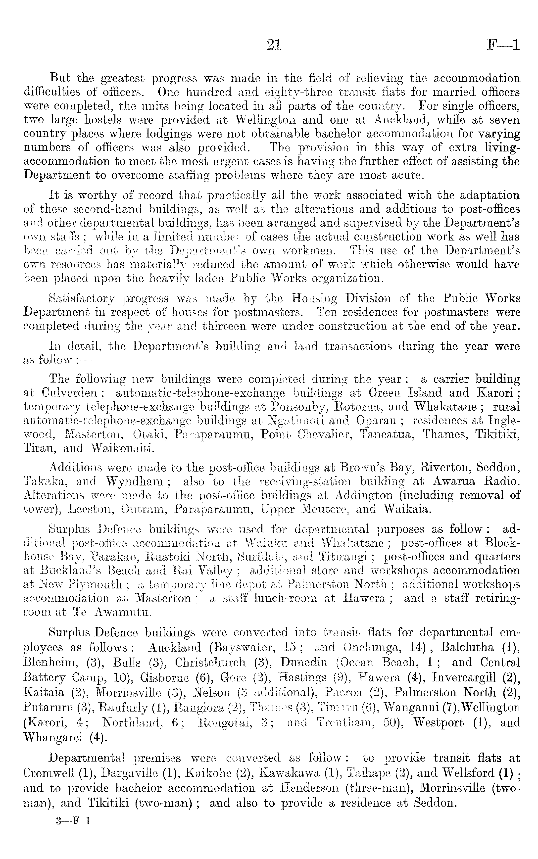 But the greatest progress was made in the field of relieving the accommodation difficulties of officers. One hundred and eighty-three transit flats for married officers were completed, the units being located in all parts of the country. For single officers, .two large hostels were provided at Wellington and one at Auckland, while at seven country places where lodgings were not obtainable bachelor accommodation for varying numbers of officers was also provided. The provision in this way of extra livingaccommodation to meet the most urgent cases is having the further effect of assisting the Department to overcome staffing problems where they are most acute. It is worthy of record that practically all the work associated with the adaptation of these second-hand buildings, as well as the alterations and additions to post-offices and other departmental buildings, has been arranged and supervised by the Department's own staffs ; while in a limited number of cases the actual construction work as well has been carried out by the Department's own workmen. This use of the Department's own resources has materially reduced the amount of work which otherwise would have been placed upon the heavily laden Public Works organization. Satisfactory progress was made by the Housing Division of ,the Public Works Department in respect of houses for postmasters. Ten residences for postmasters were completed during the year and thirteen were under construction at the end of the year. In detail, the Department's building and land transactions during the year were as follow : The following new buildings were completed during the year : a carrier building at Culverden; automatic-telephone-exchange buildings at Green Island and Karori; temporary telephone-exchange buildings at Ponsonby, Rotorua, and Whakatane ; rural automatic-telephone-exchange buildings at Ngatimoti and Oparau ; residences at Inglewood, Masterton, Otaki, Paraparaumu, Point Chevalier, Taneatua, Thames, Tikitiki, Tirau, and Waikouaiti. Additions were made to the post-office buildings at Brown's Bay, Riverton, Seddon, Takaka, and Wyndham; also to the receiving-station building at Awarua Radio. Alterations were made to the post-office buildings at Addington (including removal of tower), Leeston, Outram, Paraparaumu, Upper Moutere, and Waikaia. Surplus Defence buildings were used for departmental purposes as follow : additional post-office accommodation at Waiuku and Whakatane ; post-offices at Blockhouse Bay, Parakao, Ruatoki North, Surfdale, and Titirangi; post-offices and quarters at Buckland's Beach and Rai Yalley; additional store and workshops accommodation at New Plymouth ; a temporary line depot at Palmerston North ; additional workshops accommodation at Masterton ; a staff lunch-room at Hawera ; and a staff retiringroom at Te Awamutu. Surplus Defence buildings were converted into transit flats for departmental employees as follows : Auckland (Bayswater, 15 ; and Onehunga, 14), Balclutha (1), Blenheim, (3), Bulls (3), Christchurch (3), Dunedin (Ocean Beach, 1; and Central Battery Camp, 10), Gisborne (6), Gore (2), Hastings (9), Hawera (4), Invercargill (2), Kaitaia (2), Morrinsville (3), Nelson (3 additional), Paeroa (2), Palmerston North (2), Putaruru (3), Ranfurly (1), Rangiora (2), Thames (3), Timaru (6), Wanganui (7), Wellington (Karori, 4; Northland, 6; Rongotai, 3; and Trentham, 50), Westport (1), and Whangarei (4). Departmental premises were converted as follow: to provide transit flats at Cromwell (1), Dargaville (1), Kaikohe (2), Kawakawa (1), Taihape (2), and Wellsford (1) ; and to provide bachelor accommodation at Henderson (three-man), Morrinsville (twoman), and Tikitiki (two-man); and also to provide a residence at Seddon. 3—F 1