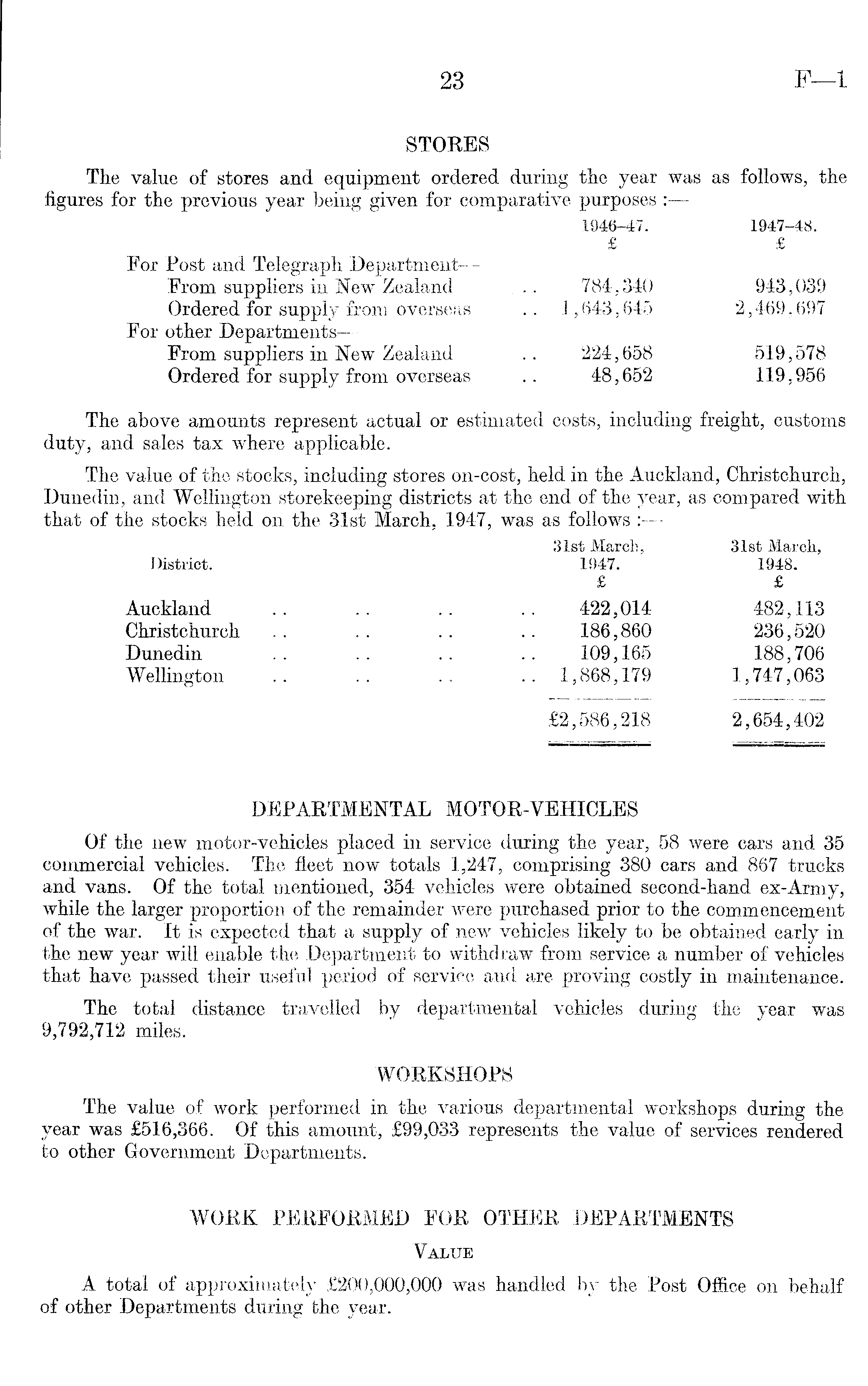 STORES The value of stores and equipment ordered during the year was as follows, the figures for the previous year being given for comparative purposes : 1946-47. 1947-48. .£ £ For Post and Telegraph Department— From suppliers in New Zealand .. 784,340 943,039 Ordered for supply from overseas .. 1,643,645 2,469,697 For other Departments — From suppliers in New Zealand .. 224,658 519,578 Ordered for supply from overseas .. 48,652 119,956 The above amounts represent actual or estimated costs, including freight, customs duty, and sales tax where applicable. The value of the stocks, including stores on-cost, held in the Auckland, Christchurch, Dunedin, and Wellington storekeeping districts at the end of the year, as compared with that of the stocks held on the 31st March, 1947, was as follows : 31st March, 31st March, District. 1947. 1948. £ £ Auckland .. .. .. .. 422,014 482,113 Christchurch .. .. .. .. 186,860 236,520 Dunedin .. .. .. .. 109,165 188,706 Wellington .. .. .. .. 1,868,179 1,747,063 £2,586,218 2,654,402 DEPARTMENTAL MOTOR-VEHICLES Of the new motor-vehicles placed in service during the year, 58 were cars and 35 commercial vehicles. The fleet now totals 1,247, comprising 380 cars and 867 trucks and vans. Of the total mentioned, 354 vehicles were obtained second-hand ex-Army, while the larger proportion of the remainder were purchased prior to the commencement of the war. It is expected that a supply of new vehicles likely to be obtained early in the new year will enable the Department to withdraw from service a number of vehicles that have passed their useful period of service and are proving costly in maintenance. The total distance travelled by departmental vehicles during the year was 9,792,712 miles. WORKSHOPS The value of work performed in the various departmental workshops during the year was £516,366. Of this amount, £99,033 represents the value of services rendered to other Government Departments. WORK PERFORMED FOR OTHER DEPARTMENTS Value A total of approximately £200,000,000 was handled by the Post Office on behalf of other Departments during the year.