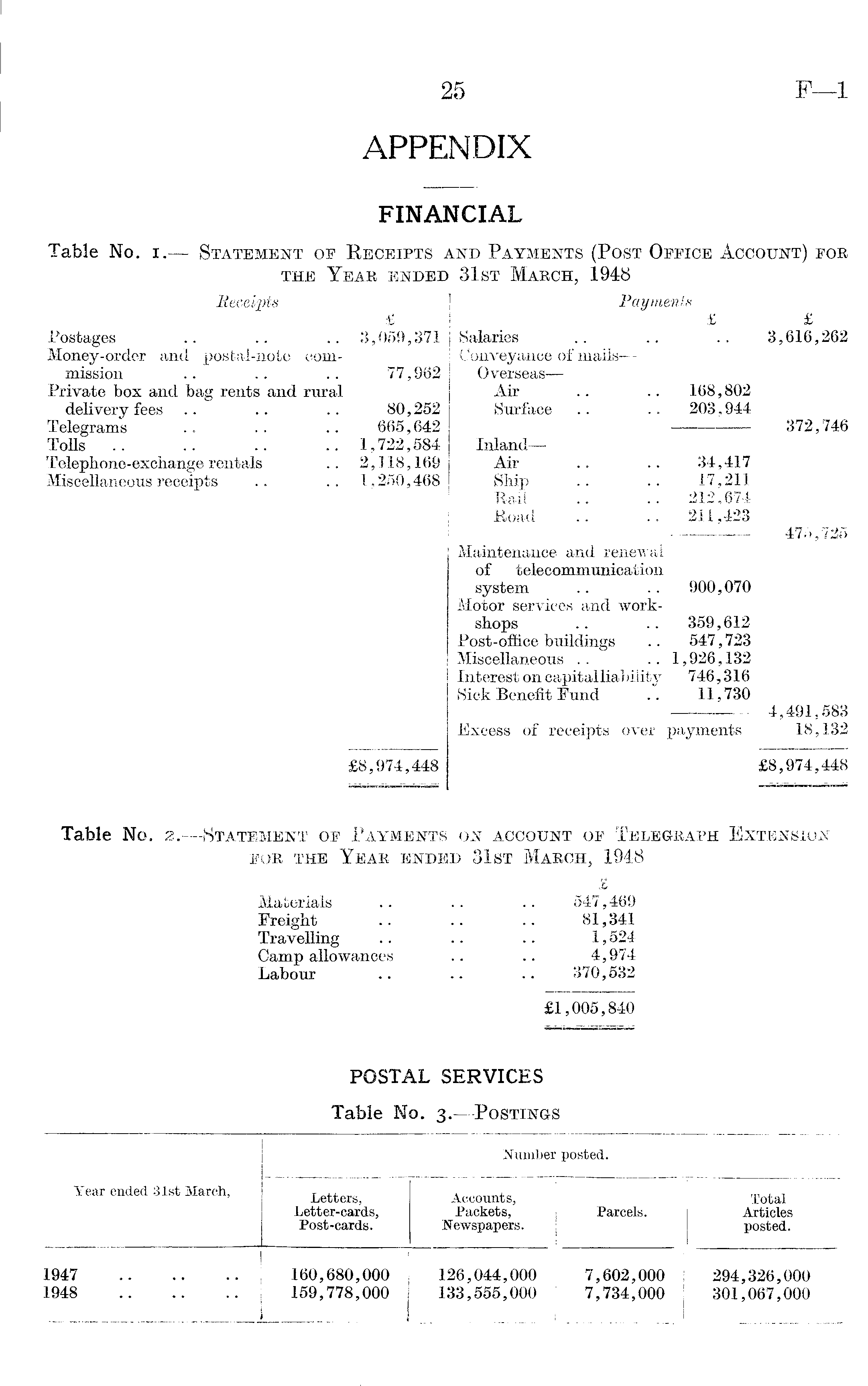 Number posted. Year ended 31st March, Letters, Letter-cards, Post-caxds. Accounts, Packets, Newspapers. i Parcels. Total Articles posted. ! 1947 1948 | ! | 160,680,000 j 159,778,000 1 1 126,044,000 133,555,000 : i 7,602,000 1 7,734,000 294,326,000 301,067,000