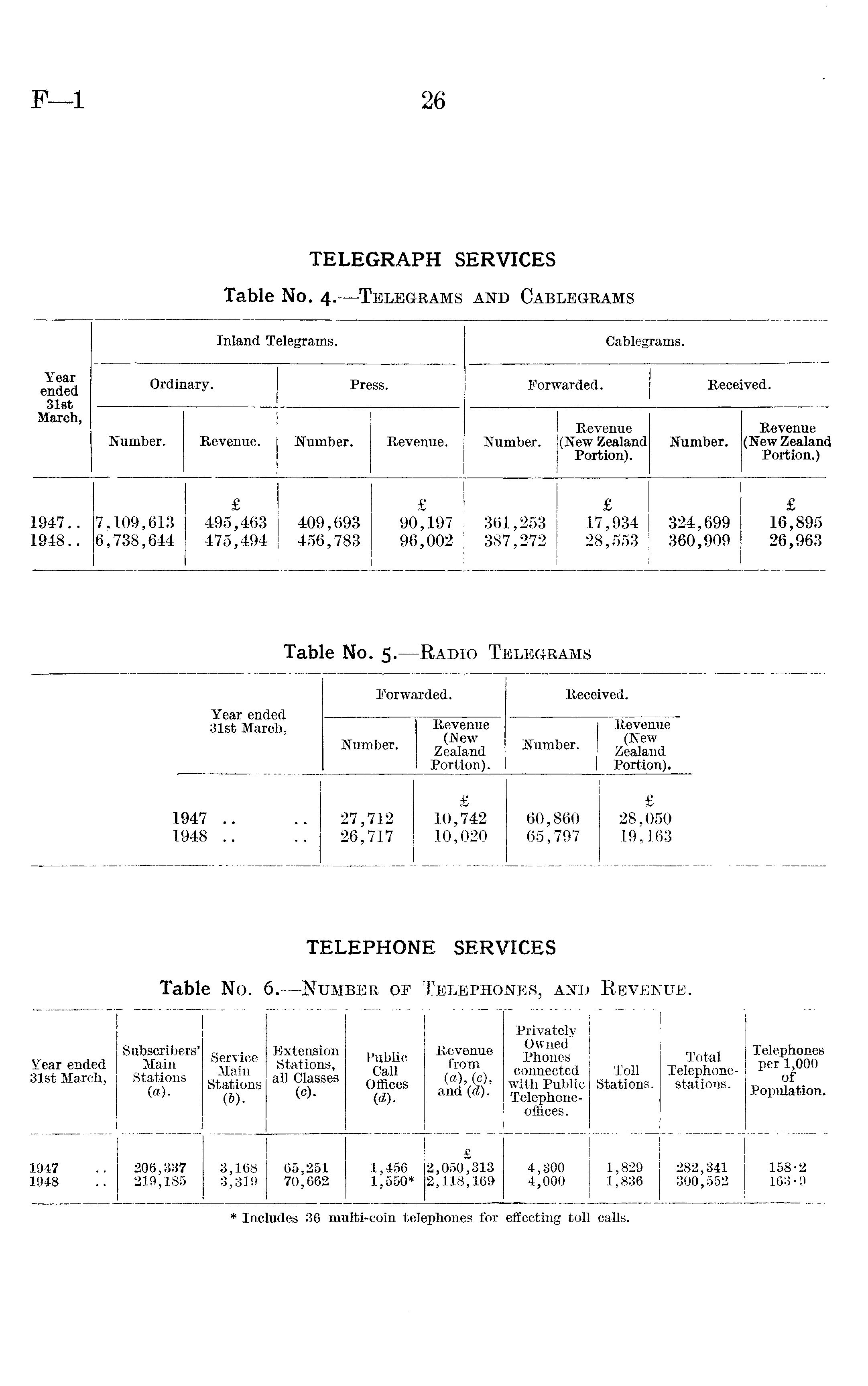 Inland Telegrams. Cablegrams. Year ended 31st March, Ordinary. Press. Forwarded. Received. Number. Revenue. Number. Revenue. Number. Revenue (New Zealand Portion). Number. Revenue (New Zealand Portion.) 1947.. 1948.. 7,109,613 6,738,644 £ 495,463 475,494 409,693 456,783 £ 90,197 96,002 361,253 387,272 £ 17,934 28,553 324,699 360,909 £ 16,895 26,963