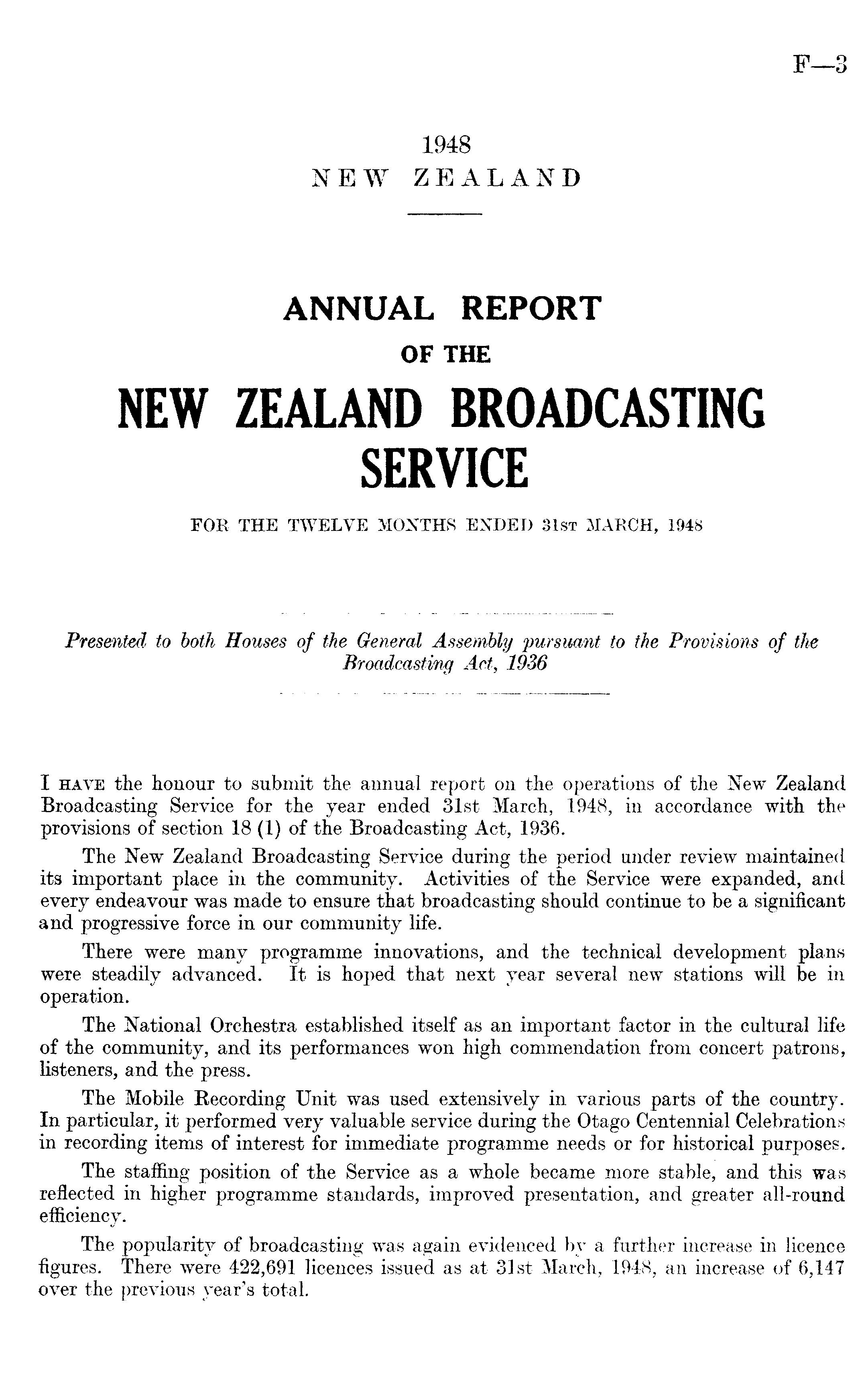 I have the honour to submit the annual report on the operations of the New Zealand Broadcasting Service for the year ended 31st March, 1948, in accordance with the provisions of section 18 (1) of the Broadcasting Act, 1936. The New Zealand Broadcasting Service during the period under review maintained its important place in the community. Activities of the Service were expanded, and every endeavour was made to ensure that broadcasting should continue to be a significant and progressive force in our community life. There were many programme innovations, and the technical development plans were steadily advanced. It is hoped that next year several new stations will be in operation. The National Orchestra established itself as an important factor in the cultural life of the community, and its performances won high commendation from concert patrons, listeners, and the press. The Mobile Recording Unit was used extensively in various parts of the country. In particular, it performed very valuable service during the Otago Centennial Celebrations in recording items of interest for immediate programme needs or for historical purposes. The staffing position of the Service as a whole became more stable, and this was reflected in higher programme standards, improved presentation, and greater all-round efficiency. The popularity of broadcasting was again evidenced by a further increase in licence figures. There were 422,691 licences issued as at 31st March, 1948, an increase of 6,147 over the previous year's total.