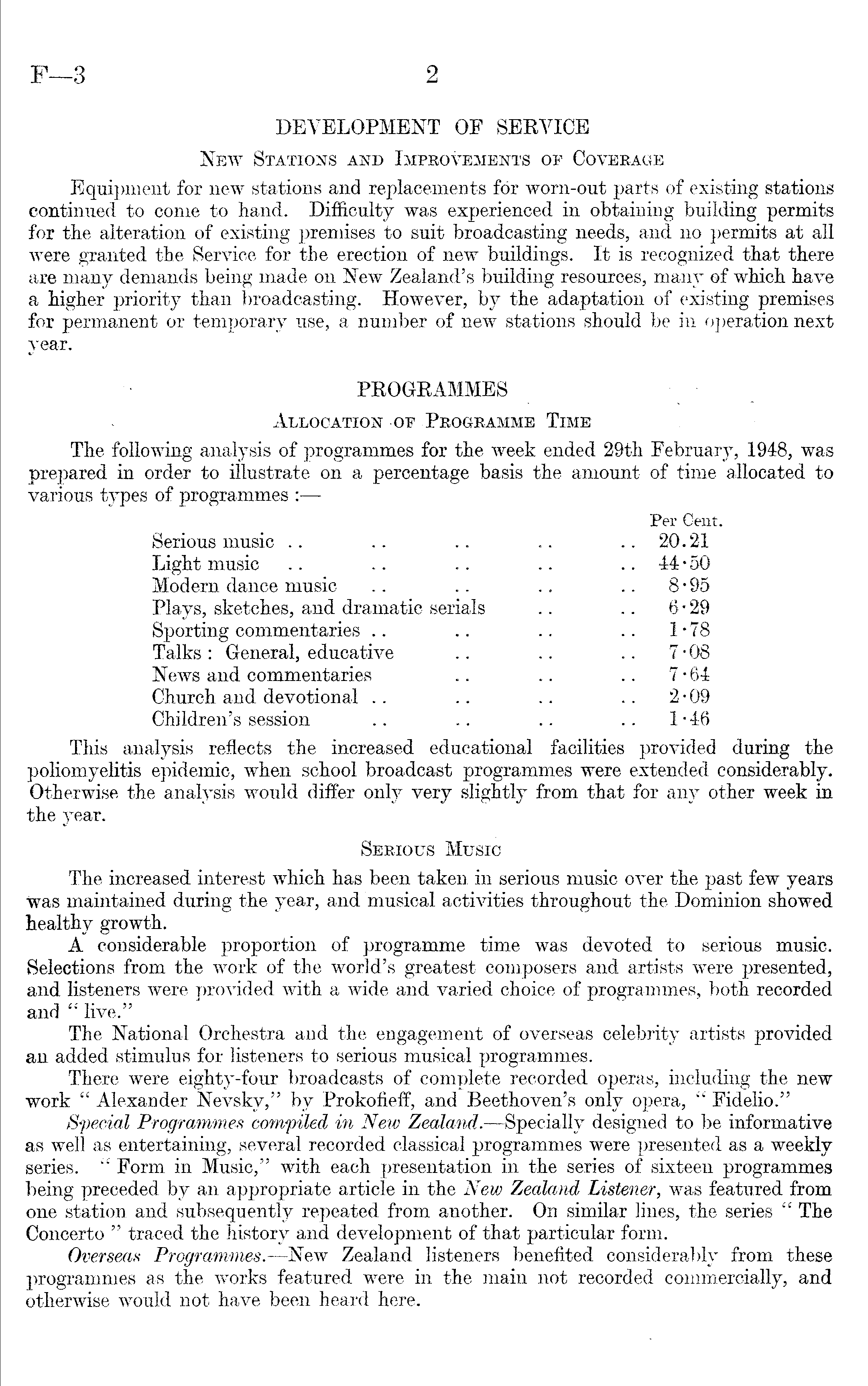 DEVELOPMENT OF SERVICE New Stations and Improvements of Coverage Equipment for new stations and replacements for worn-out parts of existing stations continued to come to hand. Difficulty was experienced in obtaining building permits for the alteration of existing premises to suit broadcasting needs, and no permits at all were granted the Service for the erection of new buildings. It is recognized that there are many demands being made on New Zealand's building resources, many of which have a higher priority than broadcasting. However, by the adaptation of existing premises for permanent or temporary use, a number of new stations should be in operation next year. PROGRAMMES Allocation of Programme Time The following analysis of programmes for the week ended 29th February, 1948, was prepared in order to illustrate on a percentage basis the amount of time allocated to various types of programmes Per Cent. Serious music .. .. .. .. .. 20.21 Light music .. .. .. .. .. 44*50 Modern dance music .. .. .. .. 8 • 95 Plays, sketches, and dramatic serials .. .. 6-29 Sporting commentaries .. .. .. .. 1-78 Talks : General, educative .. .. .. 7* 08 News and commentaries .. .. .. 7-64 Church and devotional .. .. .. .. 2-09 Children's session .. .. .. .. 1*46 This analysis reflects the increased educational facilities provided during the poliomyelitis epidemic, when school broadcast programmes were extended considerably. Otherwise the analysis would differ only very slightly from that for any other week in the year. Serious Music The increased interest which has been taken in serious music over the past few years was maintained during the year, and musical activities throughout the Dominion showed healthy growth. A considerable proportion of programme time was devoted to serious music. Selections from the work of the world's greatest composers and artists were presented, and listeners were provided with a wide and varied choice of programmes, both recorded and " live." The National Orchestra and the engagement of overseas celebrity artists provided an added stimulus for listeners to serious musical programmes. There were eighty-four broadcasts of complete recorded operas, including the new work " Alexander Nevskv," by Prokofieff, and Beethoven's only opera, " Fidelio." Special Programmes compiled in New Zealand. —Specially designed to be informative as well as entertaining, several recorded classical programmes were presented as a weekly series. " Form in Music," with each presentation in the series of sixteen programmes being preceded by an appropriate article in the New Zealand Listener, was featured from one station and subsequently repeated from another. On similar lines, the series " The Concerto " traced the history and development of that particular form. Overseas Programmes.—New Zealand listeners benefited considerably from these programmes as the works featured were in the main not recorded commercially, and otherwise would not have been heard here.