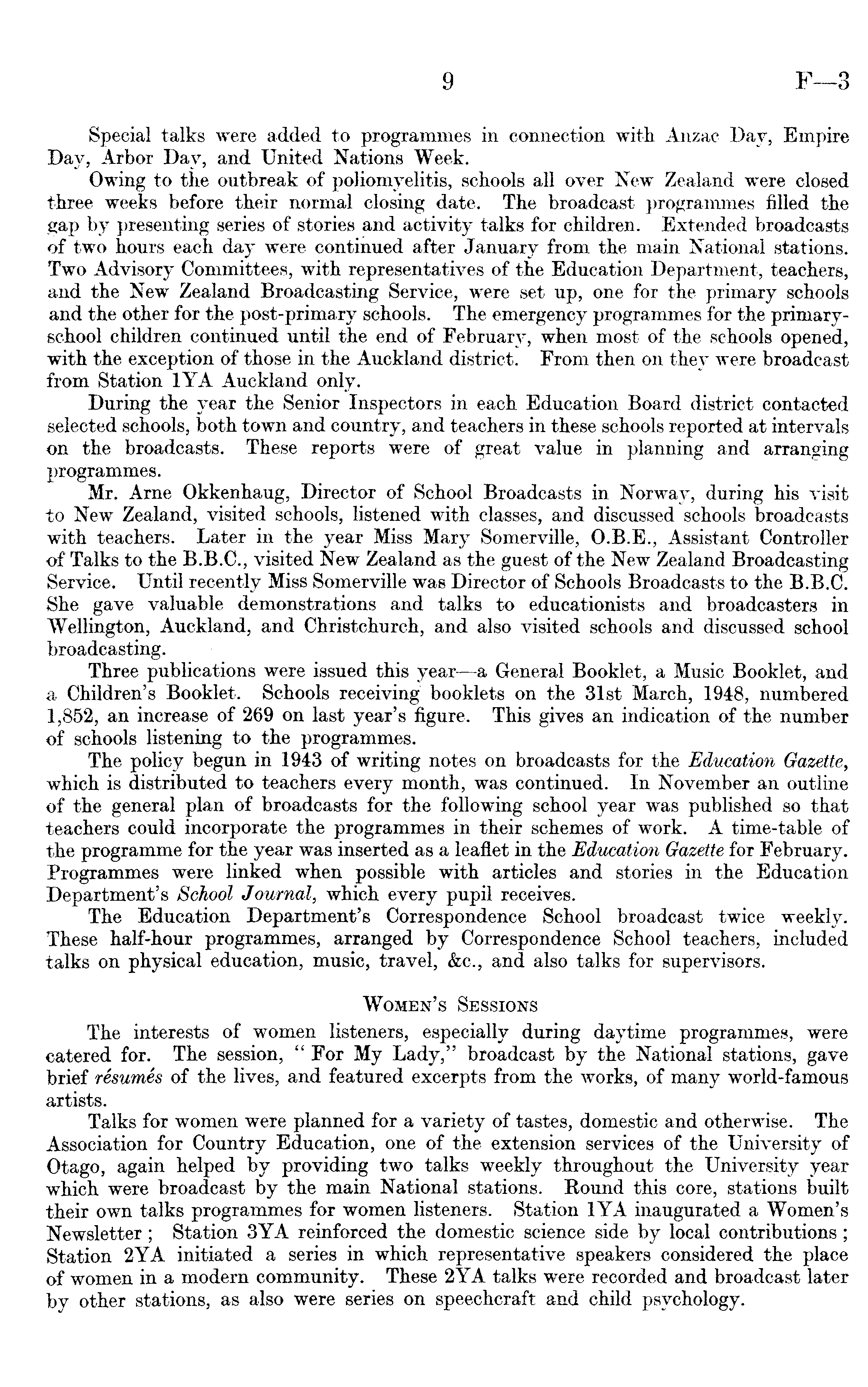 Special talks were added to programmes in connection with Anzac Day, Empire Day, Arbor Day, and United Nations Week. Owing to the outbreak of poliomyelitis, schools all over New Zealand were closed three weeks before their normal closing date. The broadcast programmes filled the gap by presenting series of stories and activity talks for children. Extended broadcasts of two hours each day were continued after January from the main National stations. Two Advisory Committees, with representatives of the Education Department, teachers, and the New Zealand Broadcasting Service, were set up, one for the primary schools and the other for the post-primary schools. The emergency programmes for the primaryschool children continued until the end of February, when most of the schools opened, with the exception of those in the Auckland district. From then on they were broadcast from Station IYA Auckland only. During the year the Senior Inspectors in each Education Board district contacted selected schools, both town and country, and teachers in these schools reported at intervals on the broadcasts. These reports were of great value in planning and arranging programmes. Mr. Arne Okkenhaug, Director of School Broadcasts in Norway, during his visit to New Zealand, visited schools, listened with classes, and discussed schools broadcasts with teachers. Later in the year Miss Mary Somerville, 0.8. E., Assistant Controller of Talks to the 8.8.C., visited New Zealand as the guest of the New Zealand Broadcasting Service. Until recently Miss Somerville was Director of Schools Broadcasts to the 8.8.C. She gave valuable demonstrations and talks to educationists and broadcasters in Wellington, Auckland, and Christchurch, and also visited schools and discussed school broadcasting. Three publications were issued this year —a General Booklet, a Music Booklet, and a Children's Booklet. Schools receiving booklets on the 31st March, 1948, numbered 1,852, an increase of 269 on last year's figure. This gives an indication of the number of schools listening to the programmes. The policy begun in 1943 of writing notes on broadcasts for the Education Gazette, which is distributed to teachers every month, was continued. In November an outline of the general plan of broadcasts for the following school year was published so that teachers could incorporate the programmes in their schemes of work. A time-table of the programme for the year was inserted as a leaflet in the Education Gazette for February. Programmes were linked when possible with articles and stories in the Education Department's School Journal, which every pupil receives. The Education Department's Correspondence School broadcast twice weekly. These half-hour programmes, arranged by Correspondence School teachers, included talks on physical education, music, travel, &c., and also talks for supervisors. Women's Sessions The interests of women listeners, especially during daytime programmes, were catered for. The session, " For My Lady," broadcast by the National stations, gave brief resumes of the lives, and featured excerpts from the works, of many world-famous artists. Talks for women were planned for a variety of tastes, domestic and otherwise. The Association for Country Education, one of the extension services of the University of Otago, again helped by providing two talks weekly throughout the University year which were broadcast by the main National stations. Round this core, stations built their own talks programmes for women listeners. Station IYA inaugurated a Women's Newsletter; Station 3YA reinforced the domestic science side by local contributions; Station 2YA initiated a series in which representative speakers considered the place of women in a modern community. These 2YA talks were recorded and broadcast later by other stations, as also were series on speechcraft and child psychology.