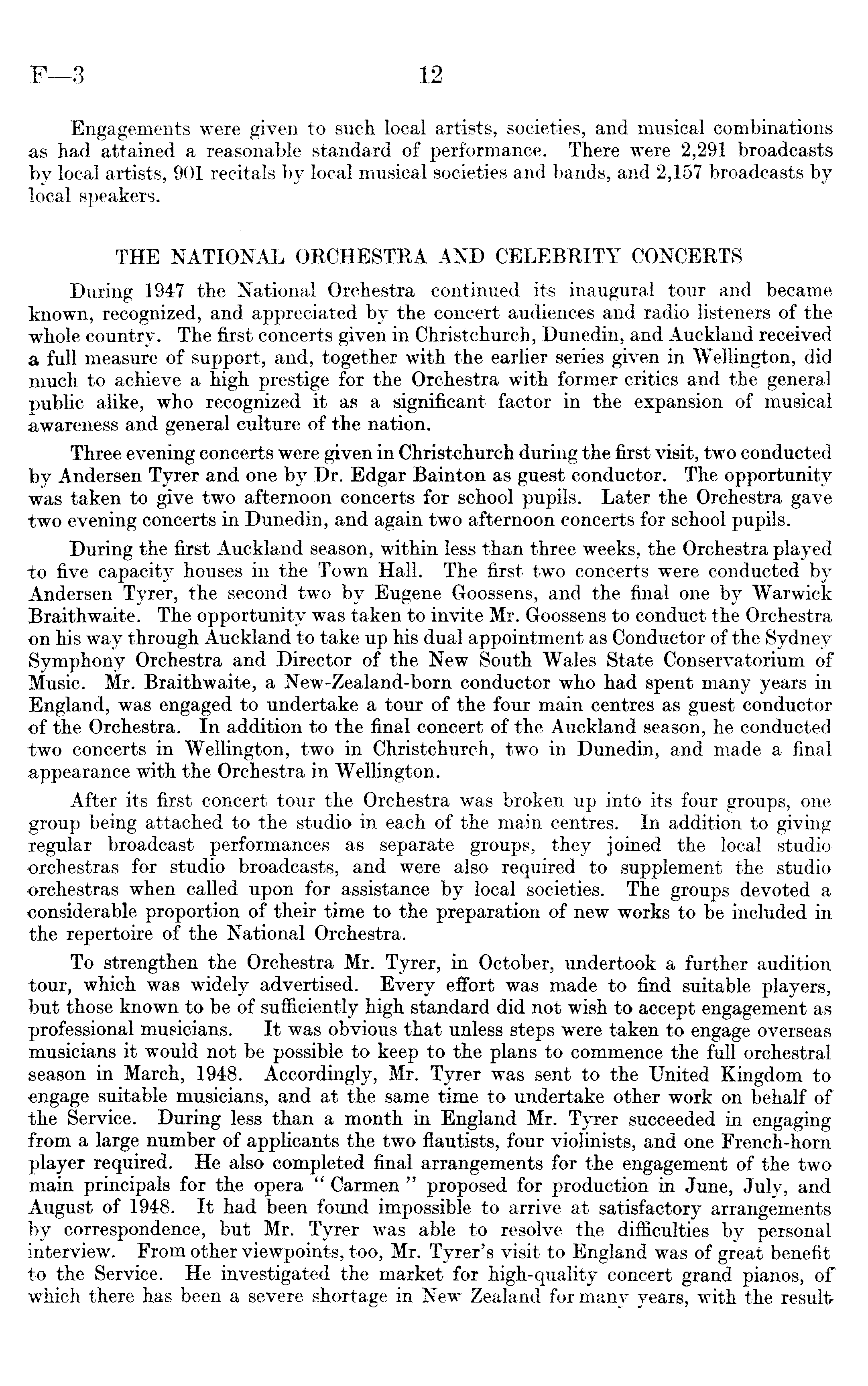 Engagements were given to such local artists, societies, and musical combinations as had attained a reasonable standard of performance. There were 2,291 broadcasts by local artists, 901 recitals by local musical societies and bands, and 2,157 broadcasts by local speakers. THE NATIONAL ORCHESTRA AND CELEBRITY CONCERTS During 1947 the National Orchestra continued its inaugural tour and became known, recognized, and appreciated by the concert audiences and radio listeners of the whole country. The first concerts given in Christ church, Dunedin, and Auckland received a full measure of support, and, together with the earlier series given in Wellington, did much to achieve a high prestige for the Orchestra with former critics and the general public alike, who recognized it as a significant factor in the expansion of musical awareness and general culture of the nation. Three evening concerts were given in Christchurch during the first visit, two conducted by Andersen Tyrer and one by Dr. Edgar Bainton as guest conductor. The opportunity was taken to give two afternoon concerts for school pupils. Later the Orchestra gave two evening concerts in Dunedin, and again two afternoon concerts for school pupils. During the first Auckland season, within less than three weeks, the Orchestra played to five capacity houses in the Town Hall. The first two concerts were conducted by Andersen Tyrer, the second two by Eugene Goossens, and the final one by Warwick Braithwaite. The opportunity was taken to invite Mr. Goossens to conduct the Orchestra on his way through Auckland to take up his dual appointment as Conductor of the Sydney Symphony Orchestra and Director of the New South Wales State Conservatorium of Music. Mr. Braithwaite, a New-Zealand-born conductor who had spent many years in England, was engaged to undertake a tour of the four main centres as guest conductor of the Orchestra. In addition to the final concert of the Auckland season, he conducted two concerts in Wellington, two in Christchurch, two in Dunedin, and made a final appearance with the Orchestra in Wellington. After its first concert tour the Orchestra was broken up into its four groups, one group being attached to the studio in each of the main centres. In addition to giving regular broadcast performances as separate groups, they joined the local studio orchestras for studio broadcasts, and were also required to supplement the studio orchestras when called upon for assistance by local societies. The groups devoted a considerable proportion of their time to the preparation of new works to be included in the repertoire of the National Orchestra. To strengthen the Orchestra Mr. Tyrer, in October, undertook a further audition tour, which was widely advertised. Every effort was made to find suitable players, but those known to be of sufficiently high standard did not wish to accept engagement as professional musicians. It was obvious that unless steps were taken to engage overseas musicians it would not be possible to keep to the plans to commence the full orchestral season in March, 1948. Accordingly, Mr. Tyrer was sent to the United Kingdom to engage suitable musicians, and at the same time to undertake other work on behalf of the Service. During less than a month in England Mr. Tyrer succeeded in engaging from a large number of applicants the two flautists, four violinists, and one French-horn player required. He also completed final arrangements for the engagement of the two main principals for the opera " Carmen " proposed for production in June, July, and August of 1948. It had been found impossible to arrive at satisfactory arrangements by correspondence, but Mr. Tyrer was able to resolve the difficulties by personal interview. From other viewpoints, too, Mr. Tyrer's visit to England was of great benefit to the Service. He investigated the market for high-quality concert grand pianos, of which there has been a severe shortage in New Zealand for many years, with the result