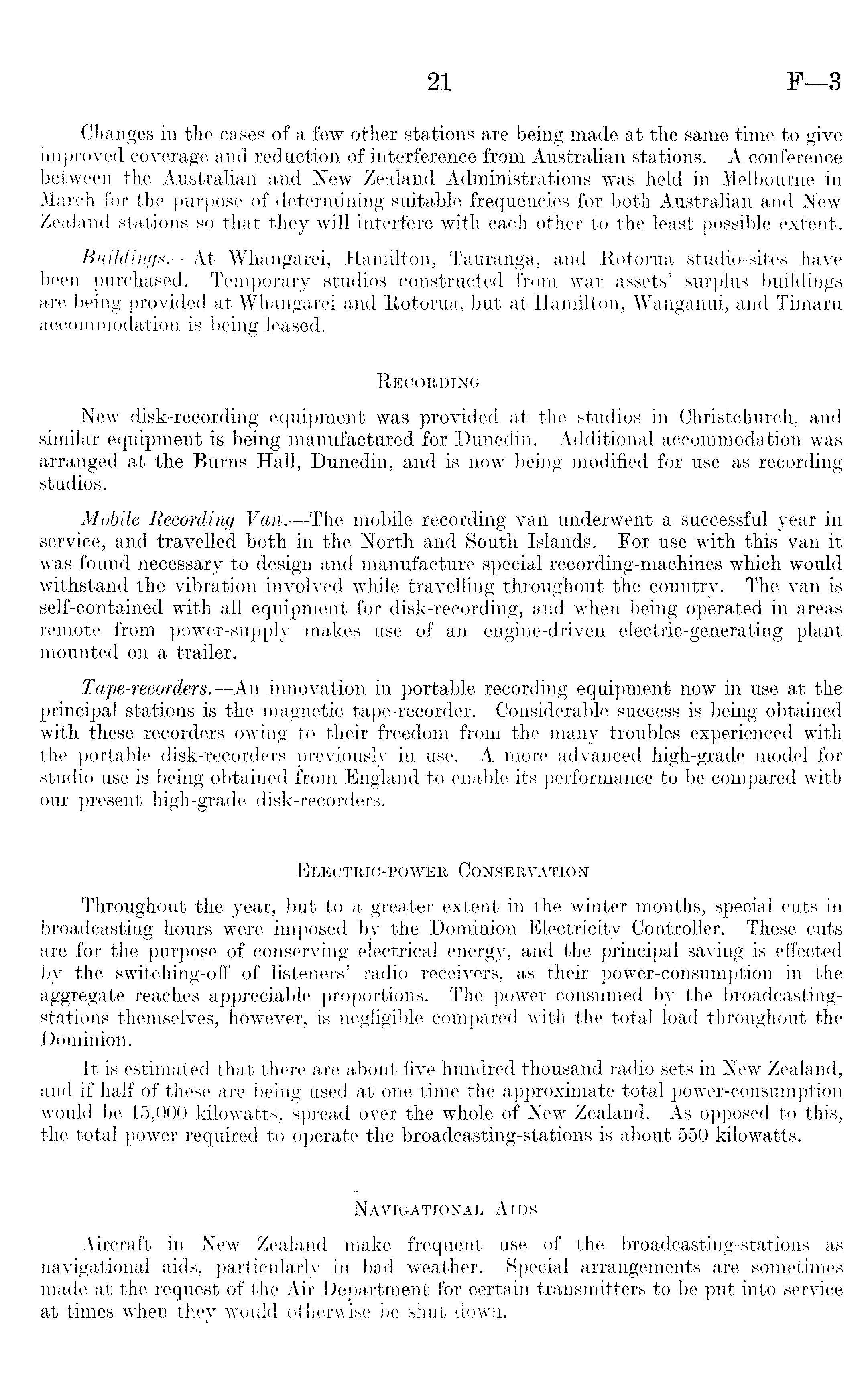 Changes in the cases of a few other stations are being made at the same time to give improved, coverage and reduction of interference from Australian stations. A conference between the Australian and New Zealand Administrations was held in Melbourne in March for the purpose of determining suitable frequencies for both Australian and New Zealand stations so that they will interfere with each other to the least possible extent. Buildings.—At Whangarei, Hamilton, Tauranga, and Rotorua studio-sites have been purchased. Temporary studios constructed from war assets' surplus buildings are being provided at Whangarei and Rotorua, but at Hamilton, Wanganui, and Timaru accommodation is being leased. Recording New disk-recording equipment was provided at the studios in Christchurch, and similar equipment is being manufactured for Dunedin. Additional accommodation was arranged at the Burns Hall, Dunedin, and is now being modified for use as recording studios. Mobile Recording Van. —The mobile recording van underwent a successful year in service, and travelled both in the North and South Islands. For use with this van it was found necessary to design and manufacture special recording-machines which would withstand the vibration involved while travelling throughout the country. The van is self-contained with all equipment for disk-recording, and when being operated in areas remote from power-supply makes use of an engine-driven electric-generating plant mounted on a trailer. Tape-recorders. —An innovation in portable recording equipment now in use at the principal stations is the magnetic tape-recorder. Considerable success is being obtained with these recorders owing to their freedom from the many troubles experienced with the portable disk-recorders previously in use. A more advanced high-grade model for studio use is being obtained from England to enable its performance to be compared with our present high-grade disk-recorders. Electric-power Conservation Throughout the year, but to a greater extent in the winter months, special cuts in broadcasting hours were imposed by the Dominion Electricity Controller. These cuts are for the purpose of conserving electrical energy, and the principal saving is effected by the switching-off of listeners' radio receivers, as their power-consumption in the aggregate reaches appreciable proportions. The power consumed by the broadcastingstations themselves, however, is negligible compared with the total load throughout the Dominion. It is estimated that there are about five hundred thousand radio sets in New Zealand, and if half of these are being used at one time the approximate total power-consumption would be 15,000 kilowatts, spread over the whole of New Zealand. As opposed to this, the total power required to operate the broadcasting-stations is about 550 kilowatts. Navigational Aids Aircraft in New Zealand make frequent use of the broadcasting-stations as navigational aids, particularly in bad weather. Special arrangements are sometimes made at the request of the Air Department for certain transmitters to be put into service at times when thev would otherwise be shut down.