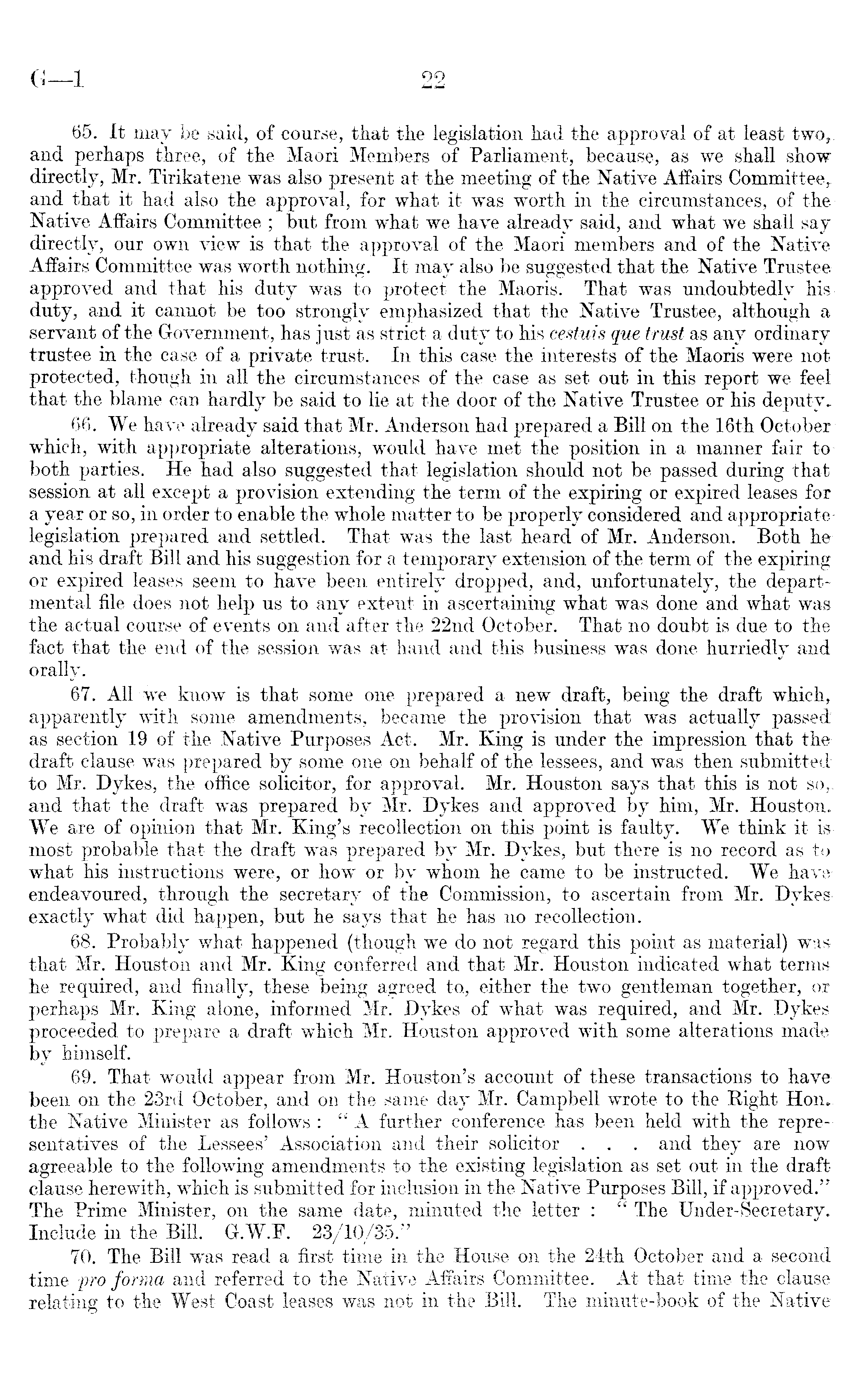 65. It may be said, of course, that the legislation had the approval of at least two r and perhaps three, of the Maori Members of Parliament, because, as we shall show directly, Mr. Tirikatene was also present at the meeting of the Native Affairs Committee, and that it had also the approval, for what it was worth in the circumstances, of theNative Affairs Committee ; but from what we have already said, and what we shall say directly, our own view is that the approval of the Maori members and of the Native Affairs Committee was worth nothing. It may also be suggested that the Native Trustee approved and that his duty was to protect the Maoris. That was undoubtedly his duty, and it cannot be too strongly emphasized that the Native Trustee, although a servant of the Government, has just as strict a duty to his cestuis que trust as any ordinary trustee in the case of a private trust. In this case the interests of the Maoris were not protected, though in all the circumstances of the case as set out in this report we feel that the blame can hardly be said to lie at the door of the Native Trustee or his deputy. 66. We have already said that Mr. Anderson had prepared a Bill on the 16th October which, with appropriate alterations, would have met the position in a manner fair toboth parties. He had also suggested that legislation should not be passed during that session at all except a provision extending the term of the expiring or expired leases for a year or so, in order to enable the whole matter to be properly considered and appropriatelegislation prepared and settled. That was the last heard of Mr. Anderson. Both heand his draft Bill and his suggestion for a temporary extension of the term of the expiring or expired leases seem to have been entirely dropped, and, unfortunately, the departmental file does not help us to any extent in ascertaining what was done and what was the actual course of events on and after the 22nd October. That no doubt is due to the fact that the end of the session was at hand and this business was done hurriedly and orally. 67. All we know is that some one prepared a new draft, being the draft which, apparently with some amendments, became the provision that was actually passed; as section 19 of the Native Purposes Act. Mr. King is under the impression that the draft clause was prepared by some one on behalf of the lessees, and was then submitted to Mr. Dykes, the office solicitor, for approval. Mr. Houston says that this is not 50... and that the draft was prepared by Mr. Dykes and approved by him, Mr. Houston. "We are of opinion that Mr. King's recollection on this point is faulty. We think it is most probable that the draft was prepared by Mr. Dykes, but there is no record as towhat his instructions were, or how or by whom he came to be instructed. We haveendeavoured, through the secretary of the Commission, to ascertain from Mr. Dykes exactly what did happen, but he says that he has no recollection. 68. Probably what happened (though we do not regard this point as material) was that Mr. Houston and Mr. King conferred and that Mr. Houston indicated what terms he required, and finally, these being agreed to., either the two gentleman together, or perhaps Mr. King alone, informed Mr. Dykes of what was required, and Mr. Dykes proceeded to prepare a draft which Mr. Houston approved with some alterations made by himself. 69. That would appear from Mr. Houston's account of these transactions to have been on the 23rd October, and on the same day Mr. Campbell wrote to the Eight Hon.. the Native Minister as follows : "A further conference has been held with the representatives of the Lessees' Association and their solicitor . . . and they are now agreeable to the following amendments to the existing legislation as set out in the draft clause herewith, which is submitted for inclusion in the Native Purposes Bill, if approved." The Prime Minister, on the same date, minuted the letter : " The Under-Secretary. Include in the Bill. G.W.F. 23/10/35." 70. The Bill was read a first time in the House on the 24th October and a second time pro forma and referred to the Native Affairs Committee. At that time the clause relating to the West Coast leases was not in the Bill. The minute-book of the Native