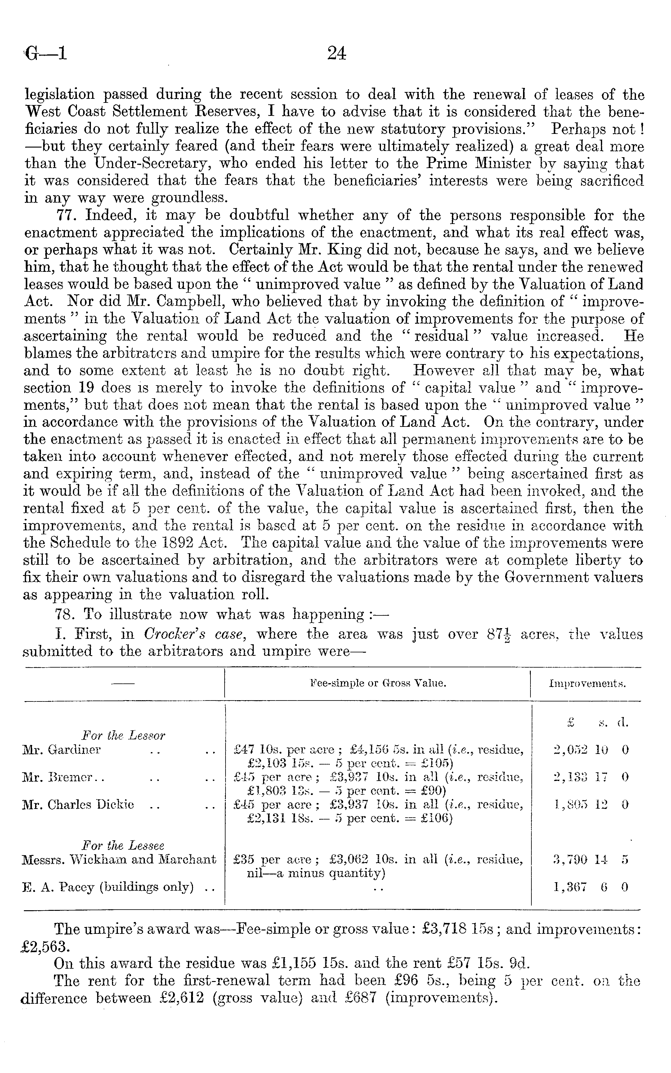 legislation passed during the recent session to deal with the renewal of leases of the West Coast Settlement Reserves, I have to advise that it is considered that the beneficiaries do not fully realize the effect of the new statutory provisions." Perhaps not! —but they certainly feared (and their fears were ultimately realized) a great deal more than the Under-Secretary, who ended his letter to the Prime Minister by saying that it was considered that the fears that the beneficiaries' interests were being sacrificed in any way were groundless. 77. Indeed, it may be doubtful whether any of the persons responsible for the enactment appreciated the implications of the enactment, and what its real effect was, or perhaps what it was not. Certainly Mr. King did not, because he says, and we believe him, that he thought that the effect of the Act would be that the rental under the renewed leases would be based upon the " unimproved value " as defined by the Valuation of Land Act. Nor did Mr. Campbell, who believed that by invoking the definition of " improvements " in the Valuation of Land Act the valuation of improvements for the purpose of ascertaining the rental would be reduced and the " residual" value increased. He blames the arbitrators and umpire for the results which were contrary to his expectations, and to some extent at least he is no doubt right. However all that may be, what section 19 does is merely to invoke the definitions of " capital value " and " improvements," but that does not mean that the rental is based upon the " unimproved value " in accordance with the provisions of the Valuation of Land Act. On the contrary, under the enactment as passed it is enacted in effect that all permanent improvements are to be taken into account whenever effected, and not merely those effected during the current and expiring term, and, instead of the " unimproved value " being ascertained first as it would be if all the definitions of the Valuation of Land Act had been invoked, and the rental fixed at 5 per cent, of the value, the capital value is ascertained first, then the improvements, and the rental is based at 5 per cent, on the residue in accordance with the Schedule to the 1892 Act. The capital value and the value of the improvements were still to be ascertained by arbitration, and the arbitrators were at complete liberty to fix their own valuations and to disregard the valuations made by the Government valuers ■as appearing in the valuation roll.