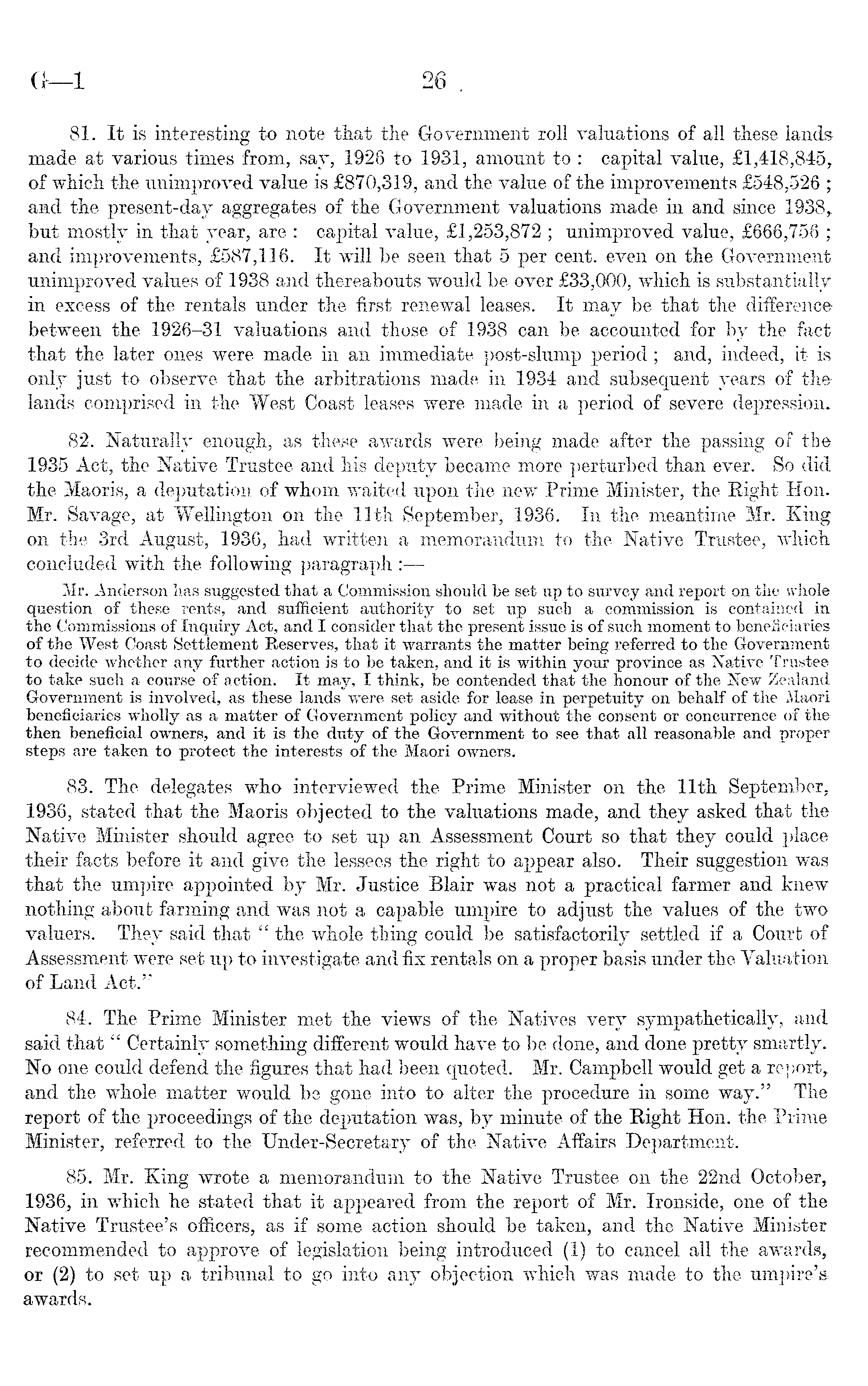 81. It is interesting to note that the Government roll valuations of all these lands made at various times from, say, 1926 to 1931, amount to : capital value, £1,418,845, of which the unimproved value is £870,319, and the value of the improvements £548,526 ; and the present-day aggregates of the Government valuations made in and since 1938, but mostly in that year, are : capital value, £1,253,872 ; unimproved value, £668,756 ; and improvements, £587,116. It will be seen that 5 per cent, even on the Government unimproved values of 1938 and thereabouts would be over £33,000, which is substantially in excess of the rentals under the first renewal leases. It may be that the difference between the 1926-31 valuations and those of 1938 can be accounted for by the fact that the later ones were made in an immediate post-slump period ; and, indeed, it is only just to observe that the arbitrations made in 1934 and subsequent years of the lands comprised in the West Coast leases were made in a period of severe depression. 82. Naturally enough, as these awards were being made after the passing of the 1935 Act, the Native Trustee and his deputy became more perturbed than ever. So did the Maoris, a deputation of whom waited upon the new Prime Minister, the Right Hon. Mr. Savage, at Wellington on the 11th September, 1936. In the meantime Mr. King on the 3rd August, 1936, had written a memorandum to the Native Trustee, which concluded with the following paragraph : —- Mr. Anderson has suggested that a Commission should be set up to survey and report on the whole question of these rents, and sufficient authority to set up such a commission is contained in the Commissions of Inquiry Act, and I consider that the present issue is of such moment to beneficiaries of the West Coast Settlement Reserves, that it warrants the matter being referred to the Government to decide whether any further action is to be taken, and it is within your province as Native Trustee to take such a course of action. It may, I think, be contended that the honour of the New Zealand Government is involved, as these lands were set aside for lease in perpetuity on behalf of the Maori beneficiaries wholly as a matter of Government policy and without the consent or concurrence of the then beneficial owners, and it is the duty of the Government to see that all reasonable and proper steps are taken to protect the interests of the Maori owners. 83. The delegates who interviewed the Prime Minister on the 11th September, 1936, stated that the Maoris objected to the valuations made, and they asked that the Native Minister should agree to set up an Assessment Court so that they could place their facts before it and give the lessees the right to appear also. Their suggestion was that the umpire appointed by Mr. Justice Blair was not a practical farmer and knew nothing about farming and was not a capable umpire to adjust the values of the two valuers. They said that " the whole thing could be satisfactorily settled if a Court of Assessment were set up to investigate and fix rentals on a proper basis under the Valuation of Land Act." 84. The Prime Minister met the views of the Natives very sympathetically, and said that " Certainly something different would have to be done, and done pretty smartly. No one could defend the figures that had been quoted. Mr. Campbell would get a report,, and the whole matter would be gone into to alter the procedure in some way." The report of the proceedings of the deputation was, by minute of the Right Hon. the Prime Minister, referred to the Under-Secretary of the Native Affairs Department. 85. Mr. King wrote a memorandum to the Native Trustee on the 22nd October, 1936, in which he stated that it appeared from the report of Mr. Ironside, one of the Native Trustee's officers, as if some action should be taken, and the Native Minister recommended to approve of legislation being introduced (1) to cancel all the awards,, or (2) to set up a tribunal to go into any objection which was made to the umpire's awards.