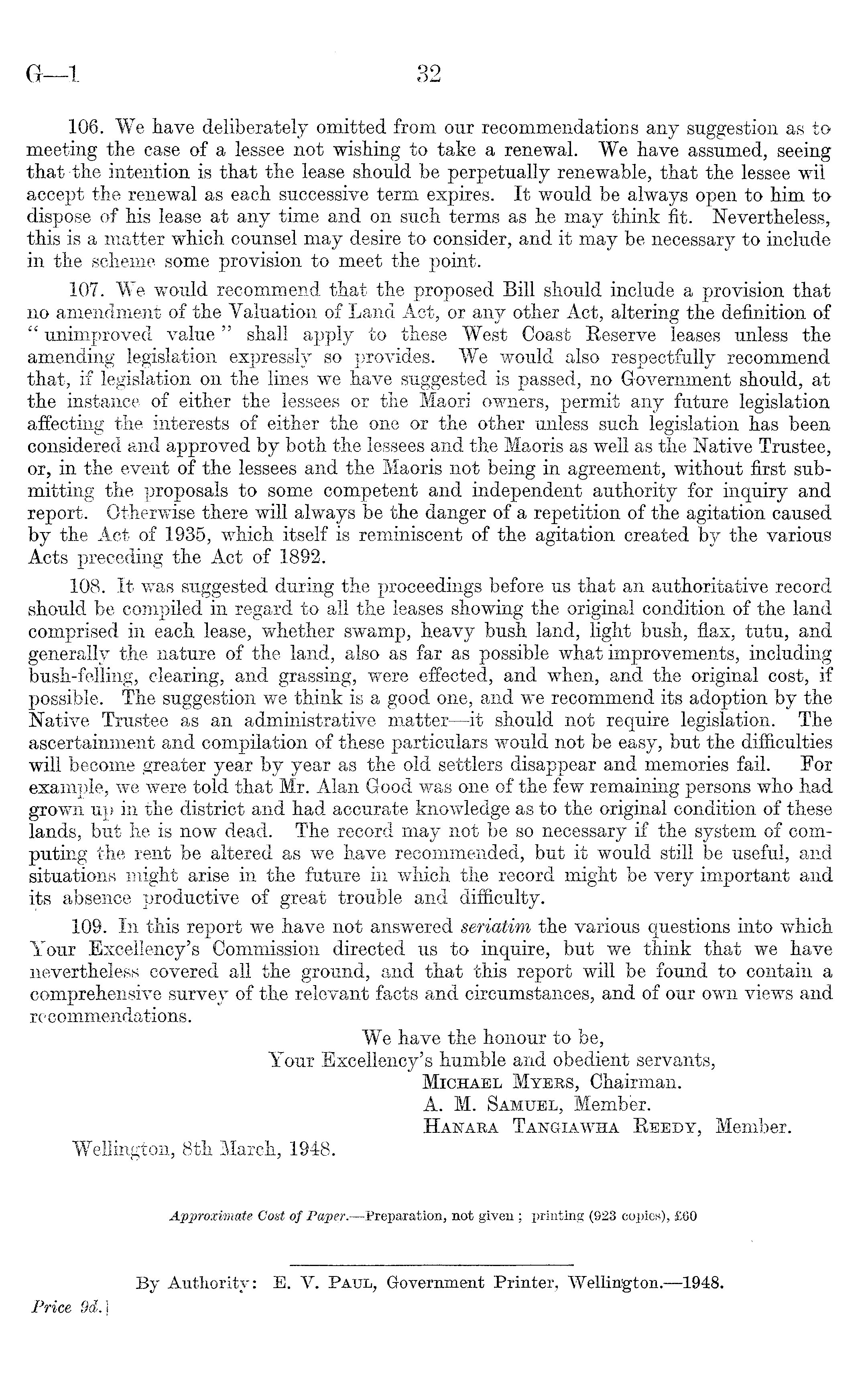 106. We have deliberately omitted from our recommendations any suggestion as to meeting the case of a lessee not wishing to take a renewal. We have assumed, seeing that the intention is that the lease should be perpetually renewable, that the lessee wil accept the renewal as each successive term expires. It would be always open to him to dispose of his lease at any time and on such terms as he may think fit. Nevertheless, this is a matter which counsel may desire to consider, and it may be necessary to include in the scheme some provision to meet the point. 107. We would recommend that the proposed Bill should include a provision that no amendment of the Valuation of Land Act, or any other Act, altering the definition of " unimproved value" shall apply to these West Coast Reserve leases unless the amending legislation expressly so provides. We would also respectfully recommend that, if legislation on the lines we have suggested is passed, no Government should, at the instance of either the lessees or the Maori owners, permit any future legislation affecting the interests of either the one or the other unless such legislation has been considered and approved by both the lessees and the Maoris as well as the Native Trustee, or, in the event of the lessees and the Maoris not being in agreement, without first submitting the proposals to some competent and independent authority for inquiry and report. Otherwise there will always be the danger of a repetition of the agitation caused by the Act of 1935, which itself is reminiscent of the agitation created by the various Acts preceding the Act of 1892. 108. It was suggested during the proceedings before us that an authoritative record should be compiled in regard to all the leases showing the original condition of the land comprised in each lease, whether swamp, heavy bush land, light bush, flax, tutu, and generally the nature of the land, also as far as possible what improvements, including bush-felling, clearing, and grassing, were effected, and when, and the original cost, if possible. The suggestion we think is a good one, and we recommend its adoption by the Native Trustee as an administrative matter —it should not require legislation. The ascertainment and compilation of these particulars would not be easy, but the difficulties will become greater year by year as the old settlers disappear and memories fail. For example, we were told that Mr. Alan Good was one of the few remaining persons who had grown up in the district and had accurate knowledge as to the original condition of these lands, but he is now dead. The record may not be so necessary if the system of computing the rent be altered as we have recommended, but it would still be useful, and situations might arise in the future in which the record might be very important and its absence productive of great trouble and difficulty. 109. In this report we have not answered seriatim the various questions into which Your Excellency's Commission directed us to inquire, but we think that we have nevertheless covered all the ground, and that this report will be found to contain a comprehensive survey of the relevant facts and circumstances, and of our own views and recommendations. We have the honour to be, Your Excellency's humble and obedient servants, Michael Myers, Chairman. A. M. Samuel, Member. Hanara Tangiawha Reedy, Member. Wellington, Bth March, 1948. Approximate Cost of Paper.—Preparation, not given ; printing (923 copies), £6O By Authority: E. Y. Paul, Government Printer, Wellington. —1948. Price 9d.]