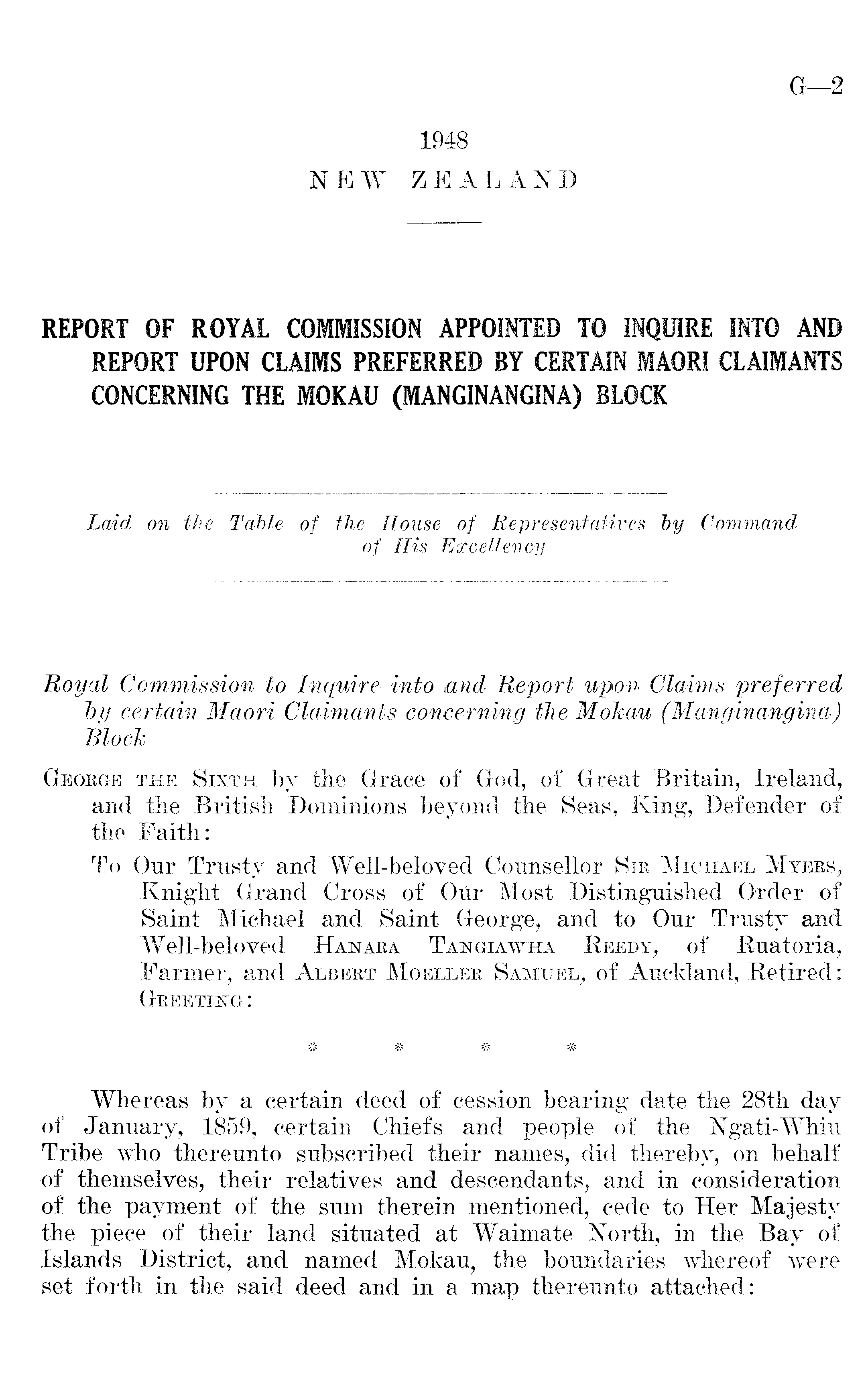 Royal Commission to Inquire into and Report upon Claims preferred by certain Maori Claimants concerning the Mohau (Manginangina) Block George the Sixth by the Grace of God, of Great Britain, Ireland, and the British Dominions beyond the Seas, King, Defender of the Faith: To Our Trusty and Well-beloved Counsellor Sir Michael Myers, Knight Grand Cross of Our Most Distinguished Order of Saint Michael and Saint George, and to Our Trusty and Well-beloved Kanaka Tajstgiawha Reedy, of Ruatoria, Farmer, and Albert Moeller Samuel, of Auckland, Retired: Greeting : Whereas by a certain deed of cession bearing date the 28th day of January, 1859, certain Chiefs and people of the Ngati-Whiu Tribe who thereunto subscribed their names, did thereby, on behalf of themselves, their relatives and descendants, and in consideration of the payment of the sum therein mentioned, cede to Her Majesty the piece of their land situated at Waimate North, in the Bay of Islands District, and named Mokau, the boundaries whereof were set forth in the said deed and in a map thereunto attached: