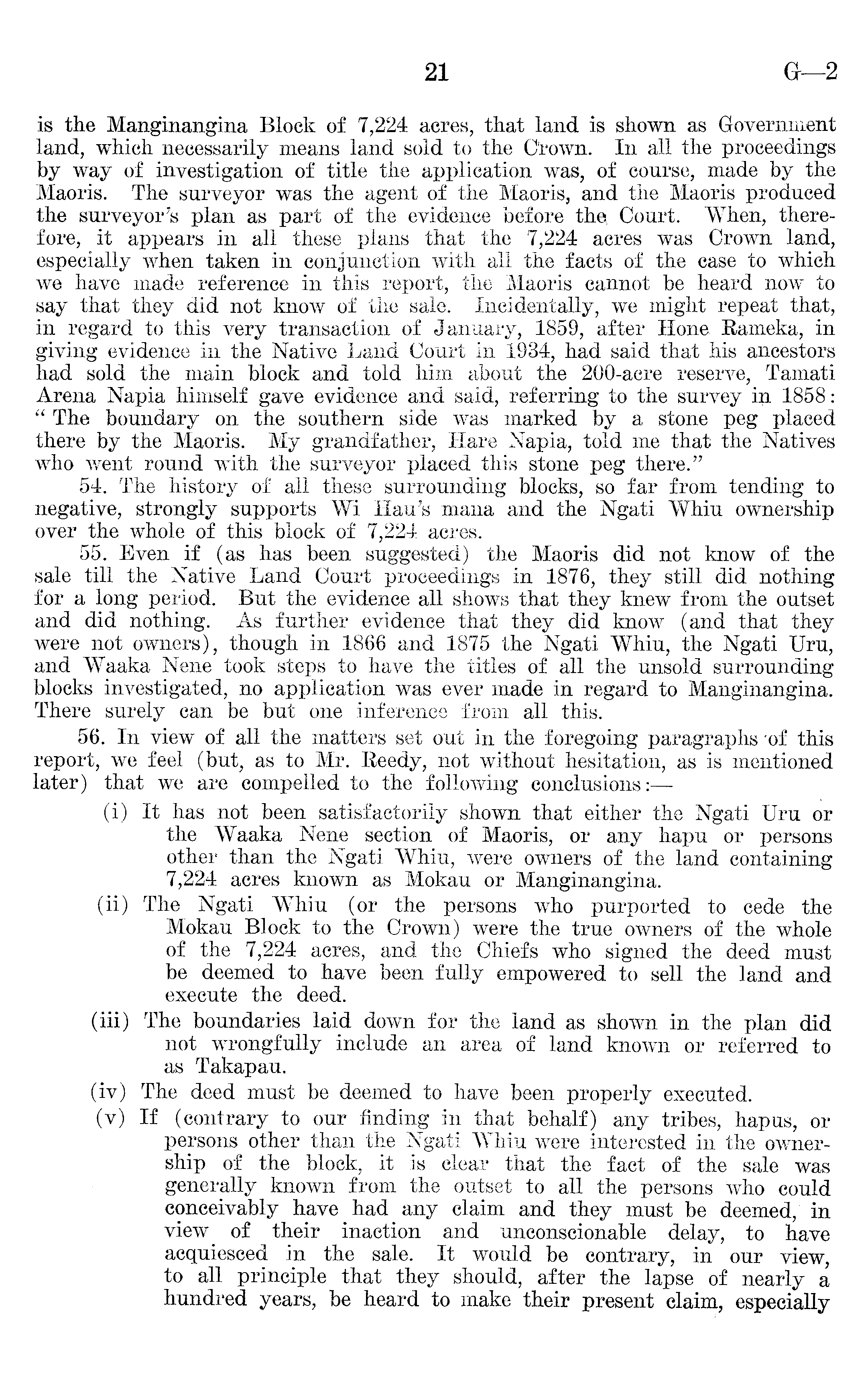 is the Manginangina Block of 7,224 acres, that land is shown as Government land, which necessarily means land sold to the Crown. In all the proceedings by way of investigation of title the application was, of course, made by the Maoris. The surveyor was the agent of the Maoris, and the Maoris produced the surveyor's plan as part of the evidence before the Court. When, therefore, it appears in all these plans that the 7,224 acres was Crown land, especially when taken in conjunction with all the facts of the case to which we have made reference in this report, the Maoris cannot be heard now to say that they did not know of the sale. Incidentally, we might repeat that, in regard to this very transaction of January, 1859, after Hone Rameka, in giving evidence in the Native Land Court in 1934, had said that his ancestors had sold the main block and told him about the 200-acre reserve, Tamati Arena Napia himself gave evidence and said, referring to the survey in 1858: " The boundary on the southern side was marked by a stone peg placed there by the Maoris. My grandfather, Hare Napia, told me that the Natives who went round with the surveyor placed this stone peg there." 54. The history of all these surrounding blocks, so far from tending to negative, strongly supports Wi liau's mana and the Ngati Whiu ownership over the whole of this block of 7,224 acres. 55. Even if (as has been suggested) the Maoris did not know of the sale till the Native Land Court proceedings in 1876, they still did nothing for a long period. But the evidence all shows that they knew from the outset and did nothing. As further evidence that they did know (and that they were not owners), though in 1866 and 1875 the Ngati Whiu, the Ngati Uru, and Waaka Nene took steps to have the titles of all the unsold surrounding blocks investigated, no application was ever made in regard to Manginangina. There surely can be but one inference from all this. 56. In view of all the matters set out in the foregoing paragraphs -of this report, we feel (but, as to Mr. Reedy, not without hesitation, as is mentioned later) that we are compelled to the following conclusions:— (i) It has not been satisfactorily shown that either the Ngati Uru or the Waaka Nene section of Maoris, or any hapu or persons other than the Ngati Whiu, were owners of the land containing 7,224 acres known as Mokau or Manginangina. (ii) The Ngati Whiu (or the persons who purported to cede the Mokau Block to the Crown) were the true owners of the whole of the 7,224 acres, and the Chiefs who signed the deed must be deemed to have been fully empowered to sell the land and execute the deed. (iii) The boundaries laid down for the land as shown in the plan did not wrongfully include an area of land known or referred to as Takapau. (iv) The deed must be deemed to have been properly executed. (v) If (contrary to our finding in that behalf) any tribes, hap us, or persons other than the Ngati Whiu were interested in the ownership of the block, it is clear that the fact of the sale was generally known from the outset to all the persons Who could conceivably have had any claim and they must be deemed, in view of their inaction and unconscionable delay, to have acquiesced in the sale. It would be contrary, in our view, to all principle that they should, after the lapse of nearly a hundred years, be heard to make their present claim, especially