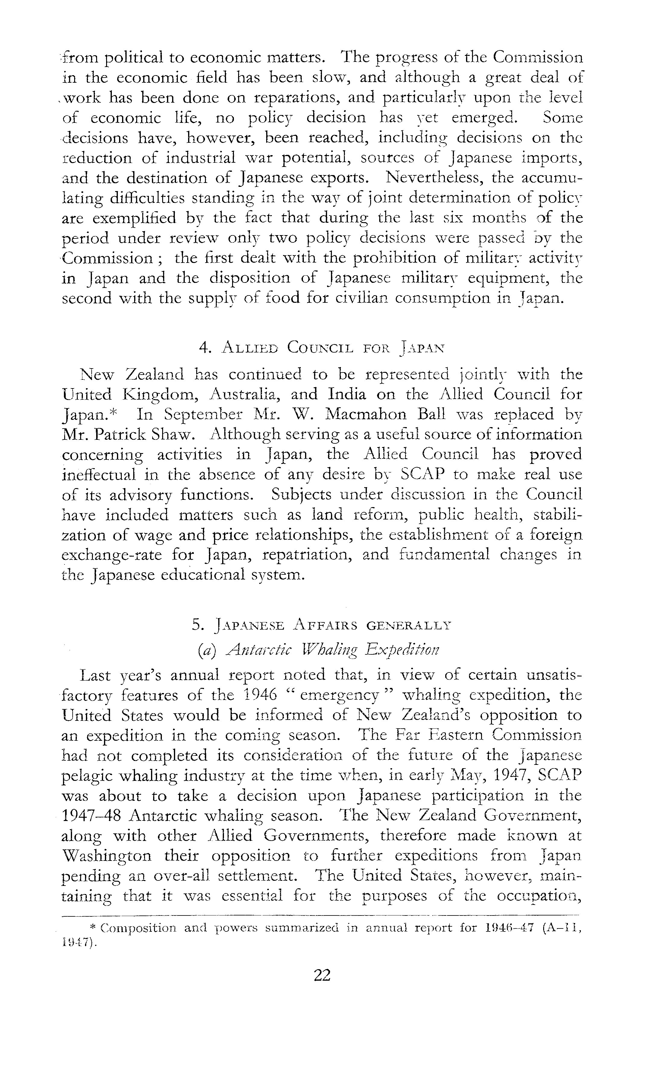 from political to economic matters. The progress of the Commission in the economic field has been slow, and although a great deal of .work has been done on reparations, and particularly upon the level of economic life, no policy decision has yet emerged. Some decisions have, however, been reached, including decisions on the reduction of industrial war potential, sources of Japanese imports, and the destination of Japanese exports. Nevertheless, the accumulating difficulties standing in the way of joint determination of policy are exemplified by the fact that during the last six months of the period under review only two policy decisions were passed by the Commission ; the first dealt with the prohibition of military activity in Japan and the disposition of Japanese military equipment, the second with the supply of food for civilian consumption in Japan. 4. Allied Council for Japan New Zealand has continued to be represented jointly with the United Kingdom, Australia, and India on the Allied Council for Japan.* In September Mr. W. Macmahon Ball was replaced by Mr. Patrick Shaw. Although serving as a useful source of information concerning activities in Japan, the Allied Council has proved ineffectual in the absence of any desire by SCAP to make real use of its advisory functions. Subjects under discussion in the Council have included matters such as land reform, public health, stabilisation of wage and price relationships, the establishment of a foreign exchange-rate for Japan, repatriation, and fundamental changes in the Japanese educational system. 5. Japanese Affairs generally (a) Antarctic Whaling Expedition Last year's annual report noted that, in view of certain unsatisfactory features of the 1946 " emergency " whaling expedition, the United States would be informed of New Zealand's opposition to an expedition in the coming season. The Far Eastern Commission had not completed its consideration of the future of the Japanese pelagic whaling industry at the time when, in early May, 1947, SCAP was about to take a decision upon Japanese participation in the 1947-48 Antarctic whaling season. The New Zealand Government, along with other Allied Governments, therefore made known at Washington their opposition to further expeditions from Japan pending an over-all settlement. The United States, however, maintaining that it was essential for the purposes of the occupation,